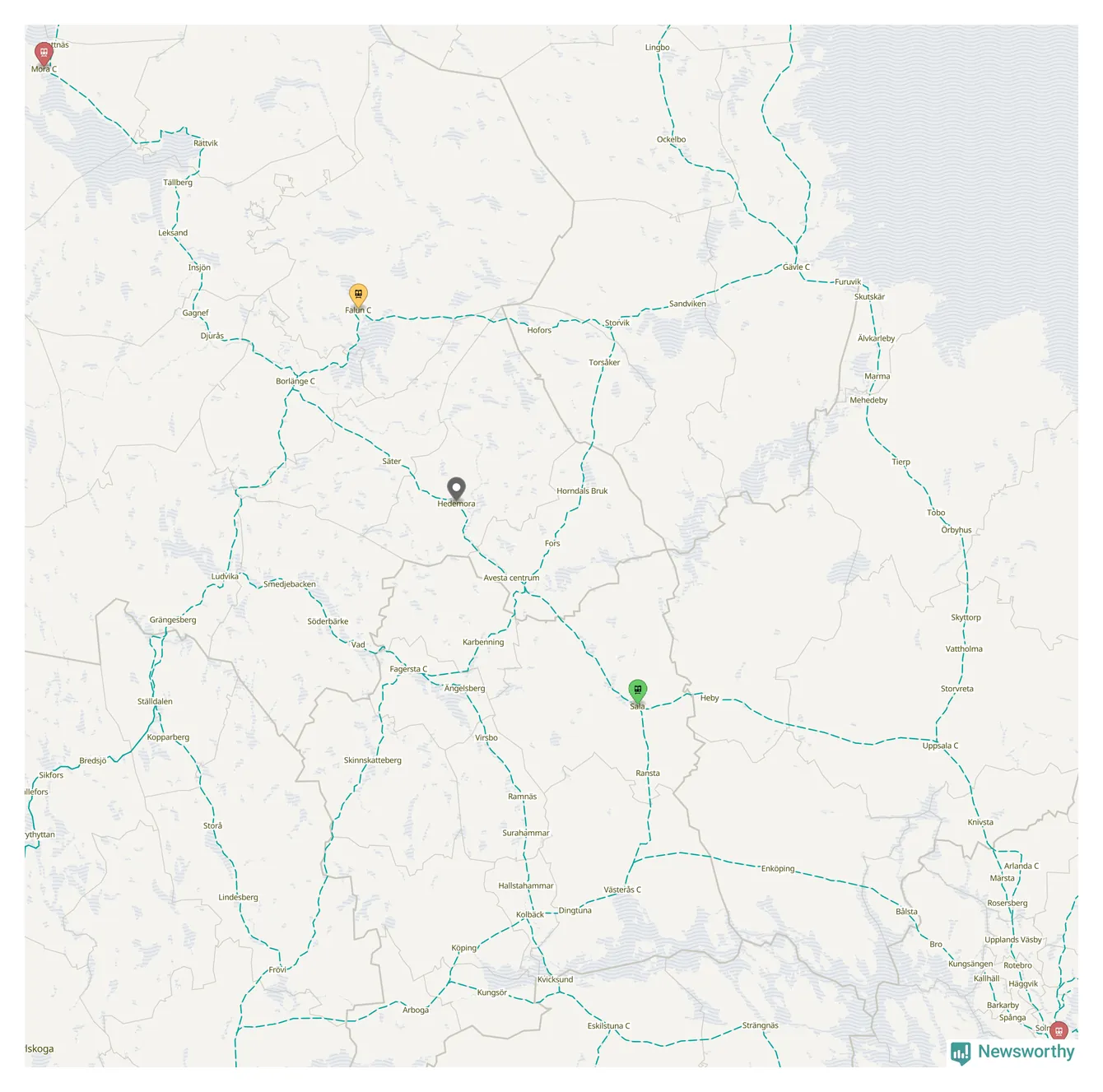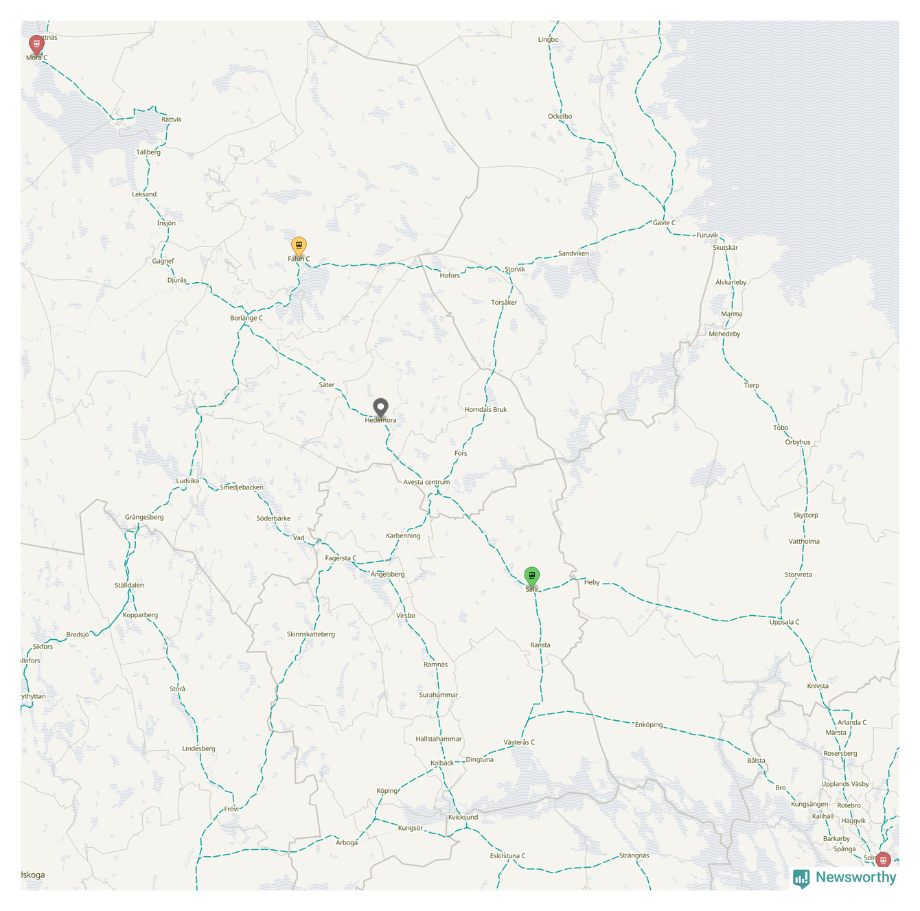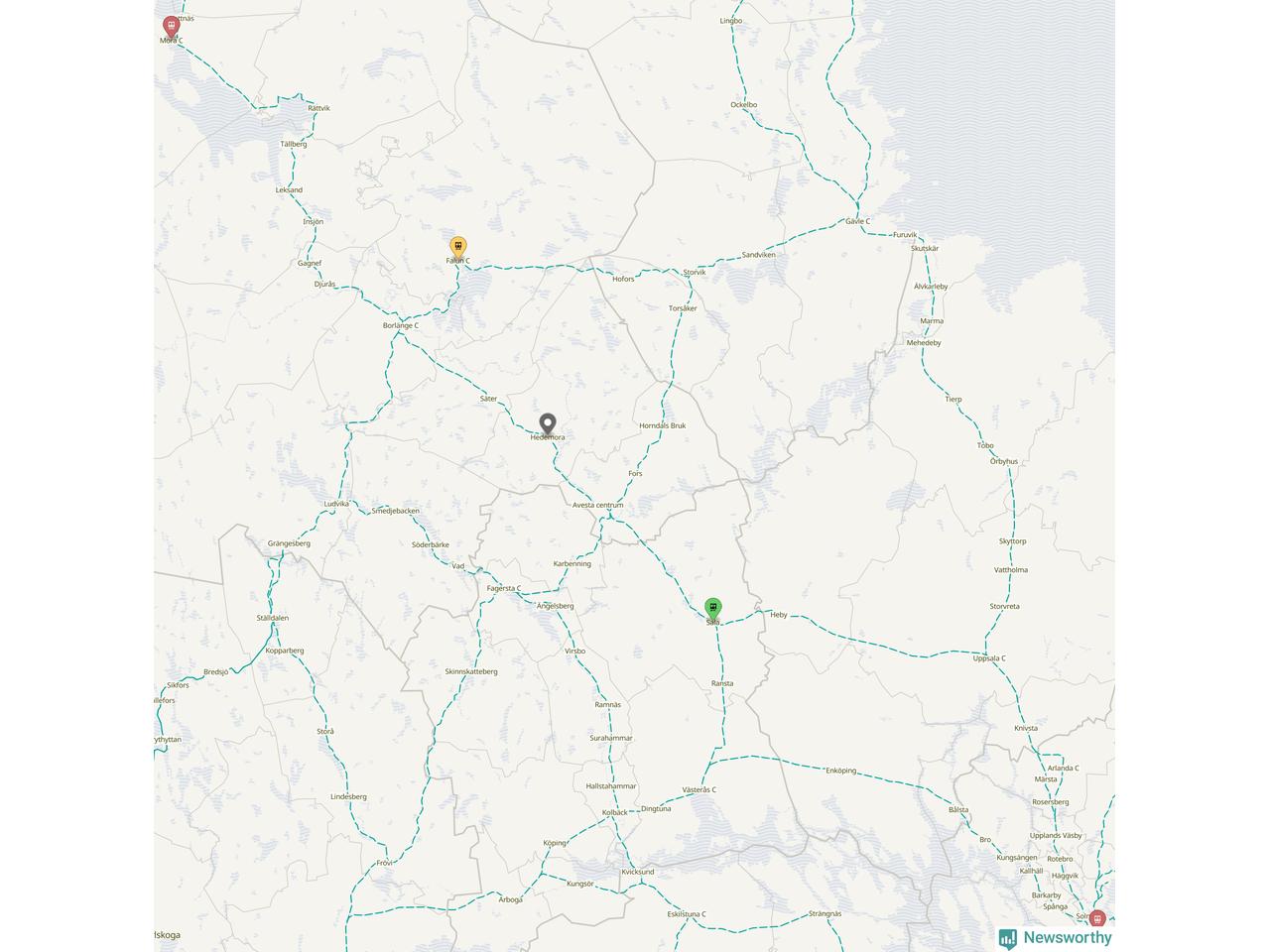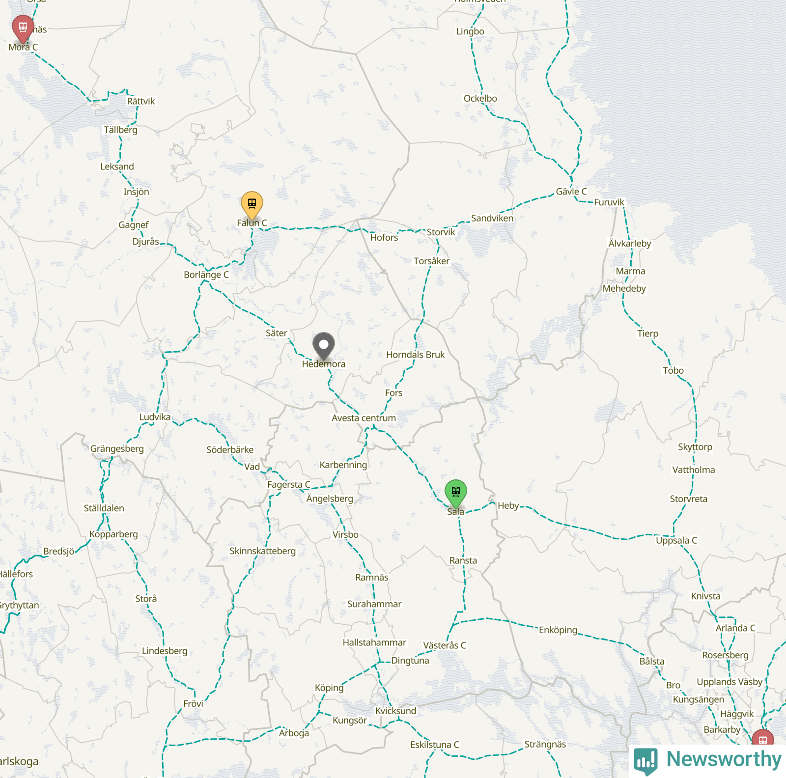 Kartdata från Mapbox, Newsworthy, OpenStreetMap och Trafikverket. Uppgifter om sträckor med passagerartrafik från jarnvag.net.