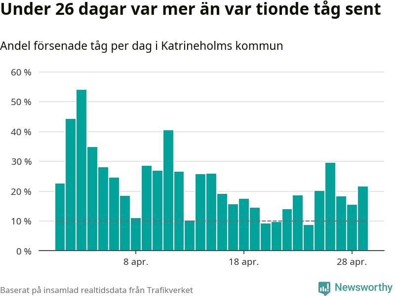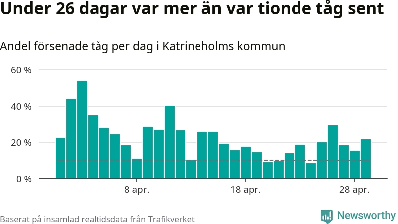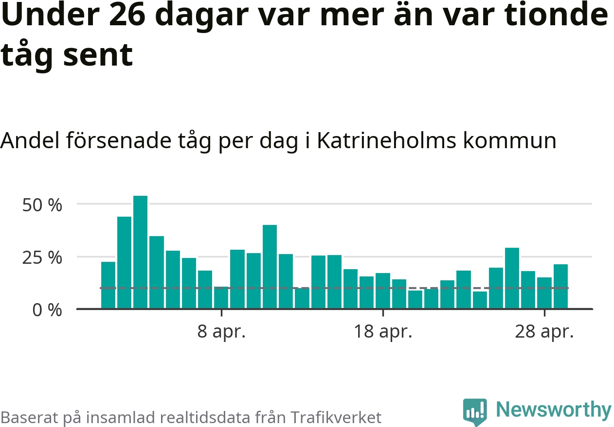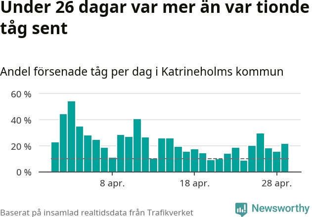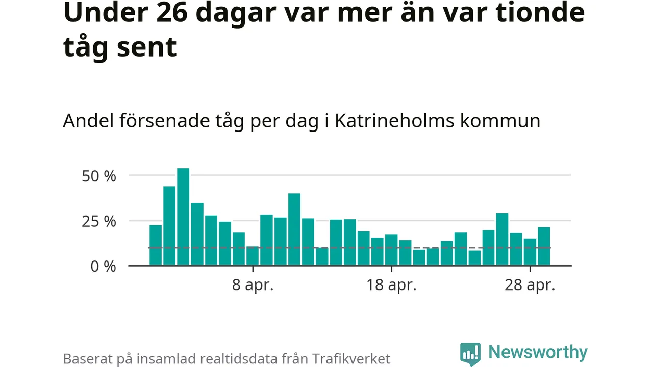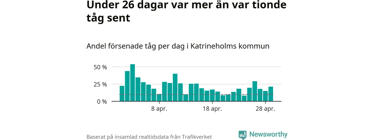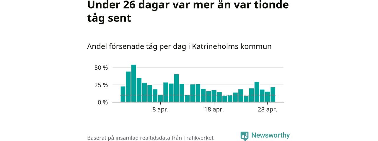 Under 26 av 30 dagar i april var mer än var tionde tåg vid Katrineholm C försenat. Det visar Newsworthys sammanställning av alla tågförseningar förra månaden.