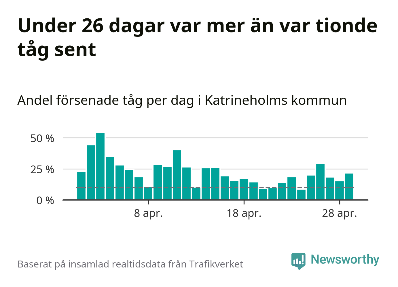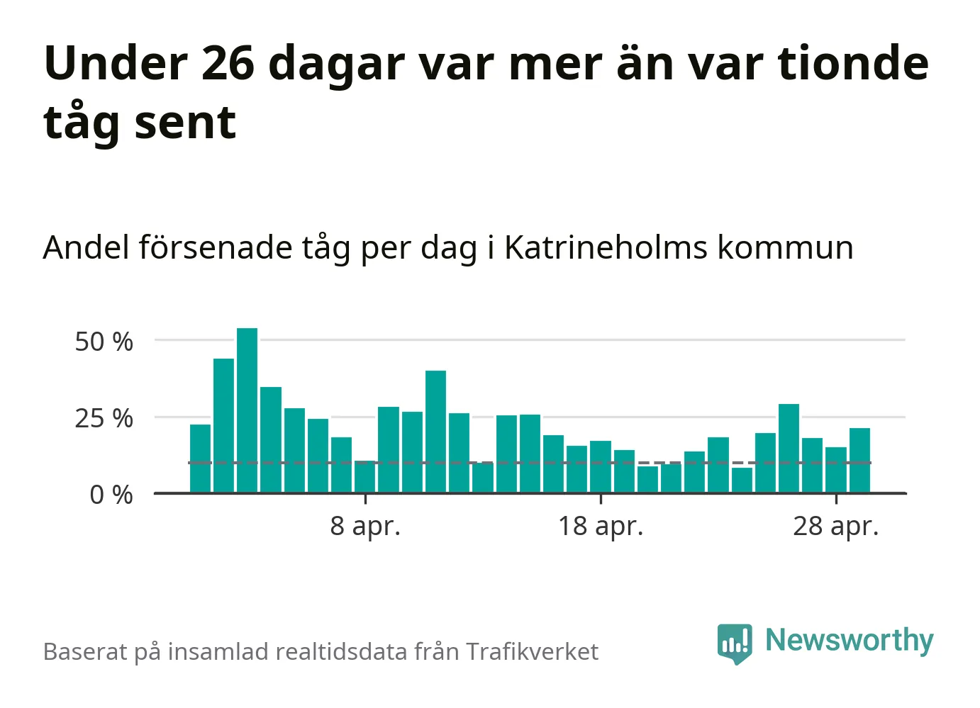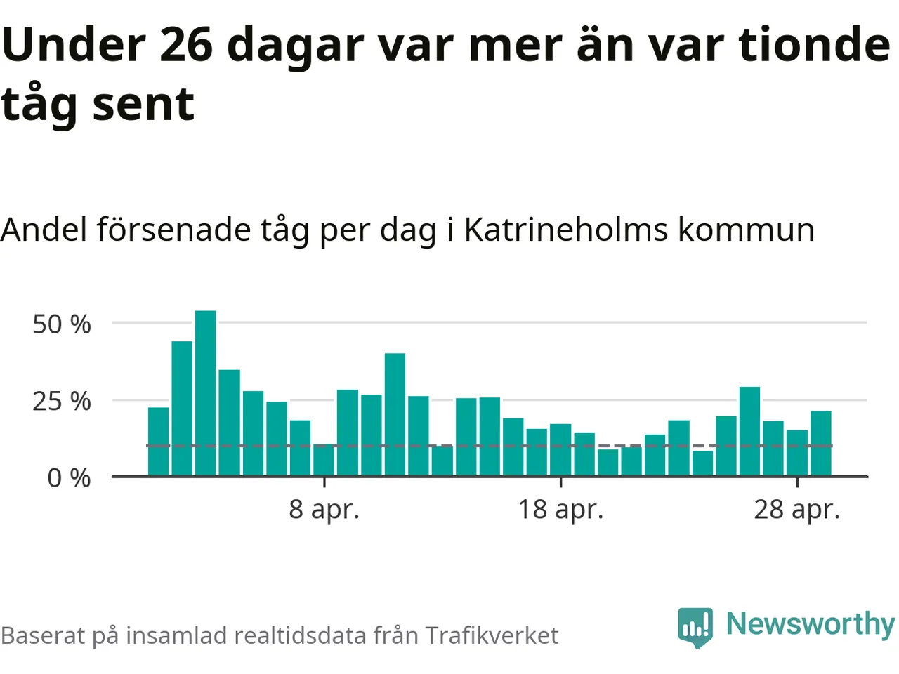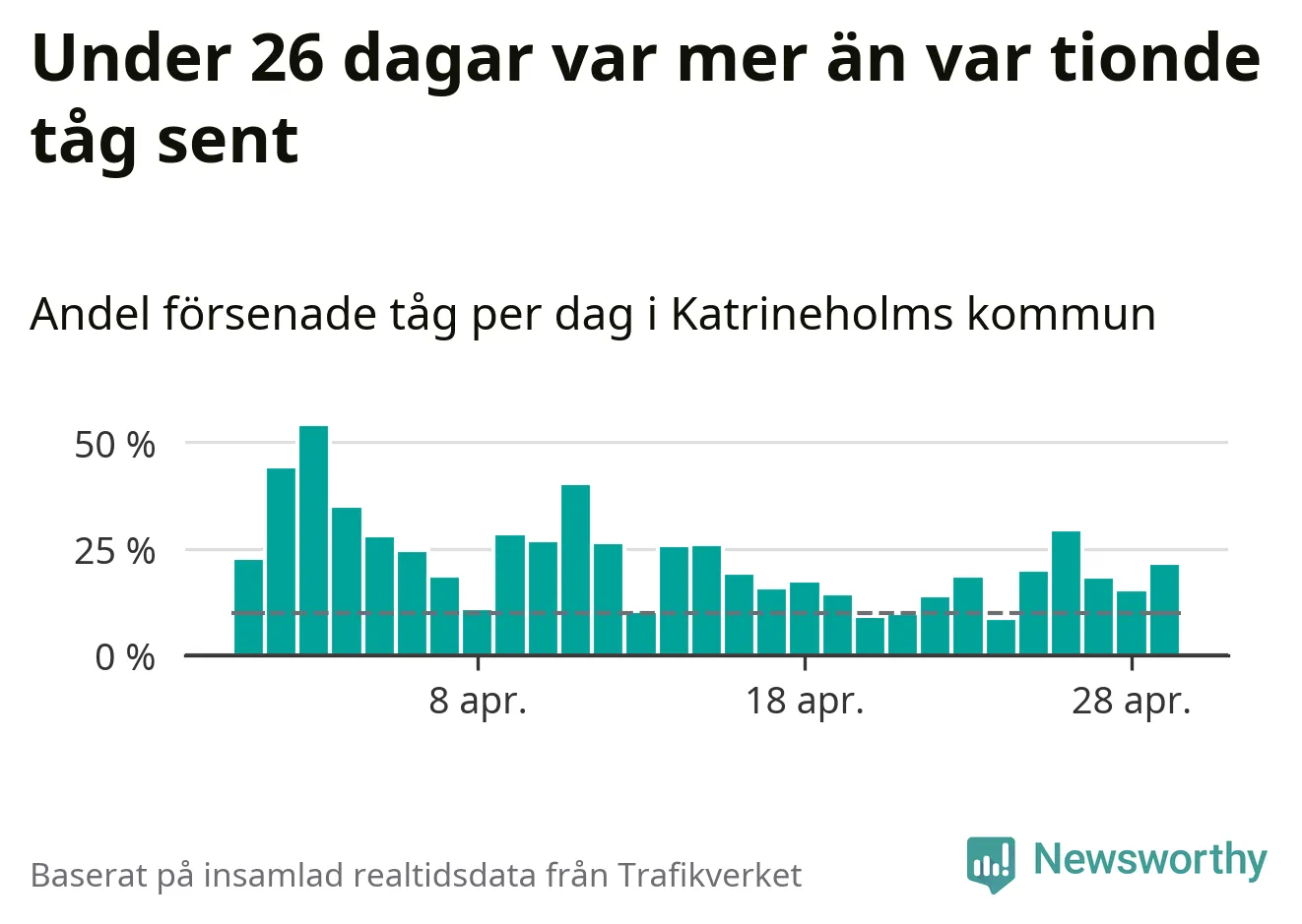 Under 26 av 30 dagar i april var mer än var tionde tåg vid Katrineholm C försenat. Det visar Newsworthys sammanställning av alla tågförseningar förra månaden.