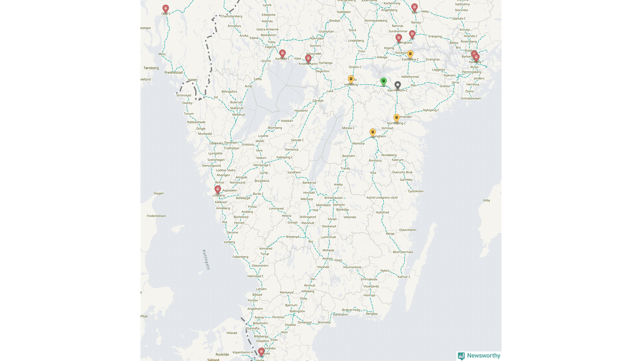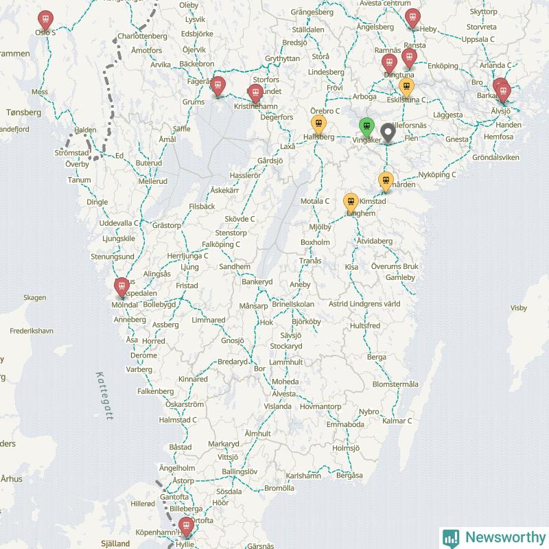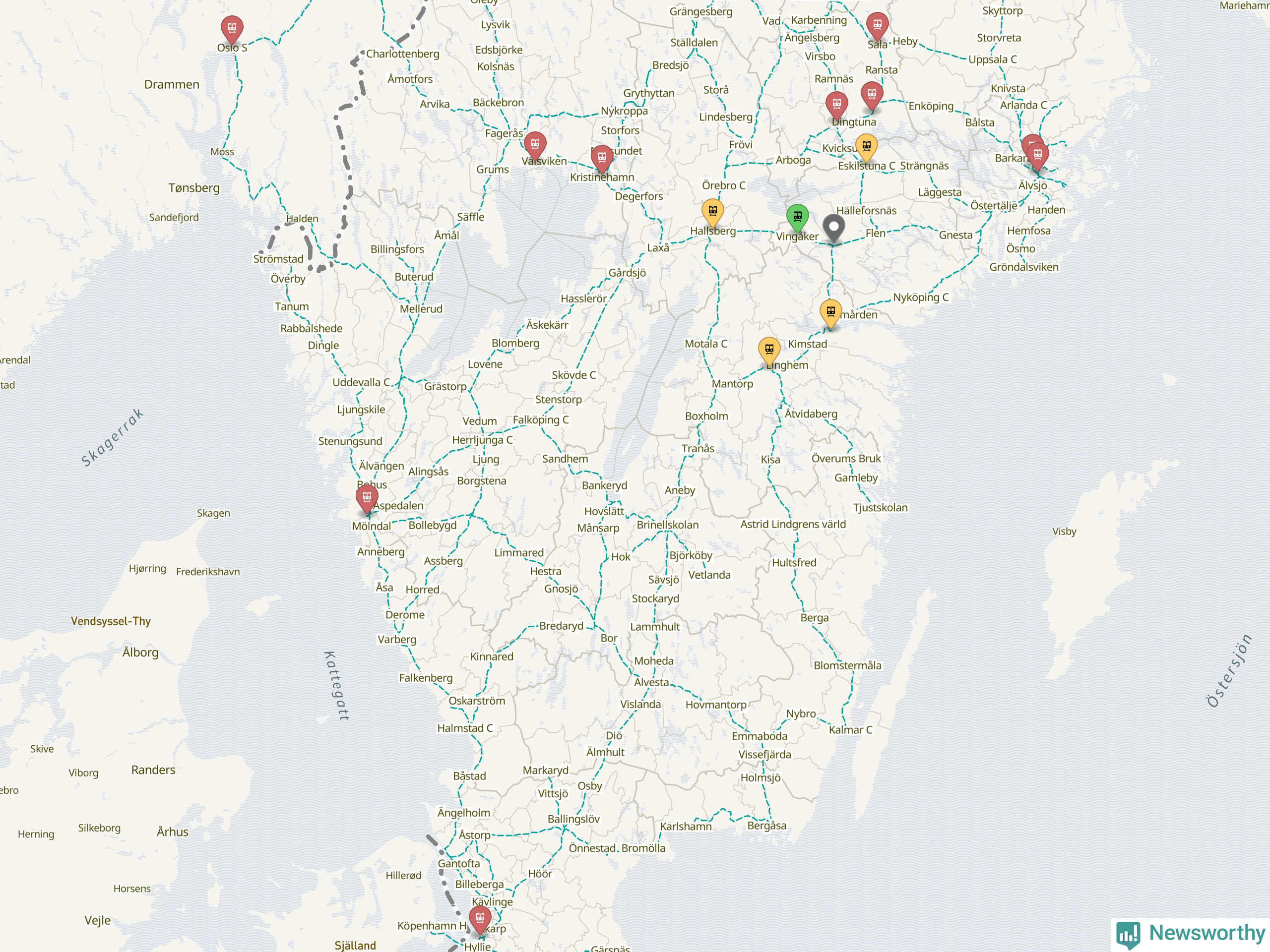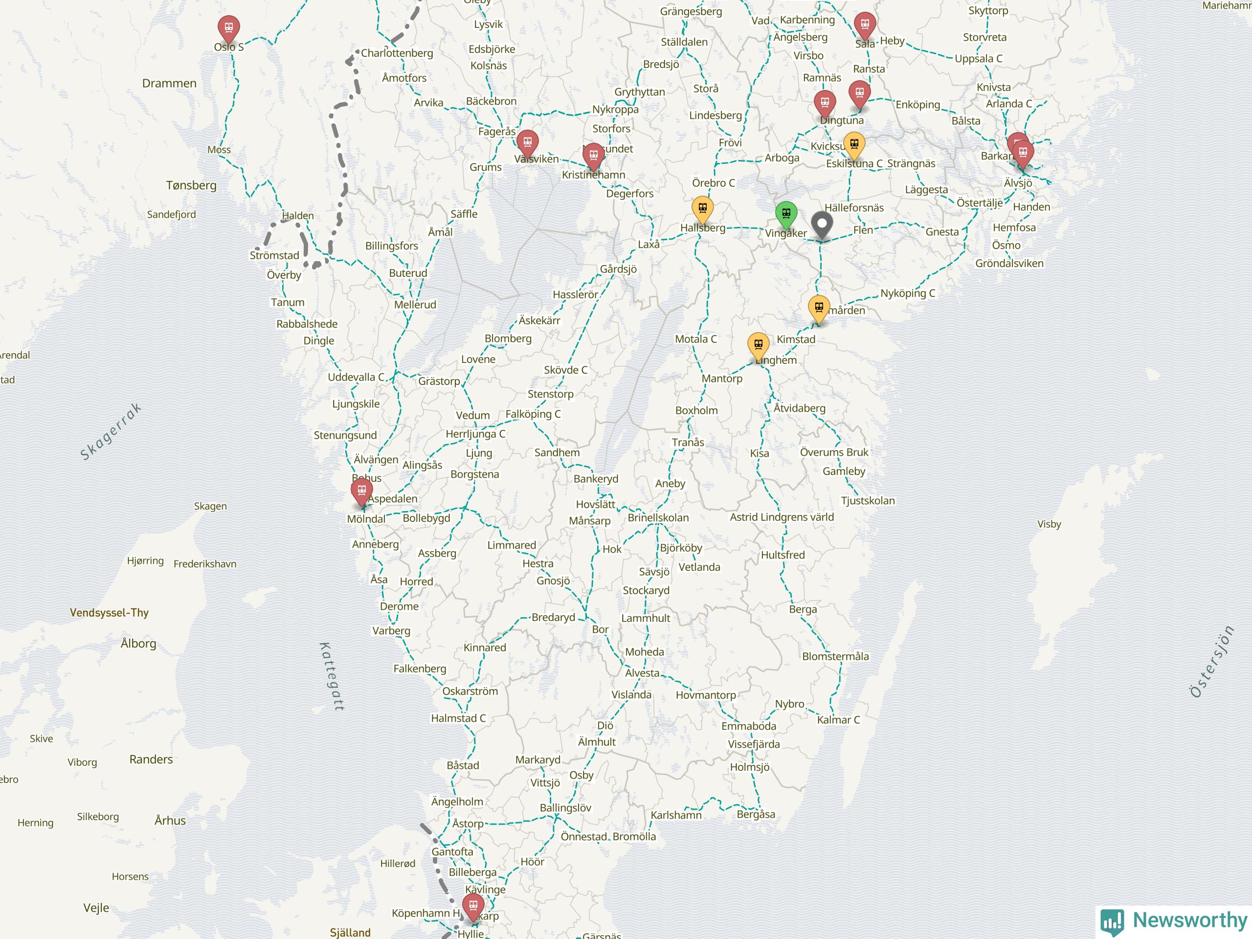 Kartdata från Mapbox, Newsworthy, OpenStreetMap och Trafikverket. Uppgifter om sträckor med passagerartrafik från jarnvag.net.