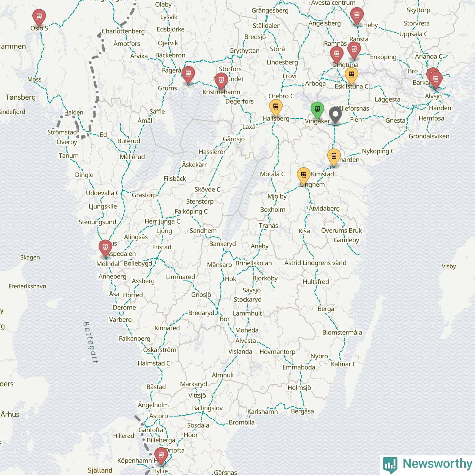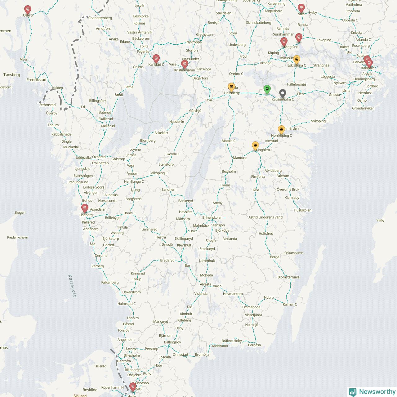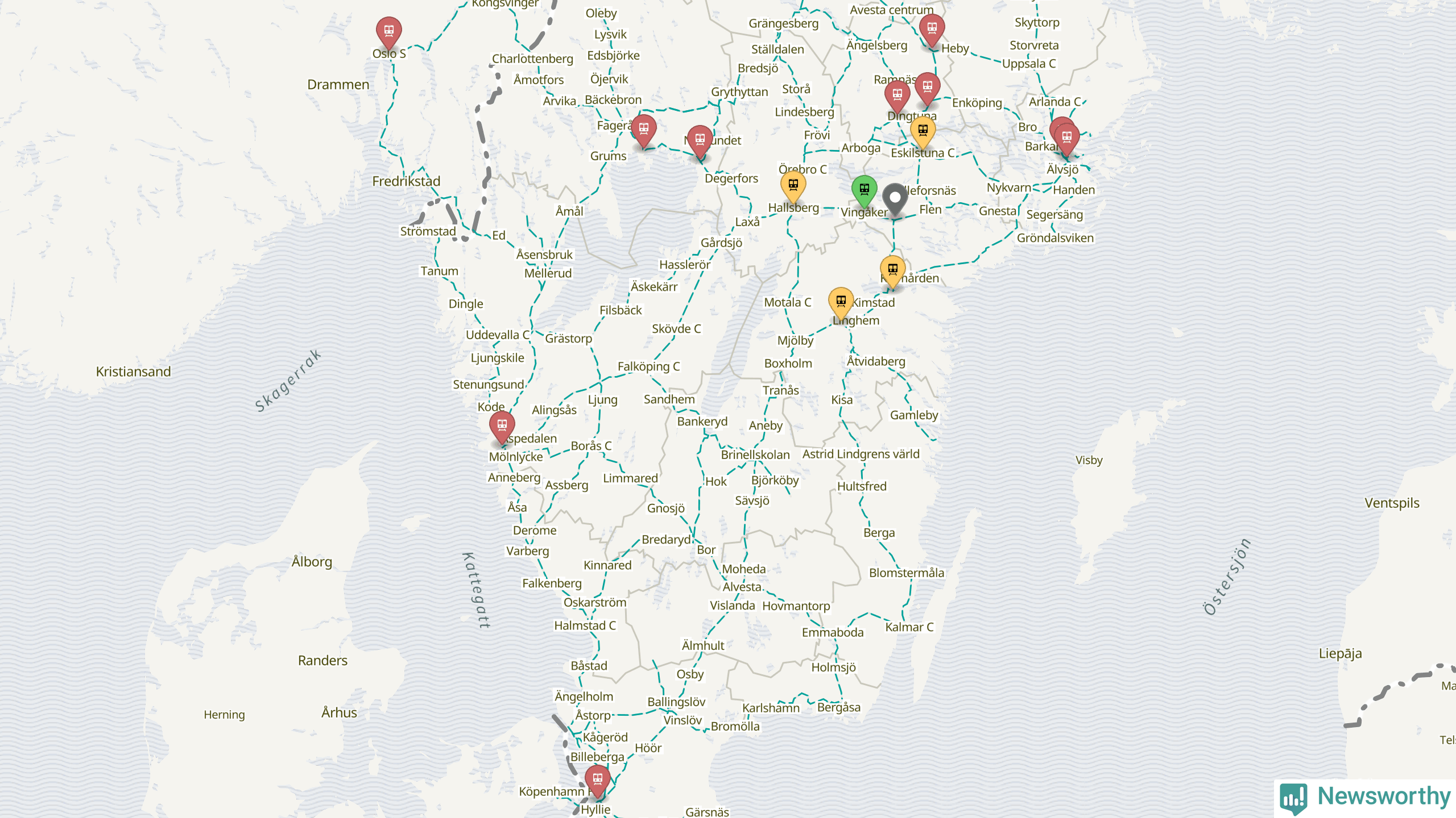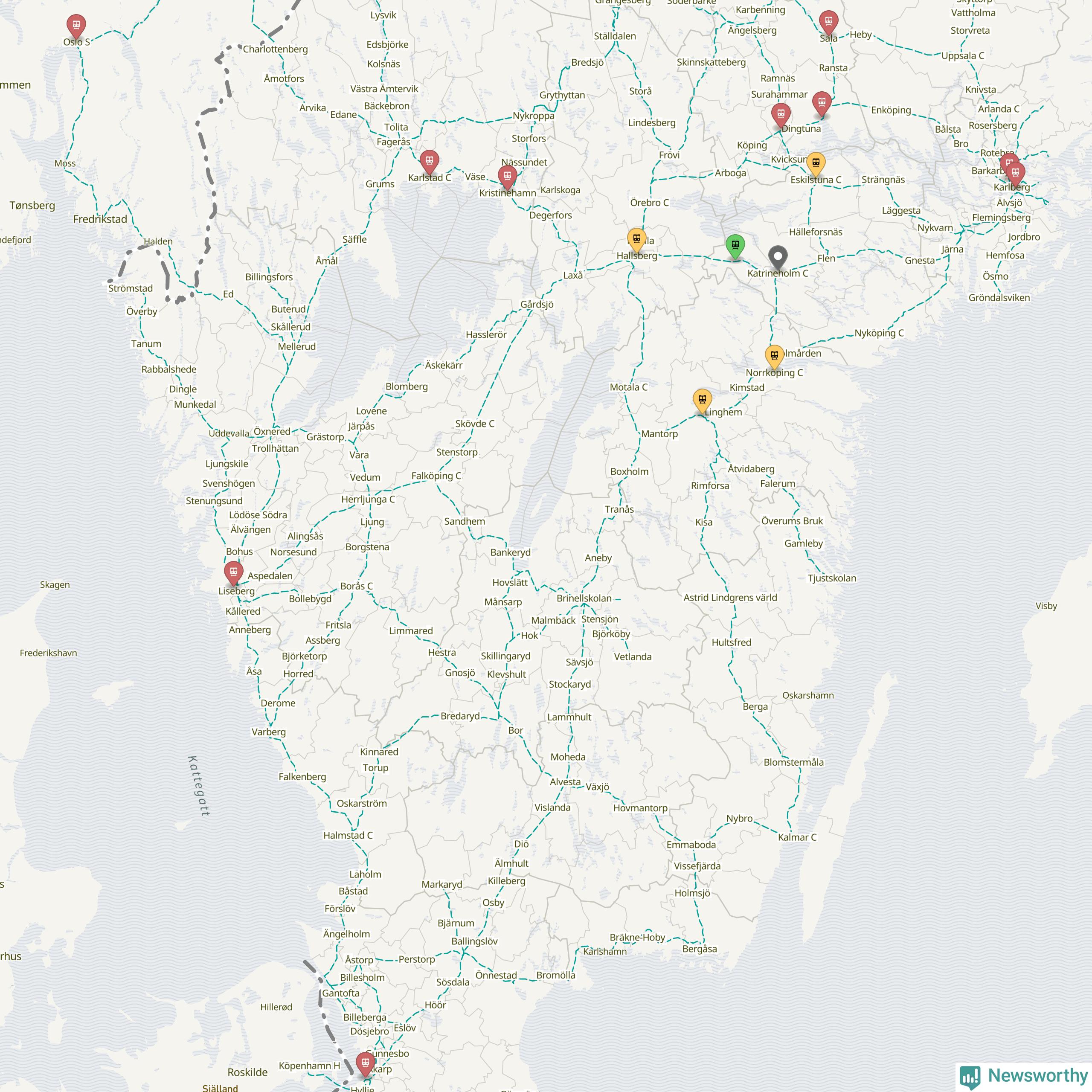 Kartdata från Mapbox, Newsworthy, OpenStreetMap och Trafikverket. Uppgifter om sträckor med passagerartrafik från jarnvag.net.