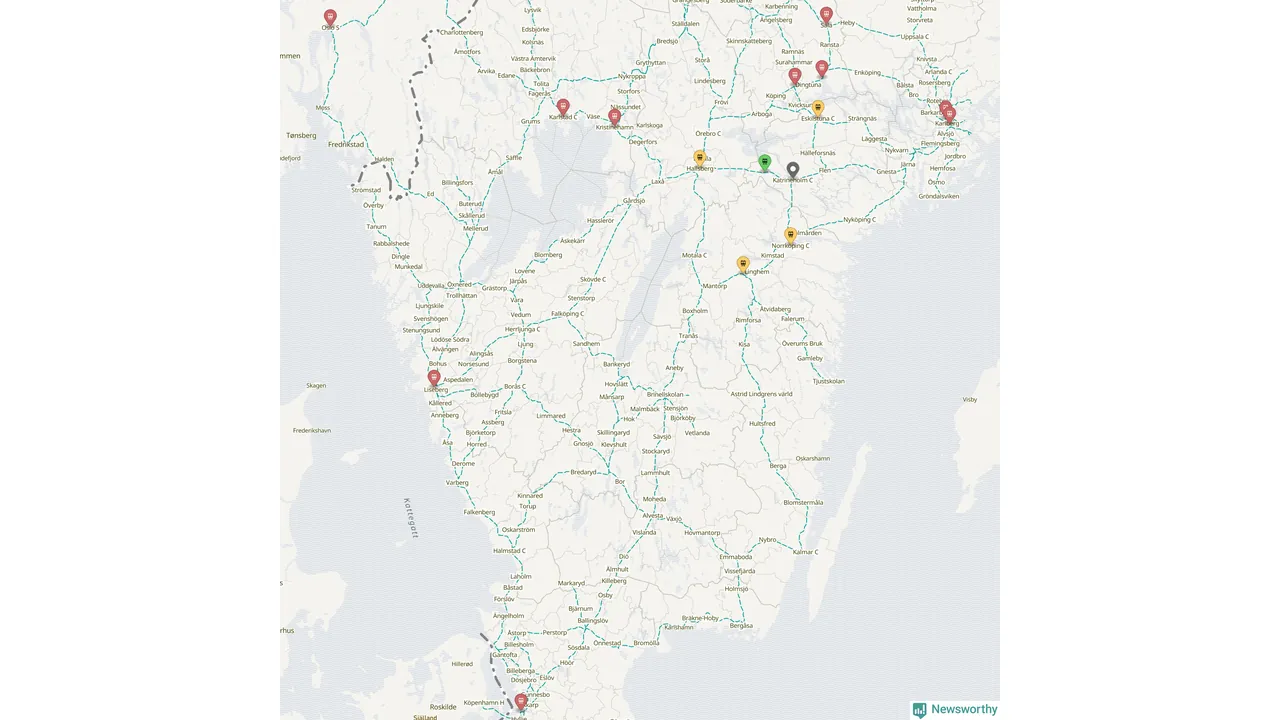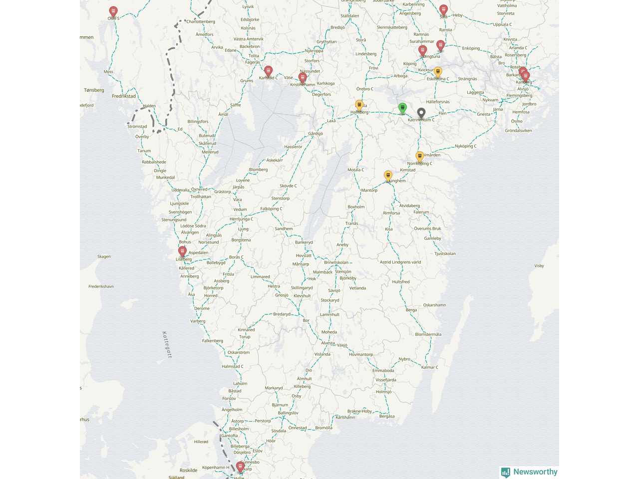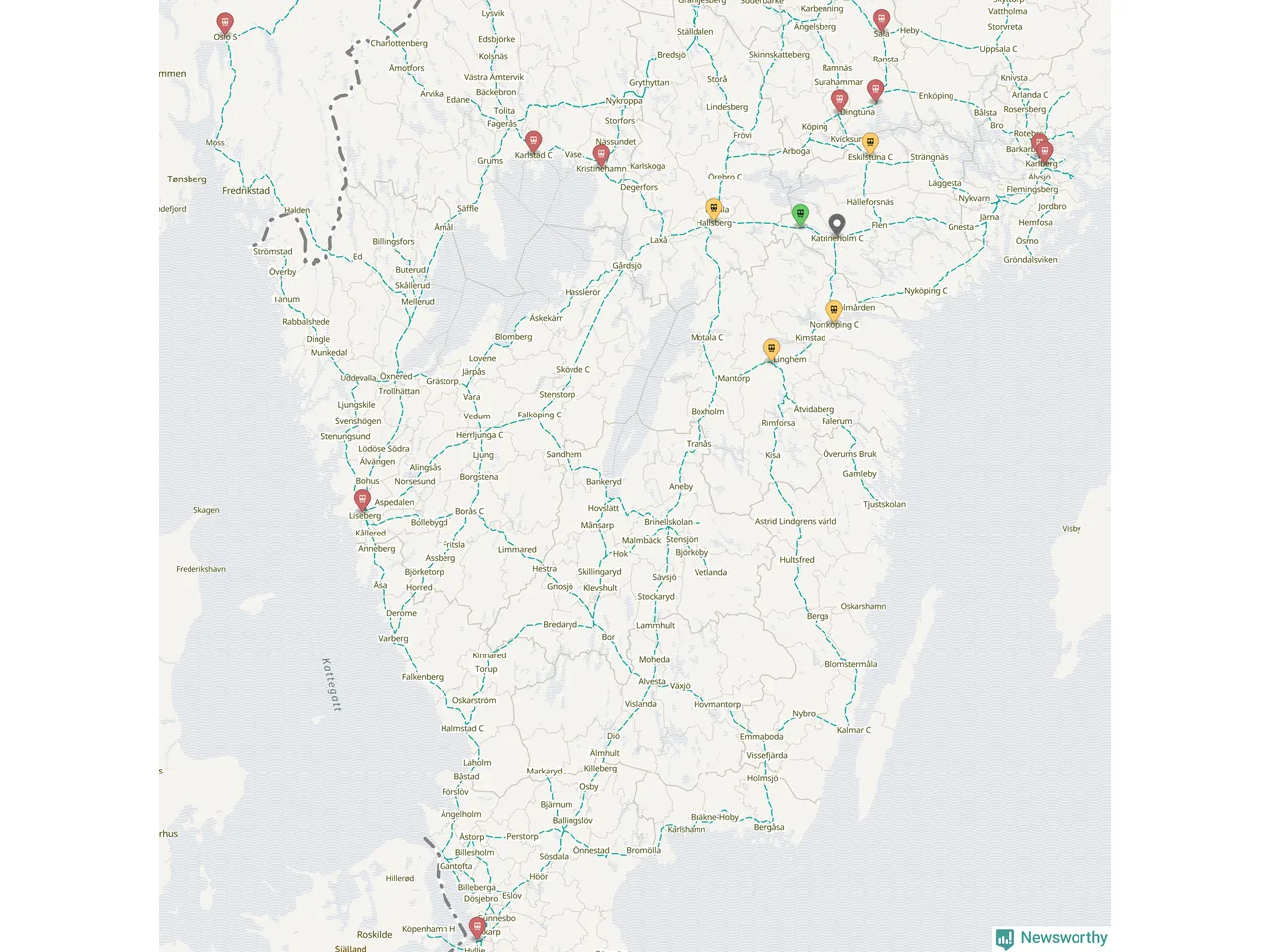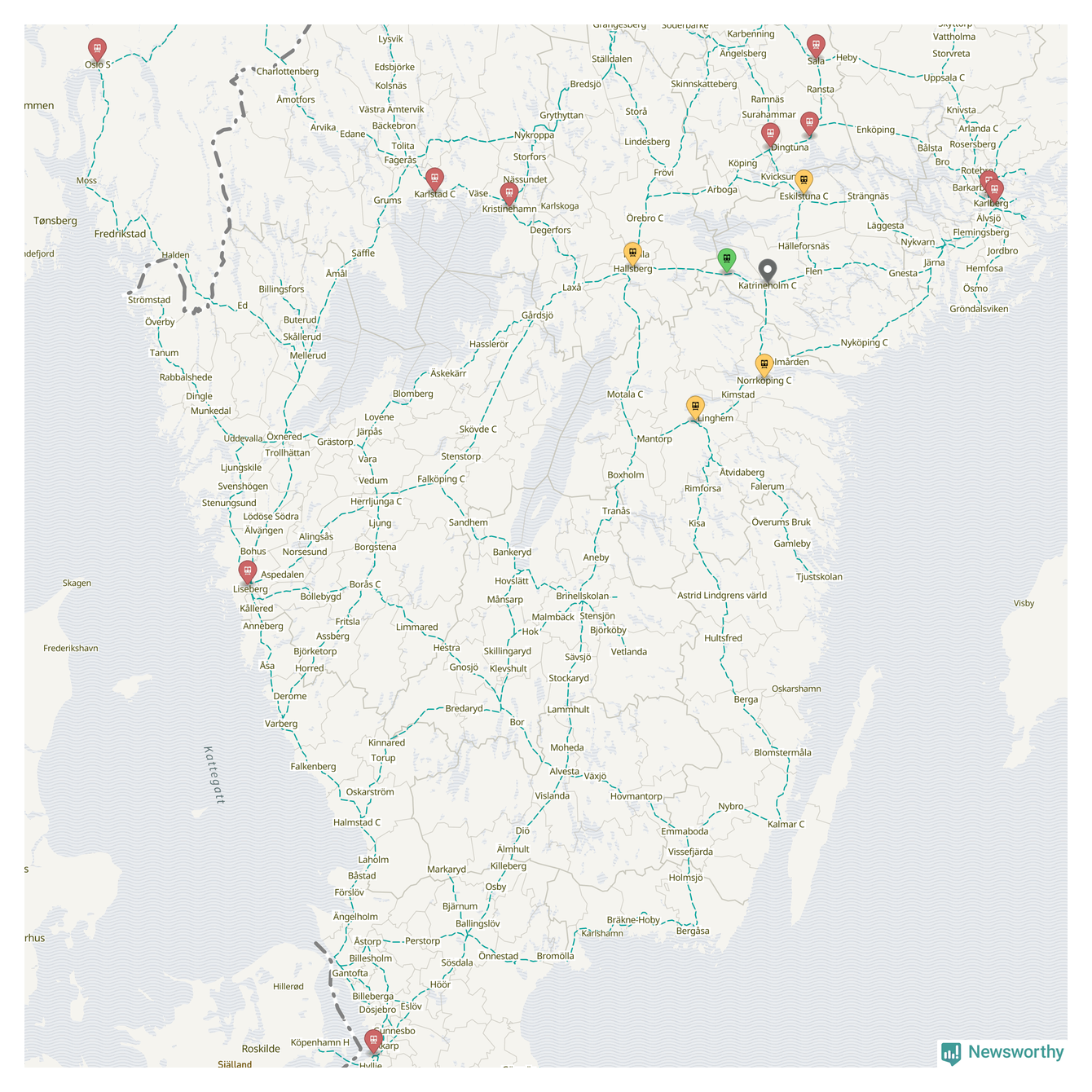 Kartdata från Mapbox, Newsworthy, OpenStreetMap och Trafikverket. Uppgifter om sträckor med passagerartrafik från jarnvag.net.
