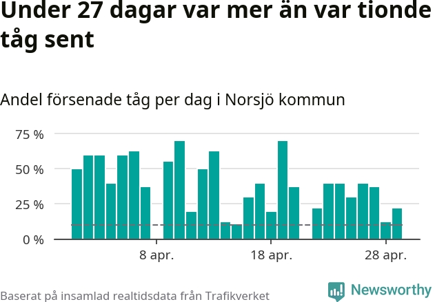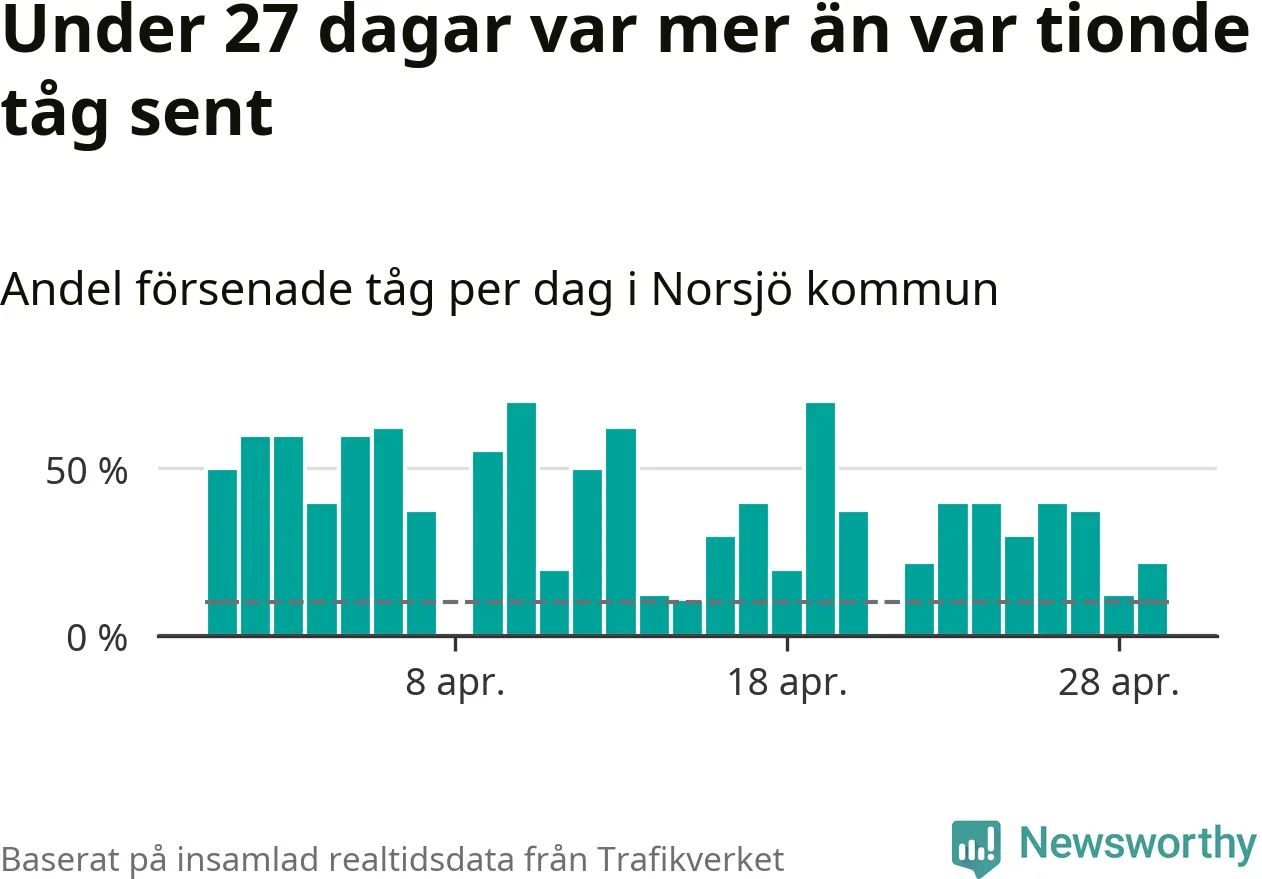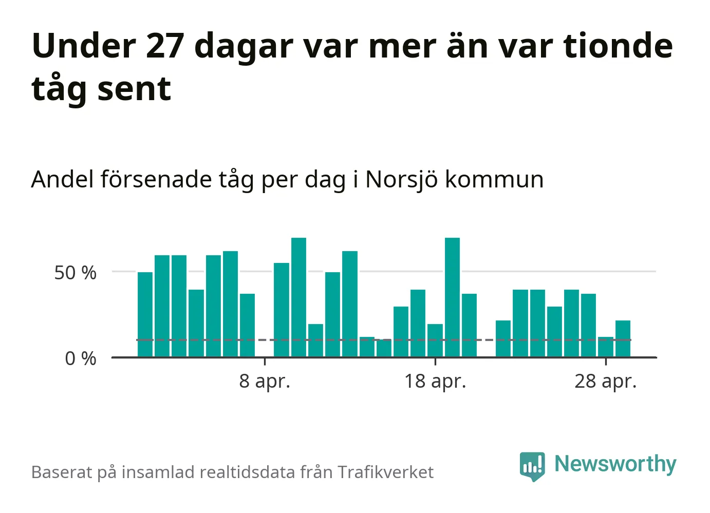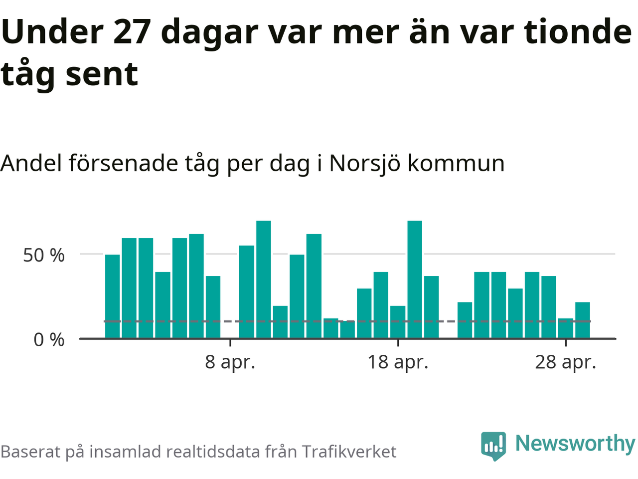 Under 27 av 30 dagar i april var mer än var tionde tåg vid Bastuträsk försenat. Det visar Newsworthys sammanställning av alla tågförseningar förra månaden.