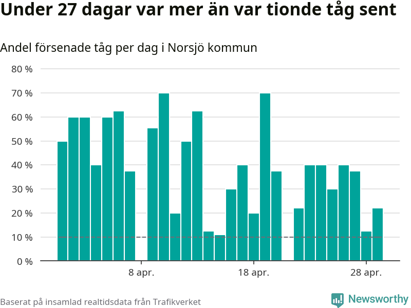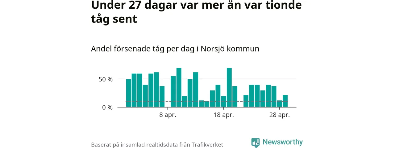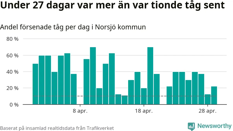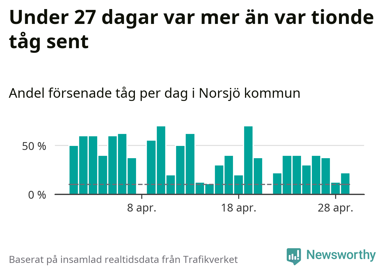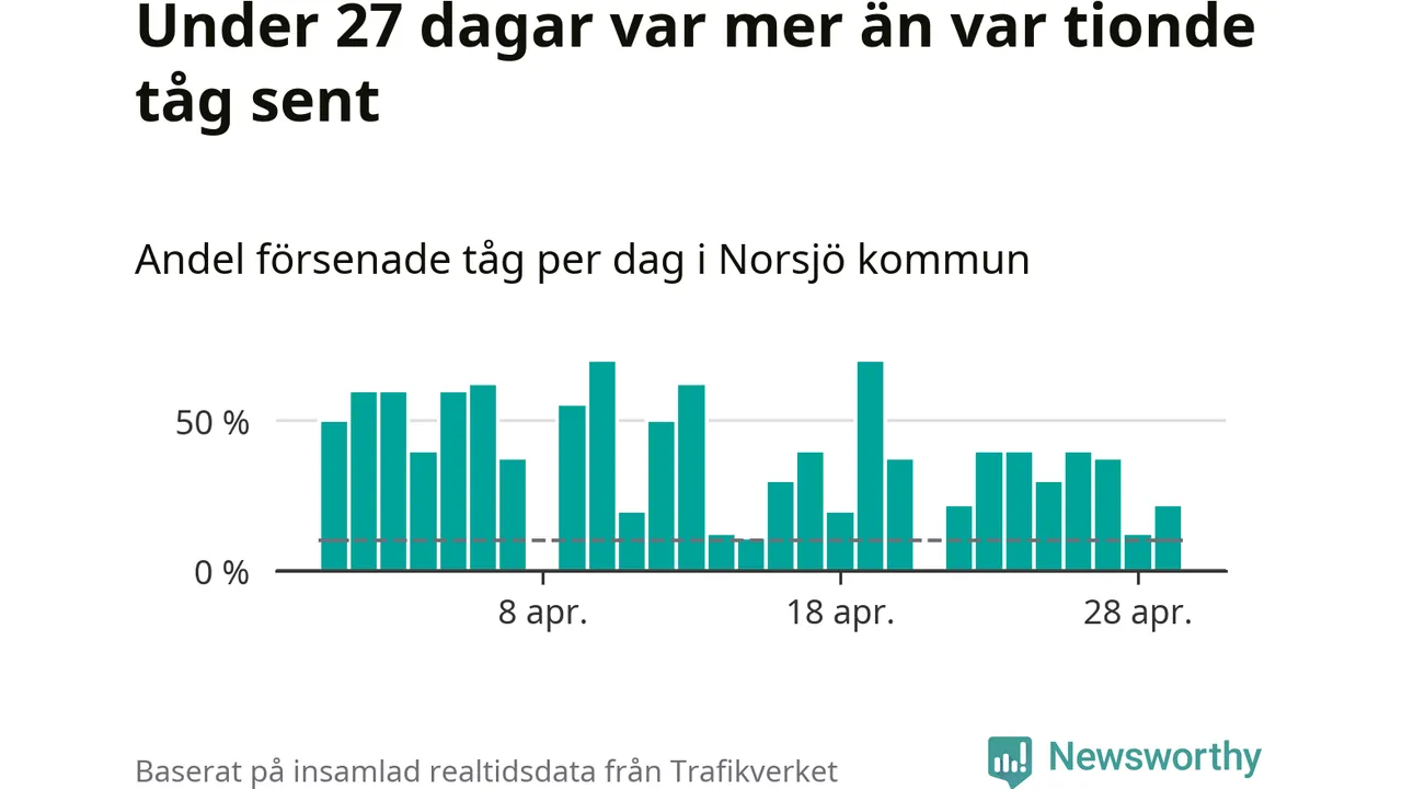 Under 27 av 30 dagar i april var mer än var tionde tåg vid Bastuträsk försenat. Det visar Newsworthys sammanställning av alla tågförseningar förra månaden.