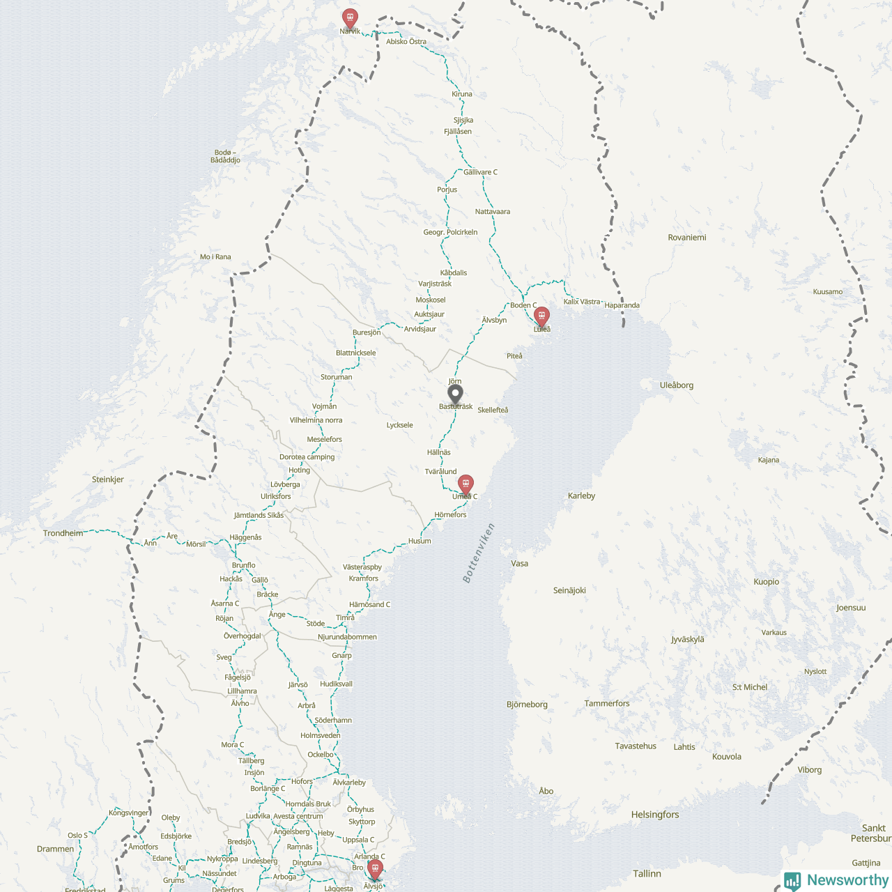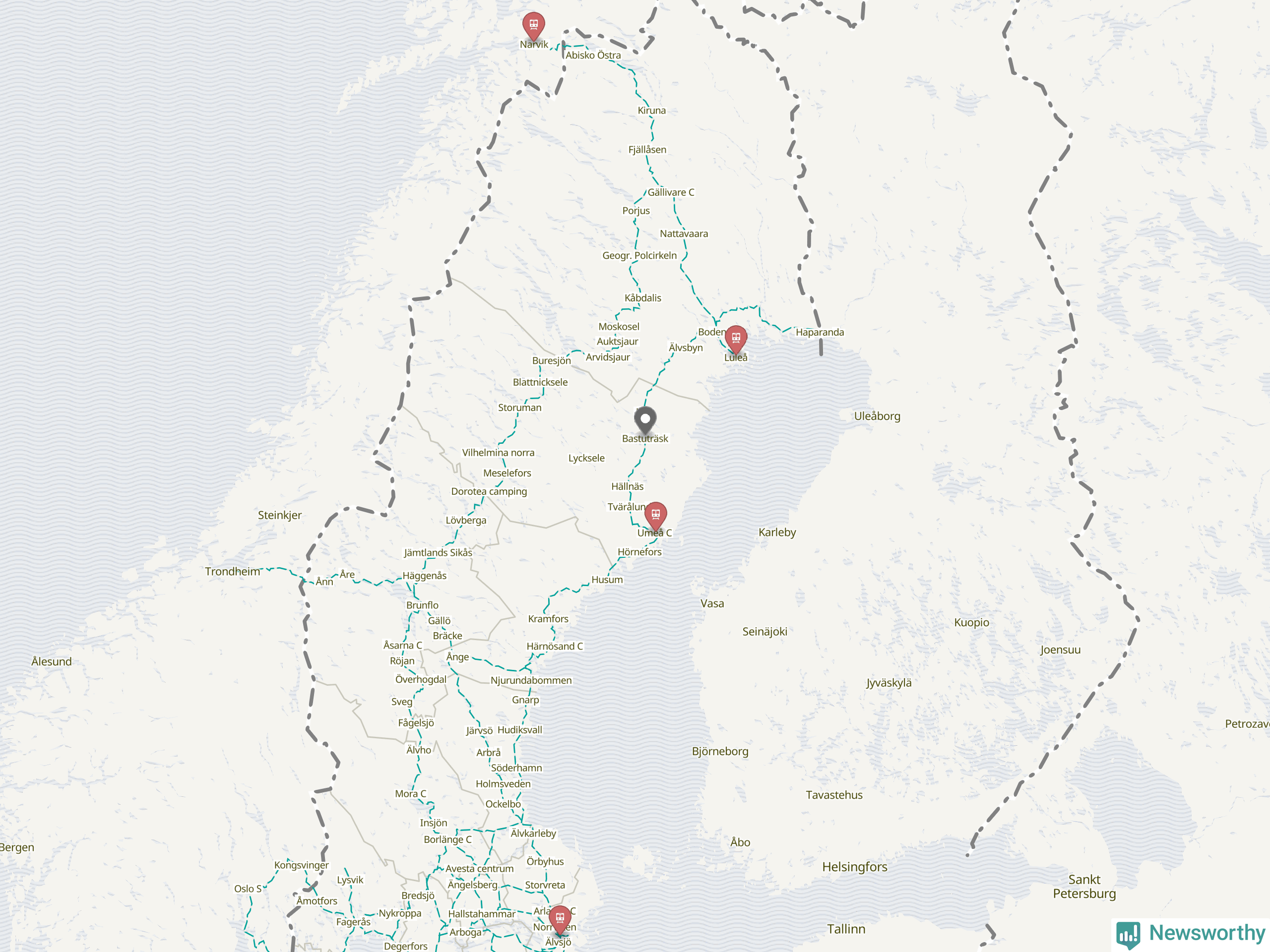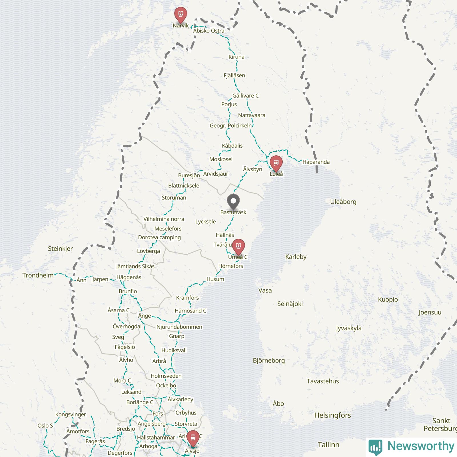 Kartdata från Mapbox, Newsworthy, OpenStreetMap och Trafikverket. Uppgifter om sträckor med passagerartrafik från jarnvag.net.