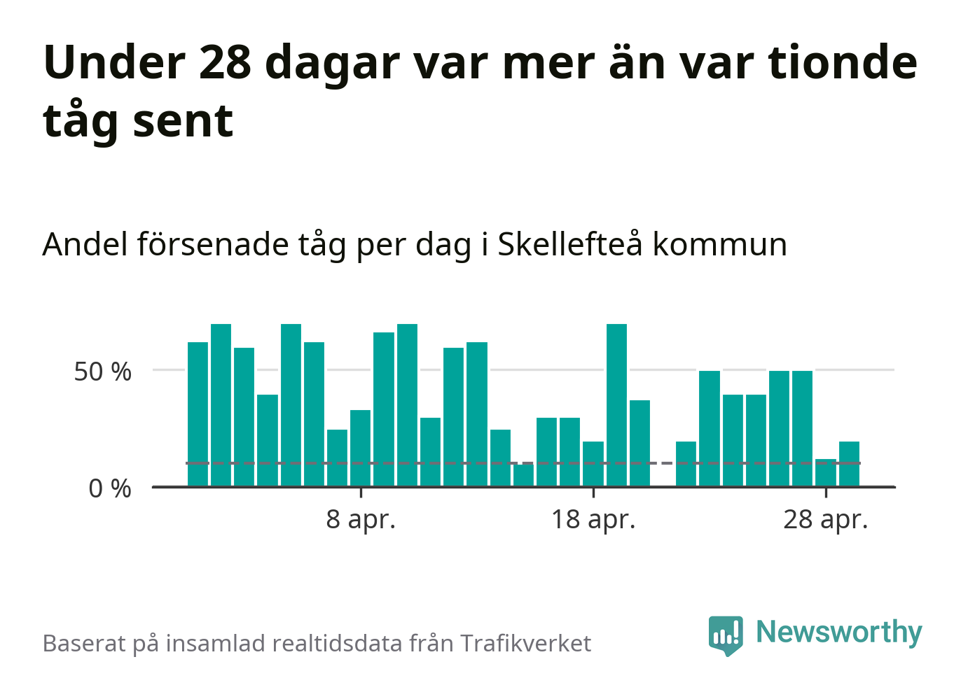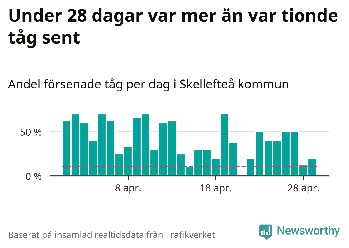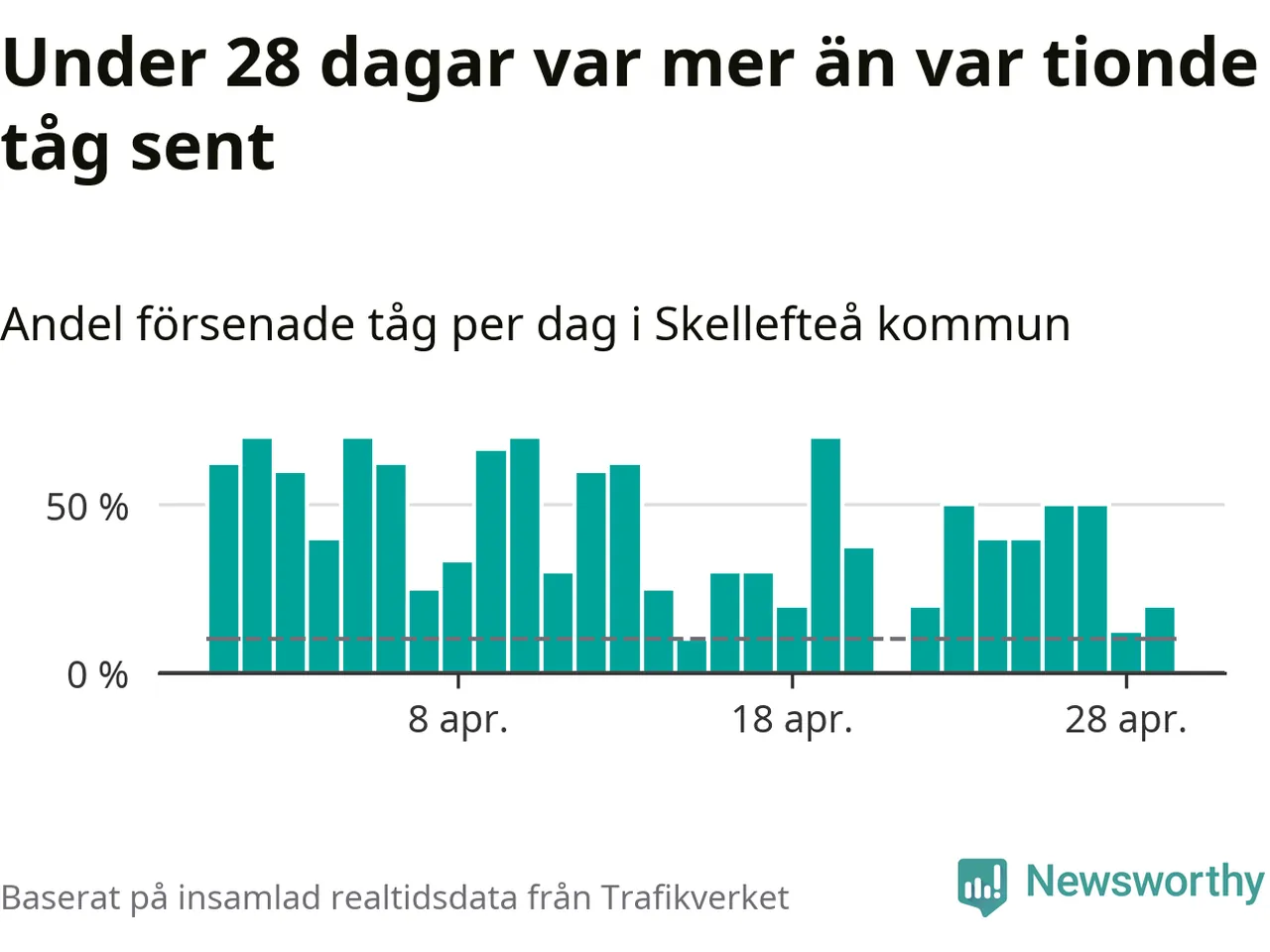 Under 28 av 30 dagar i april var mer än var tionde tåg vid Jörn försenat. Det visar Newsworthys sammanställning av alla tågförseningar förra månaden.