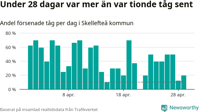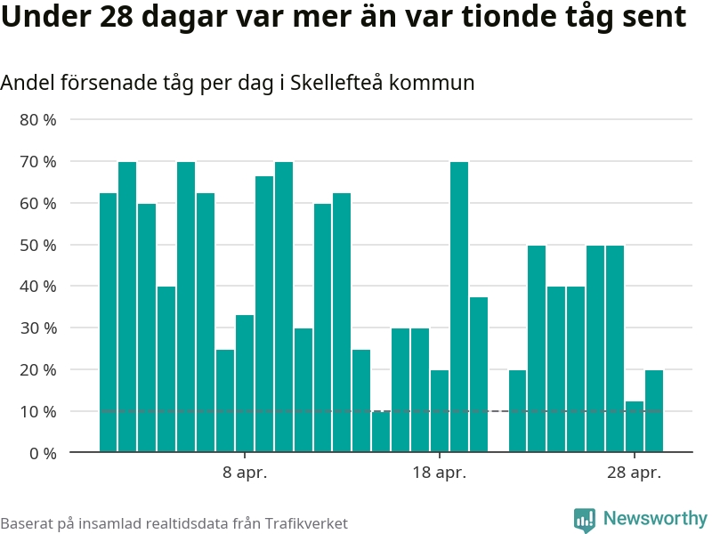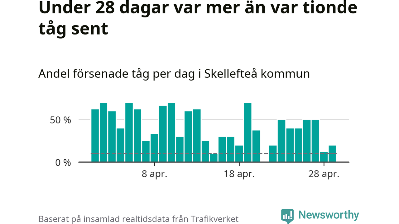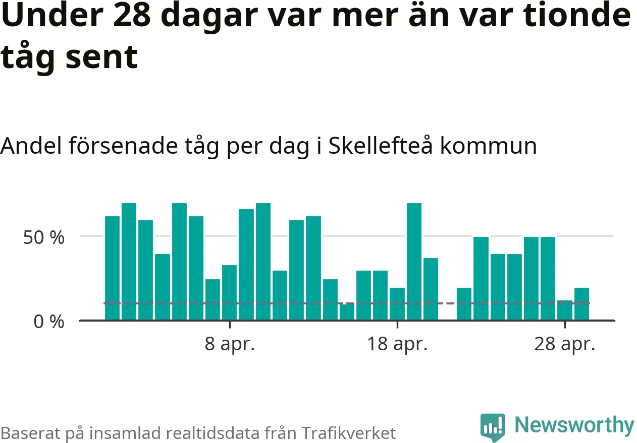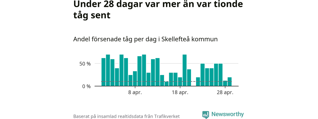 Under 28 av 30 dagar i april var mer än var tionde tåg vid Jörn försenat. Det visar Newsworthys sammanställning av alla tågförseningar förra månaden.