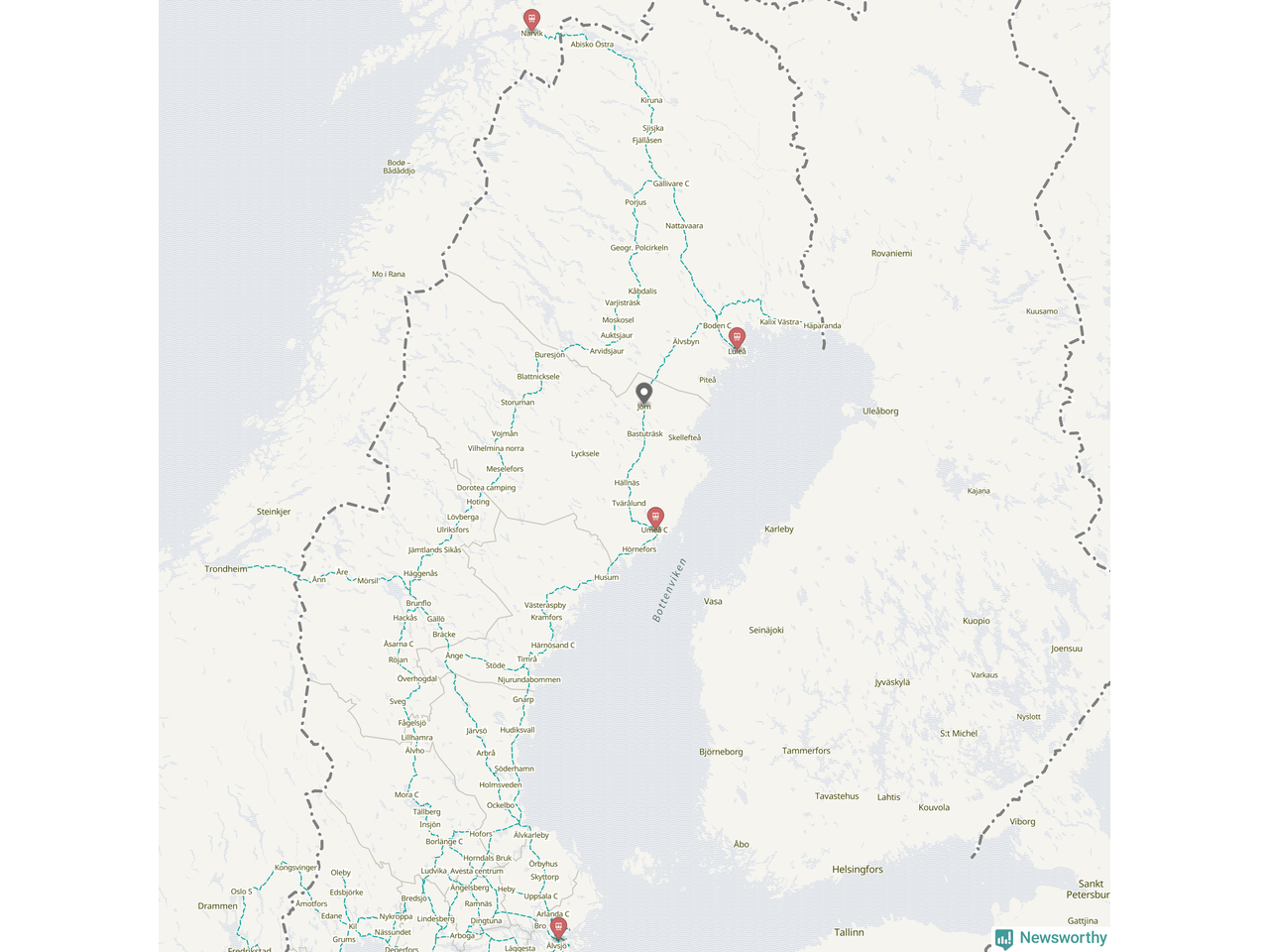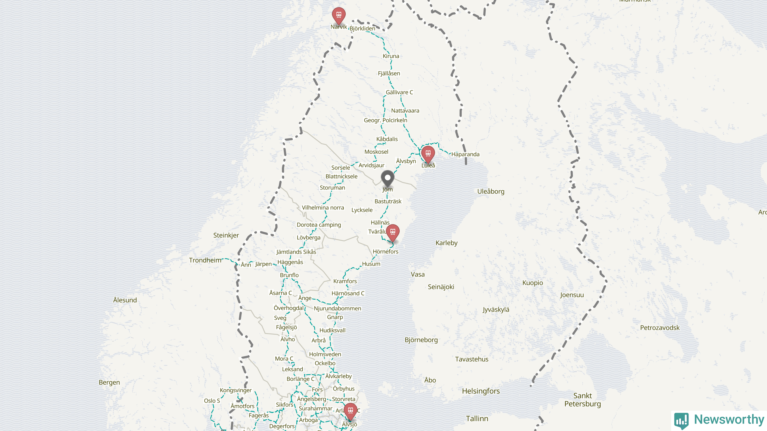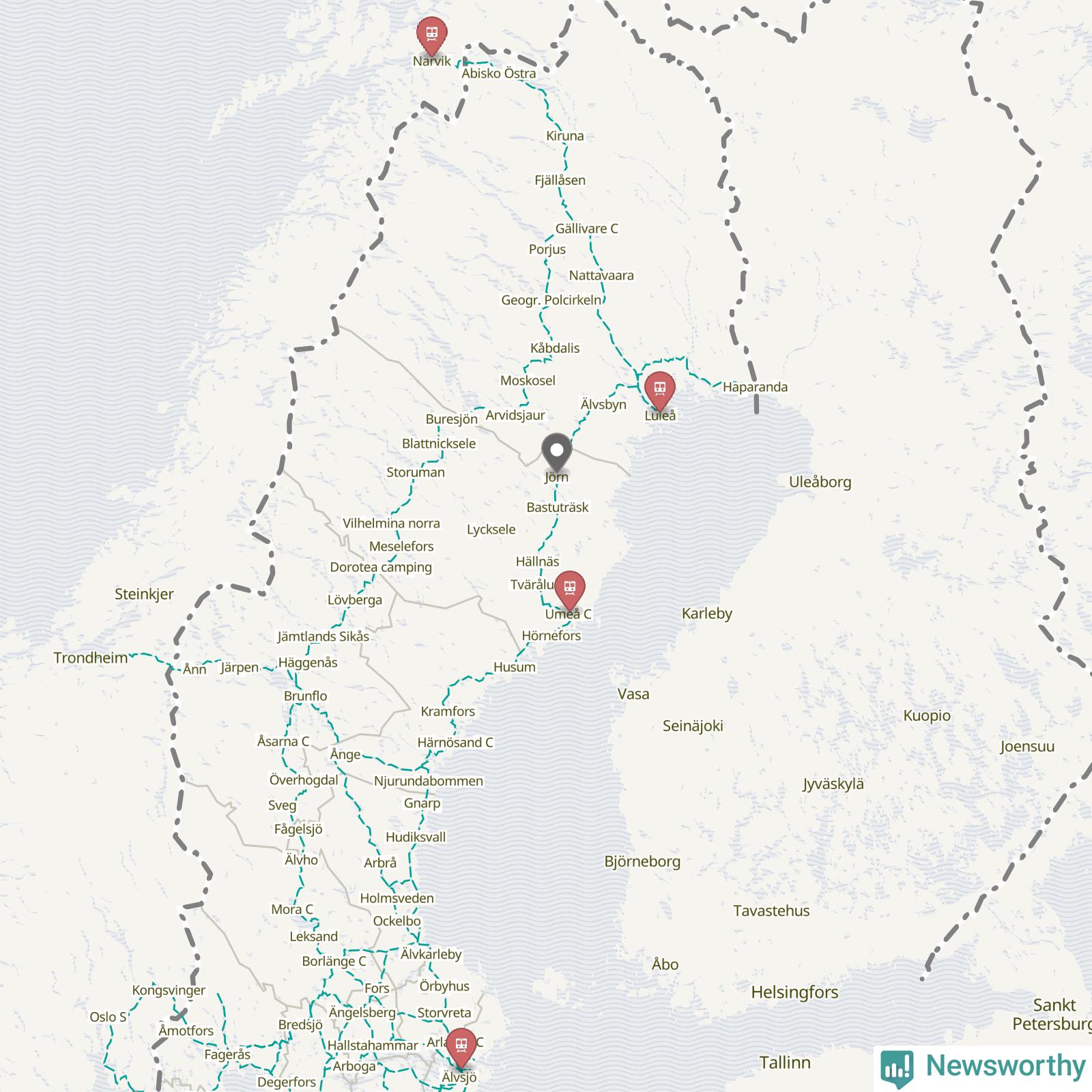 Kartdata från Mapbox, Newsworthy, OpenStreetMap och Trafikverket. Uppgifter om sträckor med passagerartrafik från jarnvag.net.