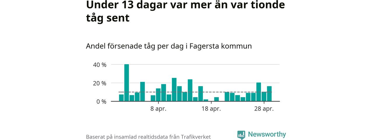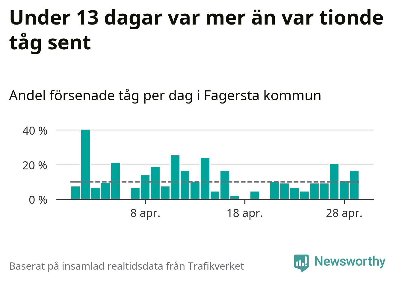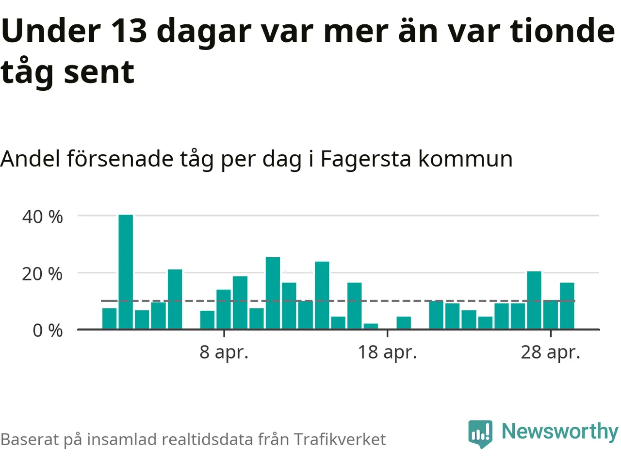 Under 13 av 30 dagar i april var mer än var tionde tåg i Fagersta kommun försenat. Det visar Newsworthys sammanställning av alla tågförseningar förra månaden.