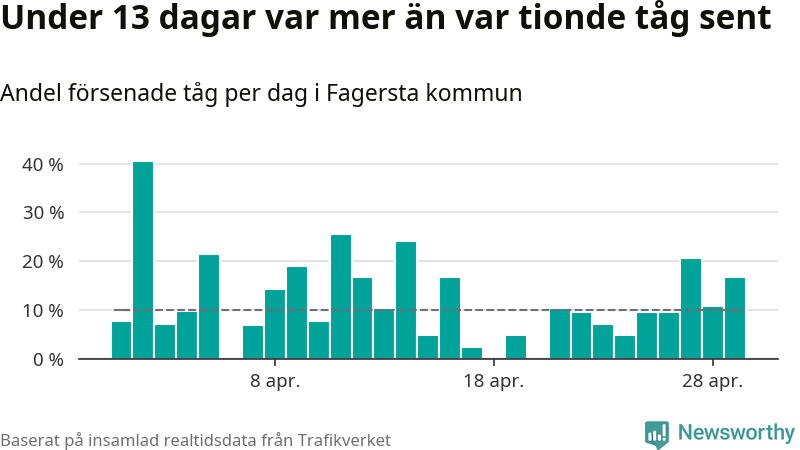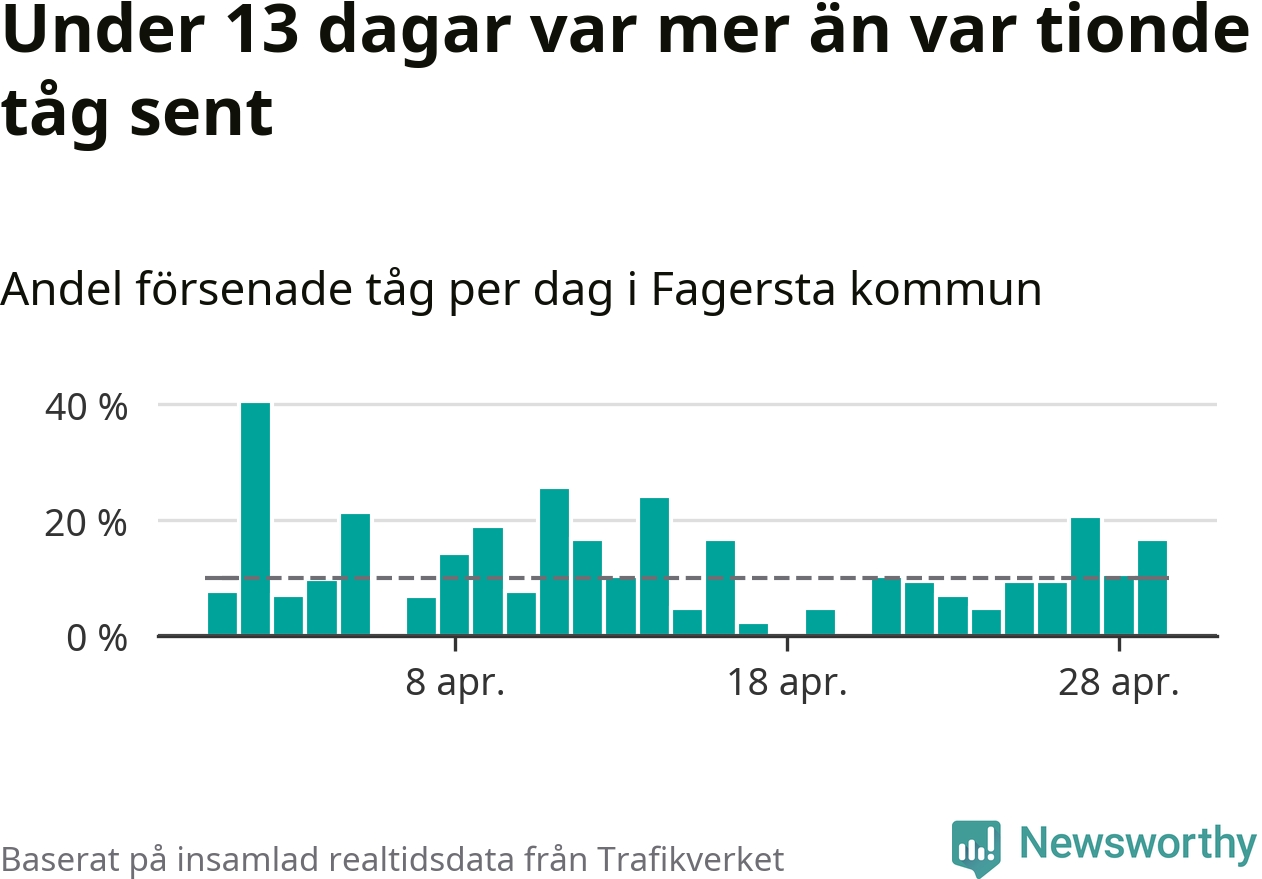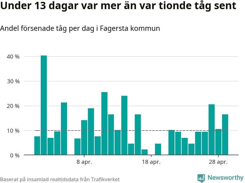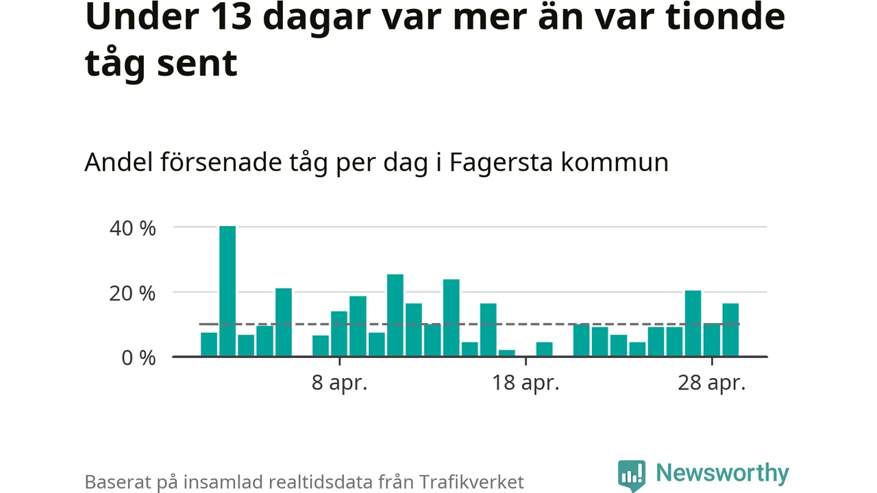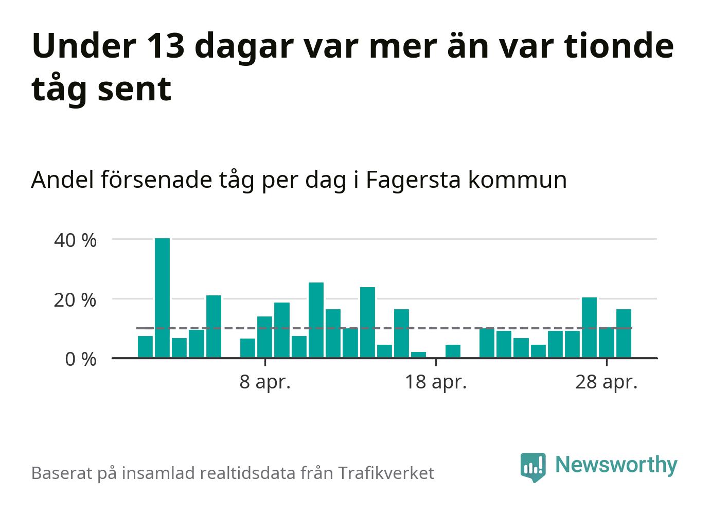 Under 13 av 30 dagar i april var mer än var tionde tåg i Fagersta kommun försenat. Det visar Newsworthys sammanställning av alla tågförseningar förra månaden.