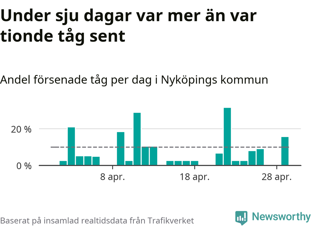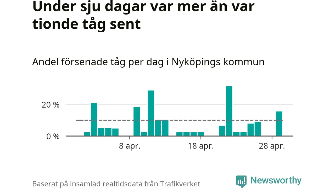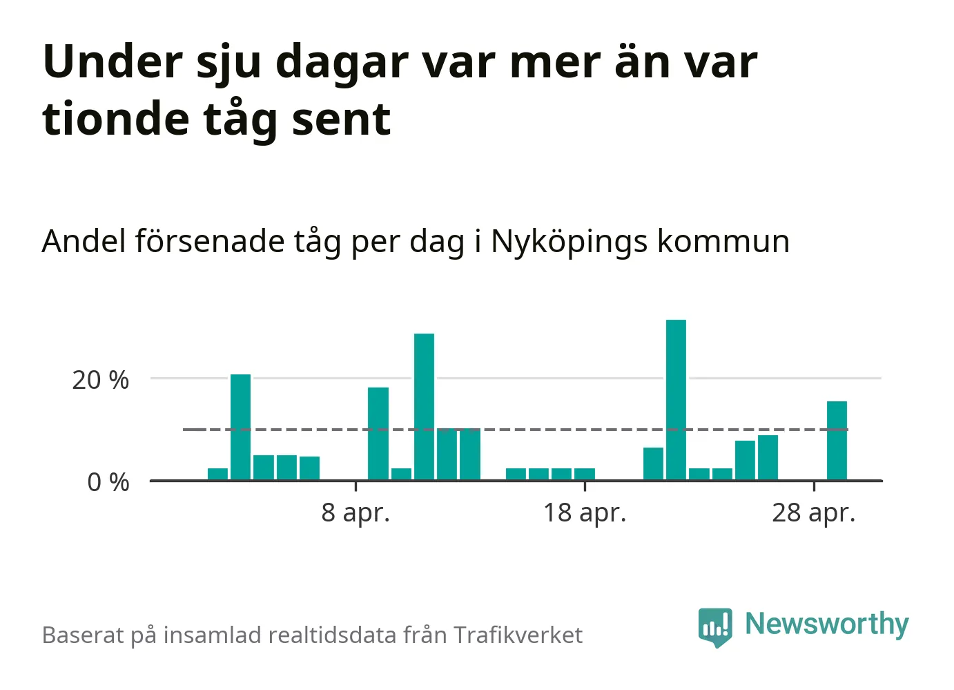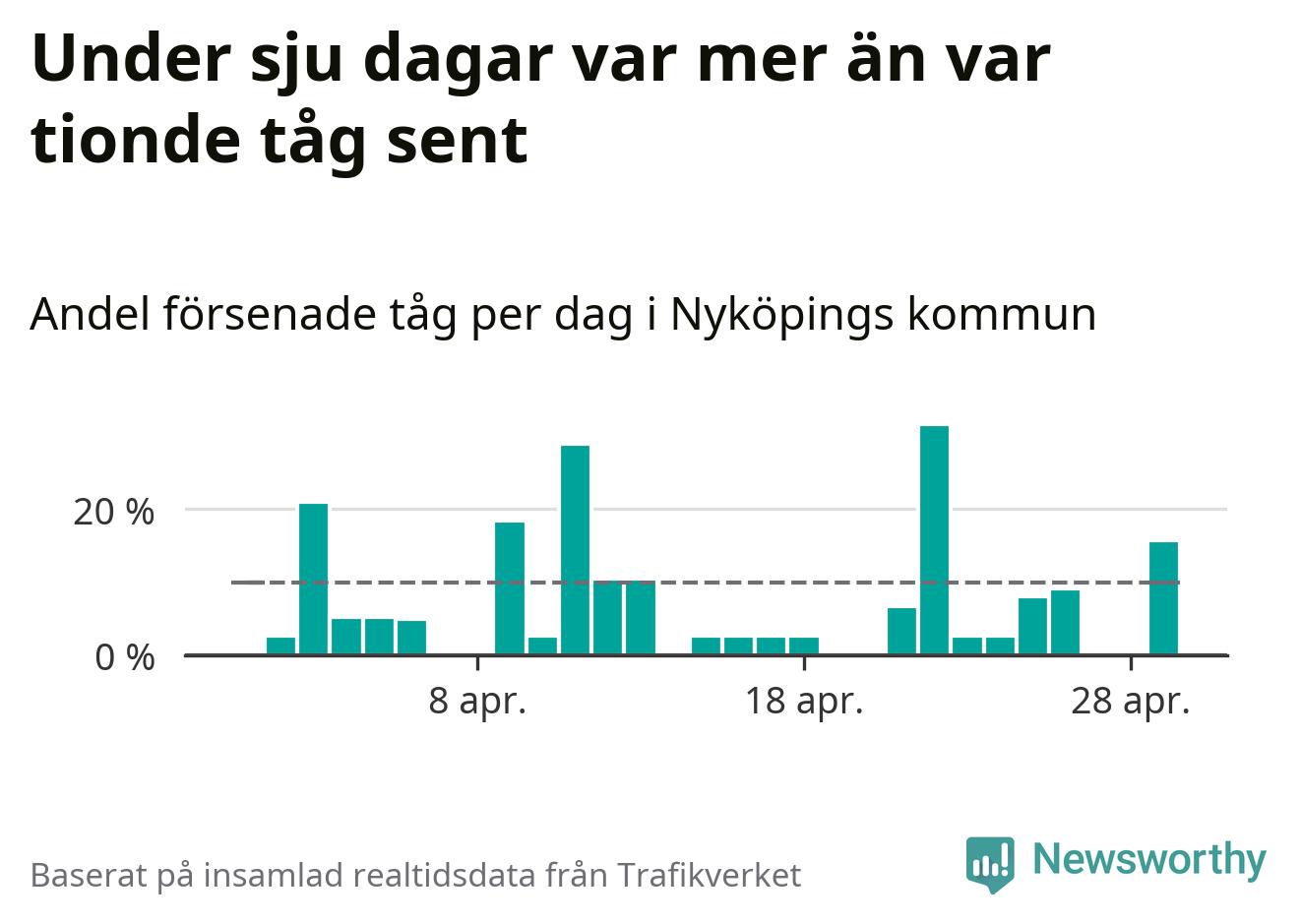 Vårvintern har kantats av stora tågförseningar. Newsworthy har samlat in tågens ankomsttider under april, för att se hur stor andel av tågen till Nyköpings kommun som var i tid under månaden.