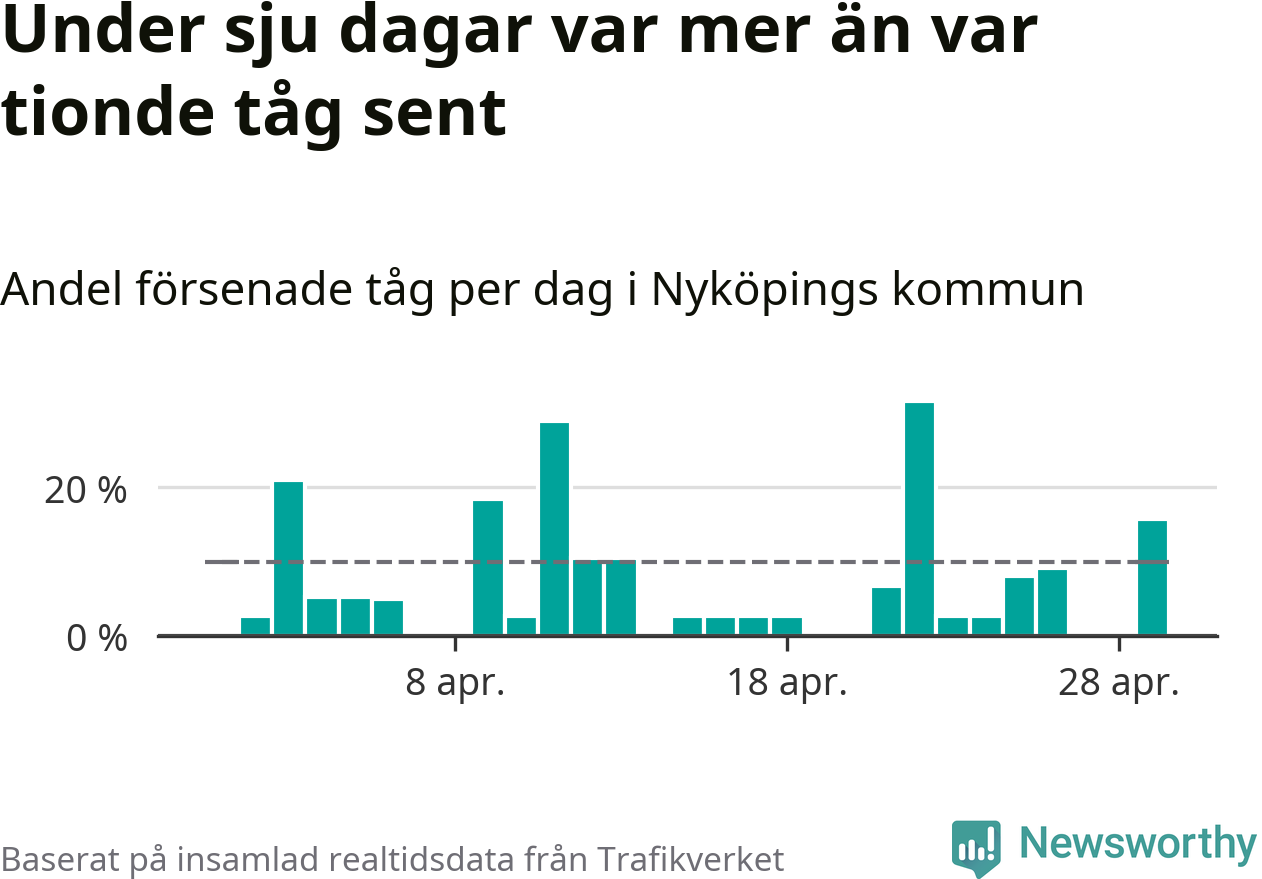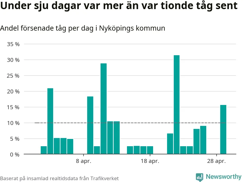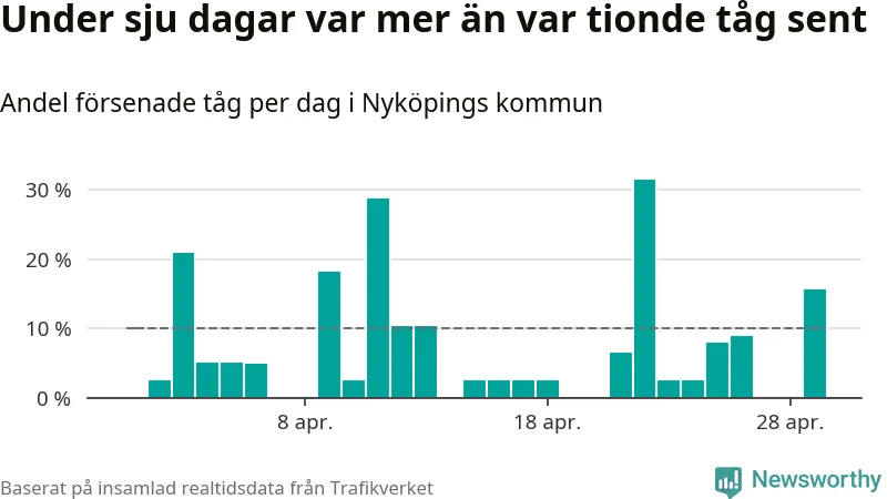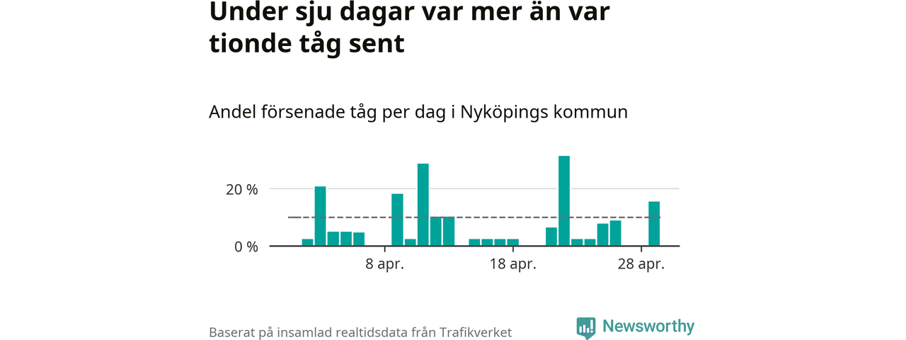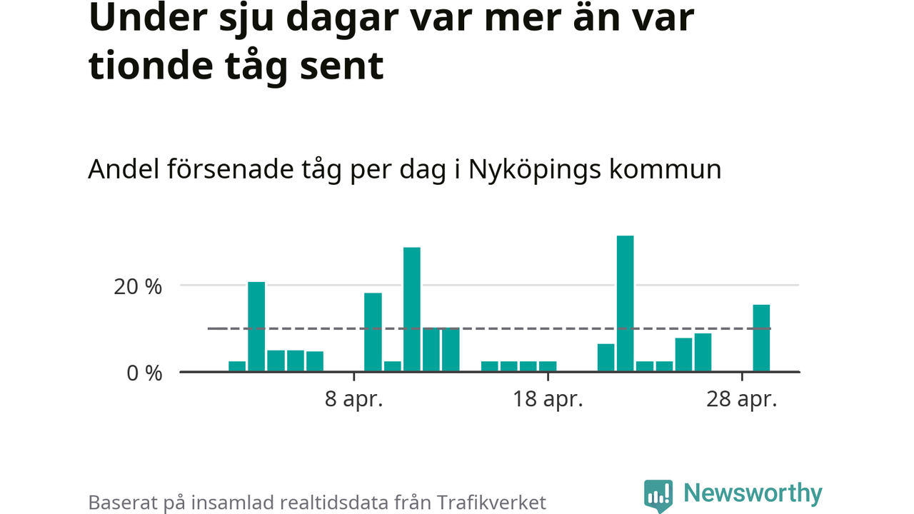 Vårvintern har kantats av stora tågförseningar. Newsworthy har samlat in tågens ankomsttider under april, för att se hur stor andel av tågen till Nyköpings kommun som var i tid under månaden.