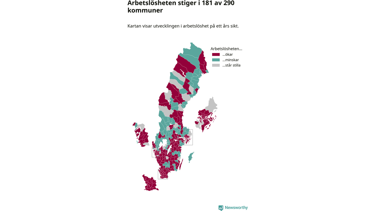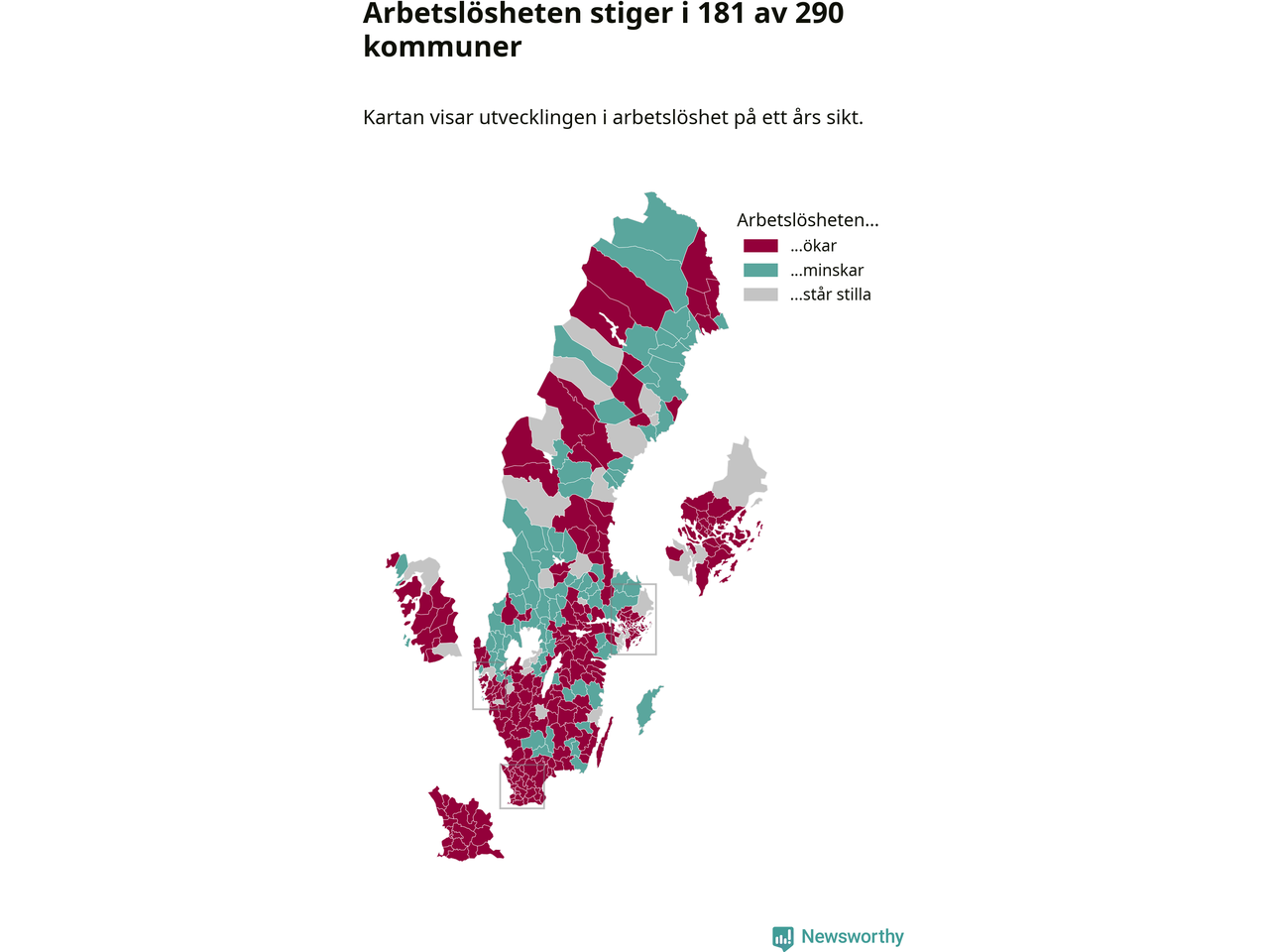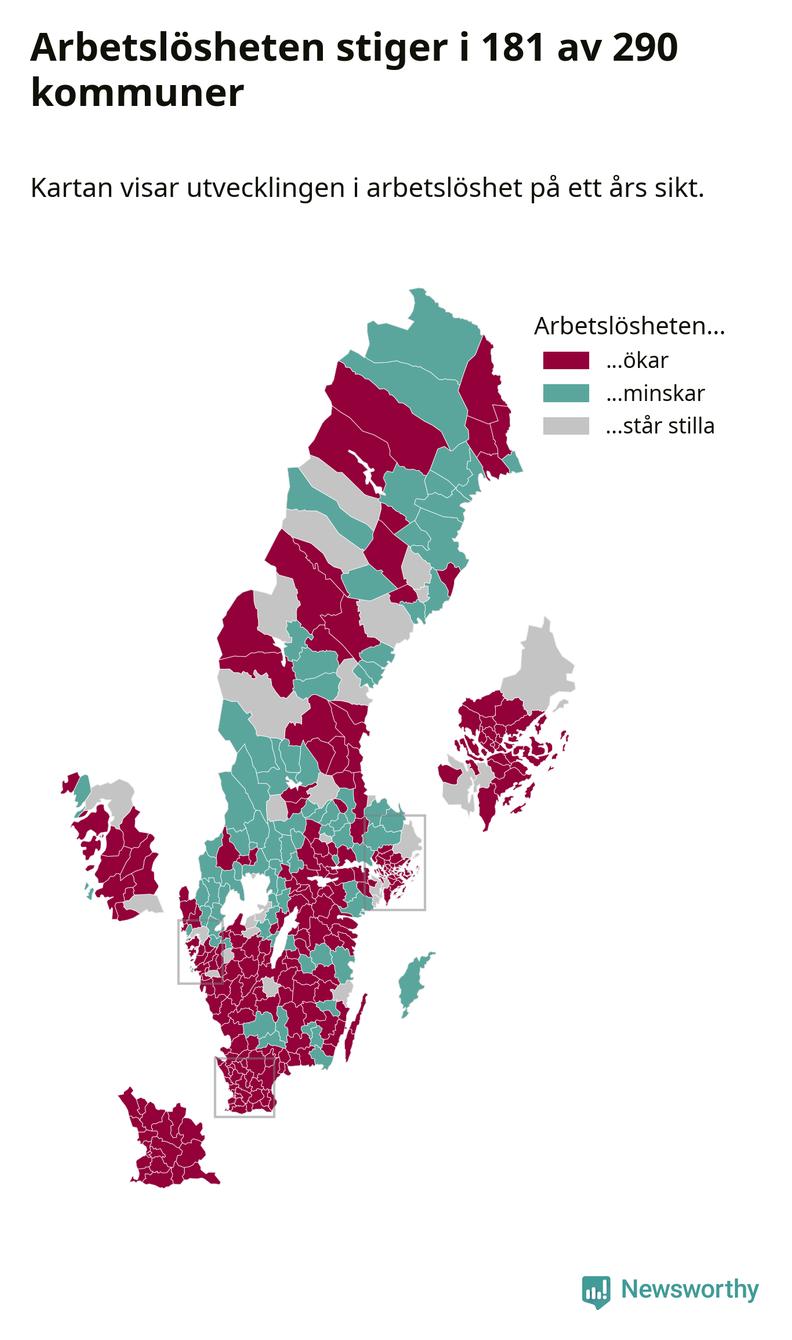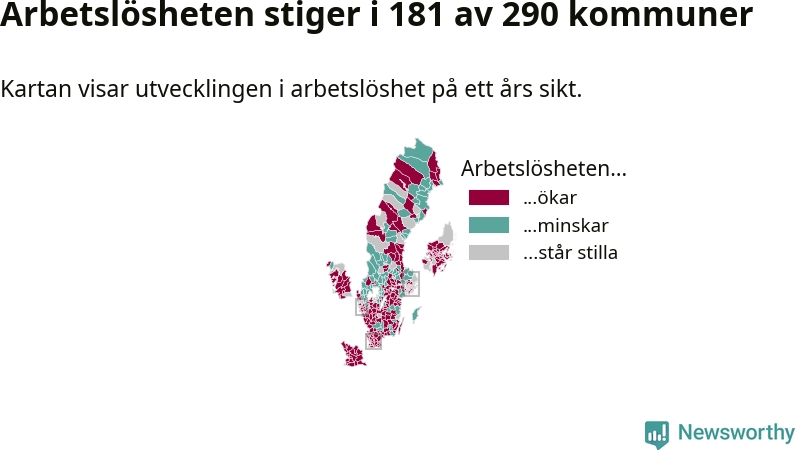 I riket som helhet steg arbetslösheten i april jämfört med året innan (+0,3 procentenheter) och ligger nu på 6,6 procent. 181 av 290 kommuner har högre arbetslöshet i dag än för ett år sedan.