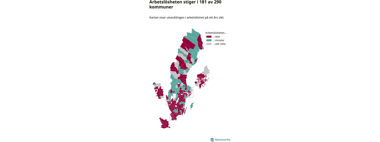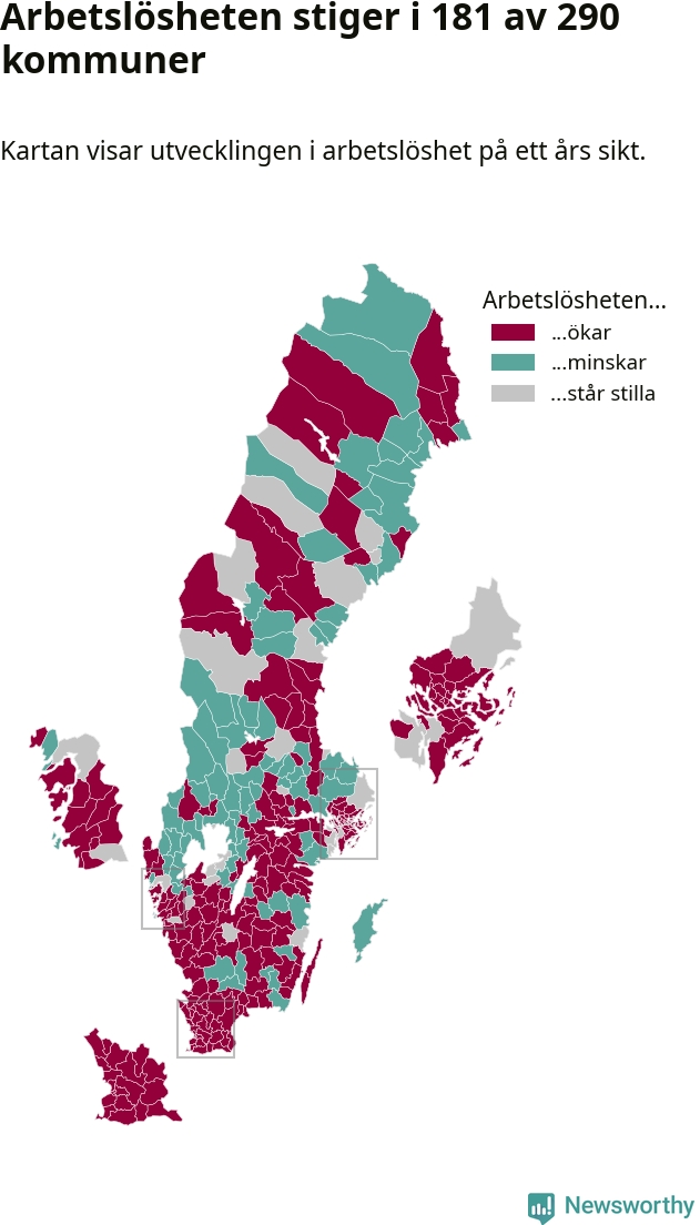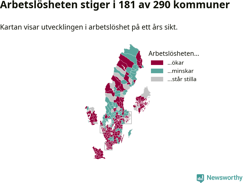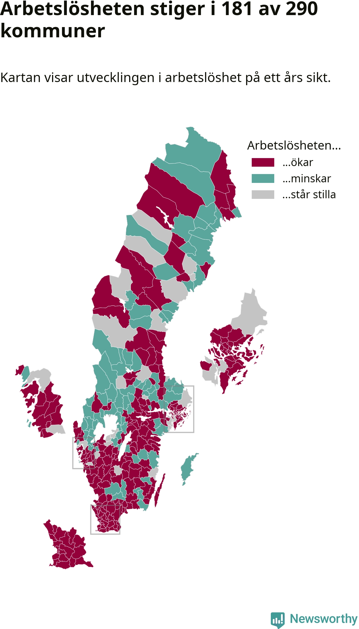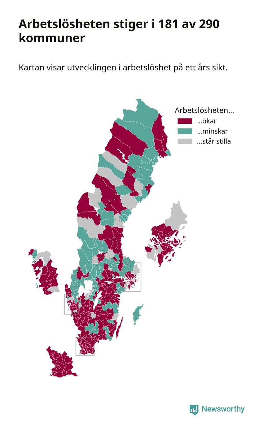 I riket som helhet steg arbetslösheten i april jämfört med året innan (+0,3 procentenheter) och ligger nu på 6,6 procent. 181 av 290 kommuner har högre arbetslöshet i dag än för ett år sedan.