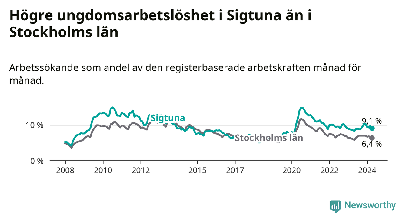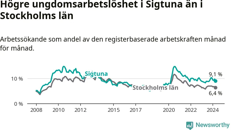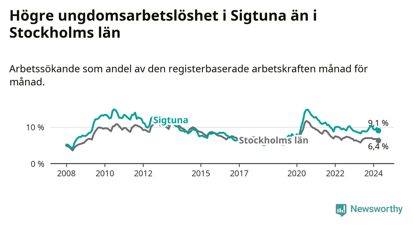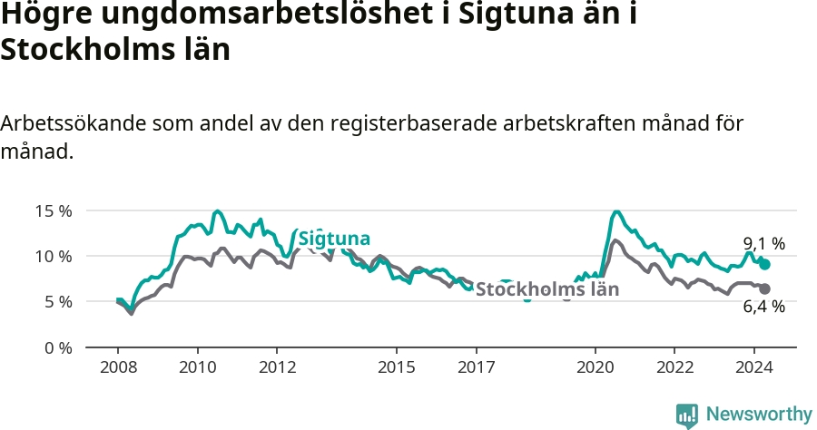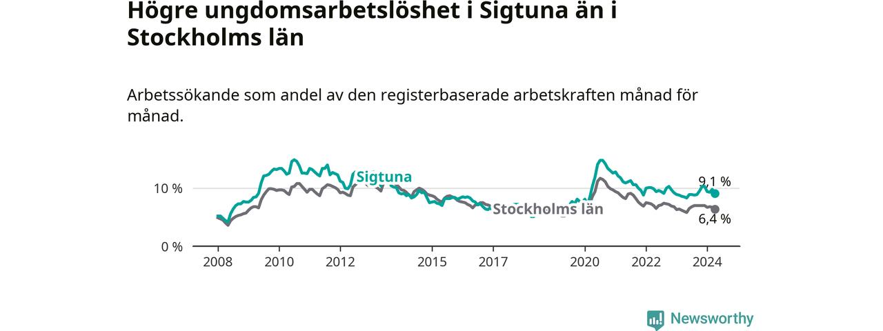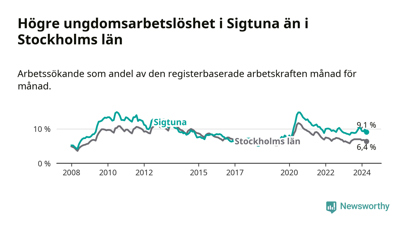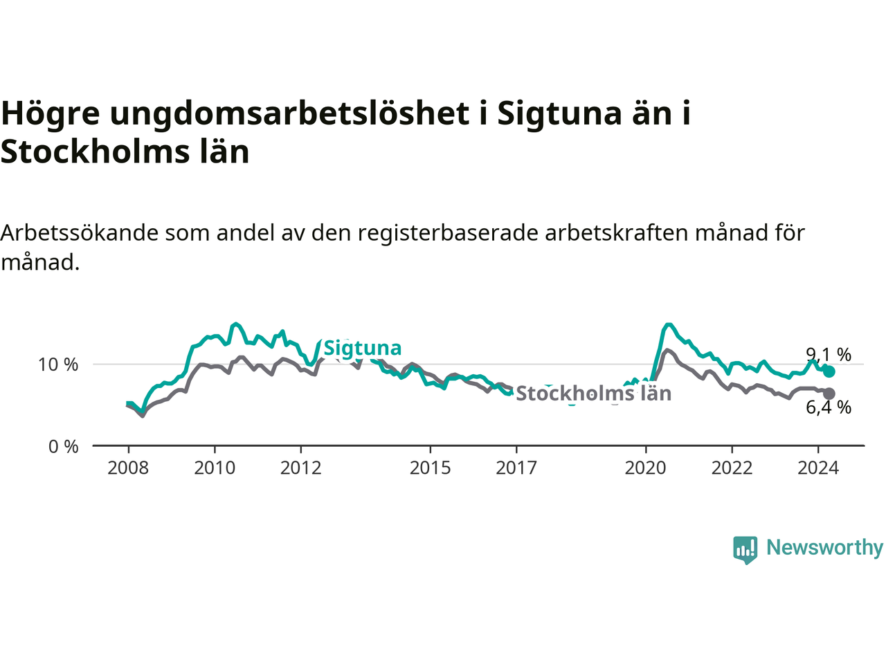 Precis som den totala arbetslösheten ligger ungdomsarbetslösheten i Sigtuna högre än i Stockholms län som helhet. Skillnaden mellan kommunen och länet är 2,7 procentenheter.