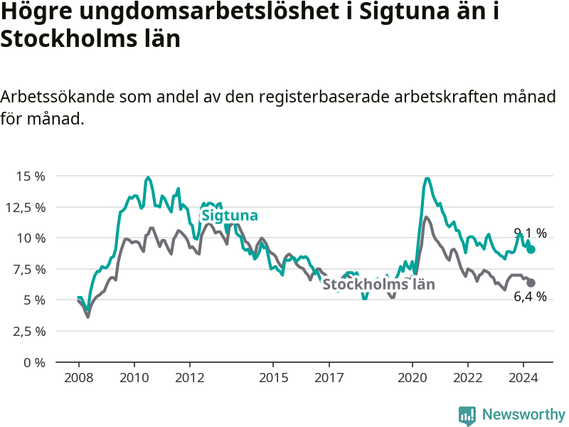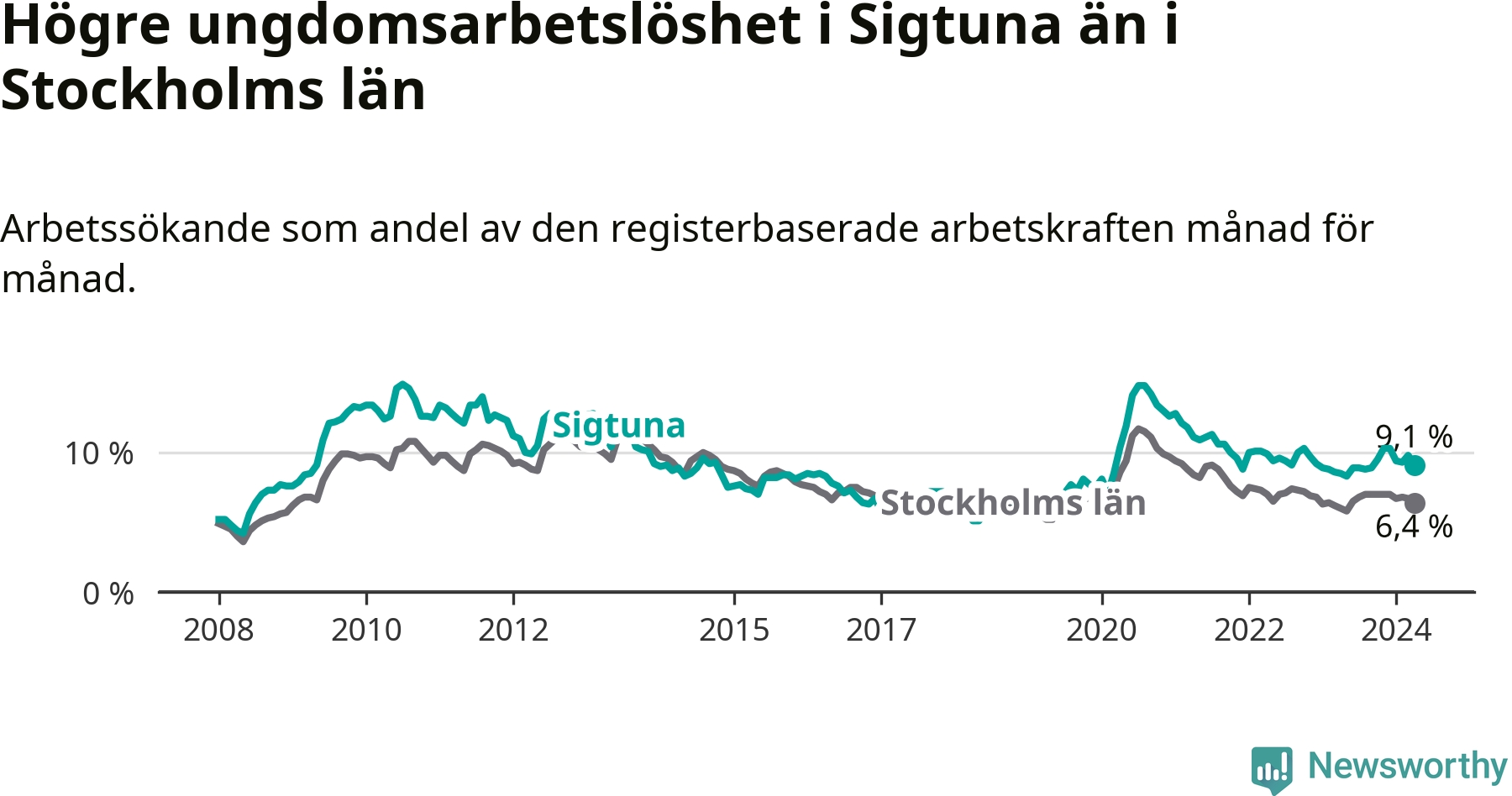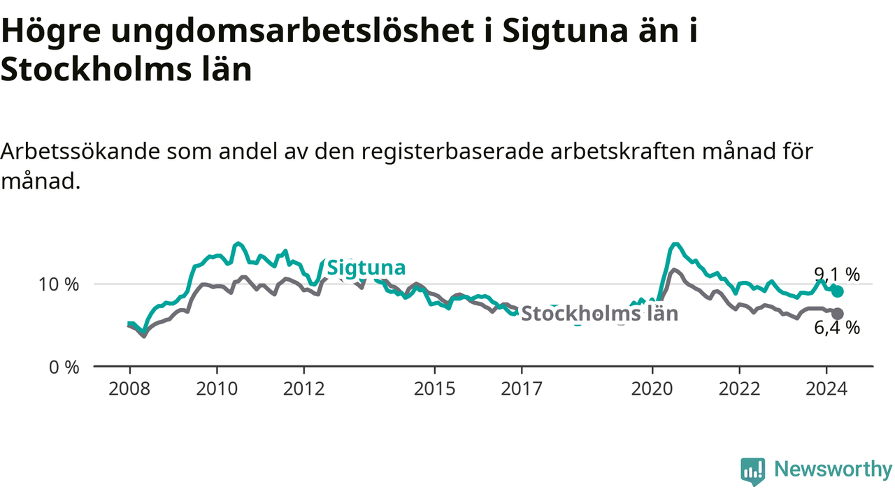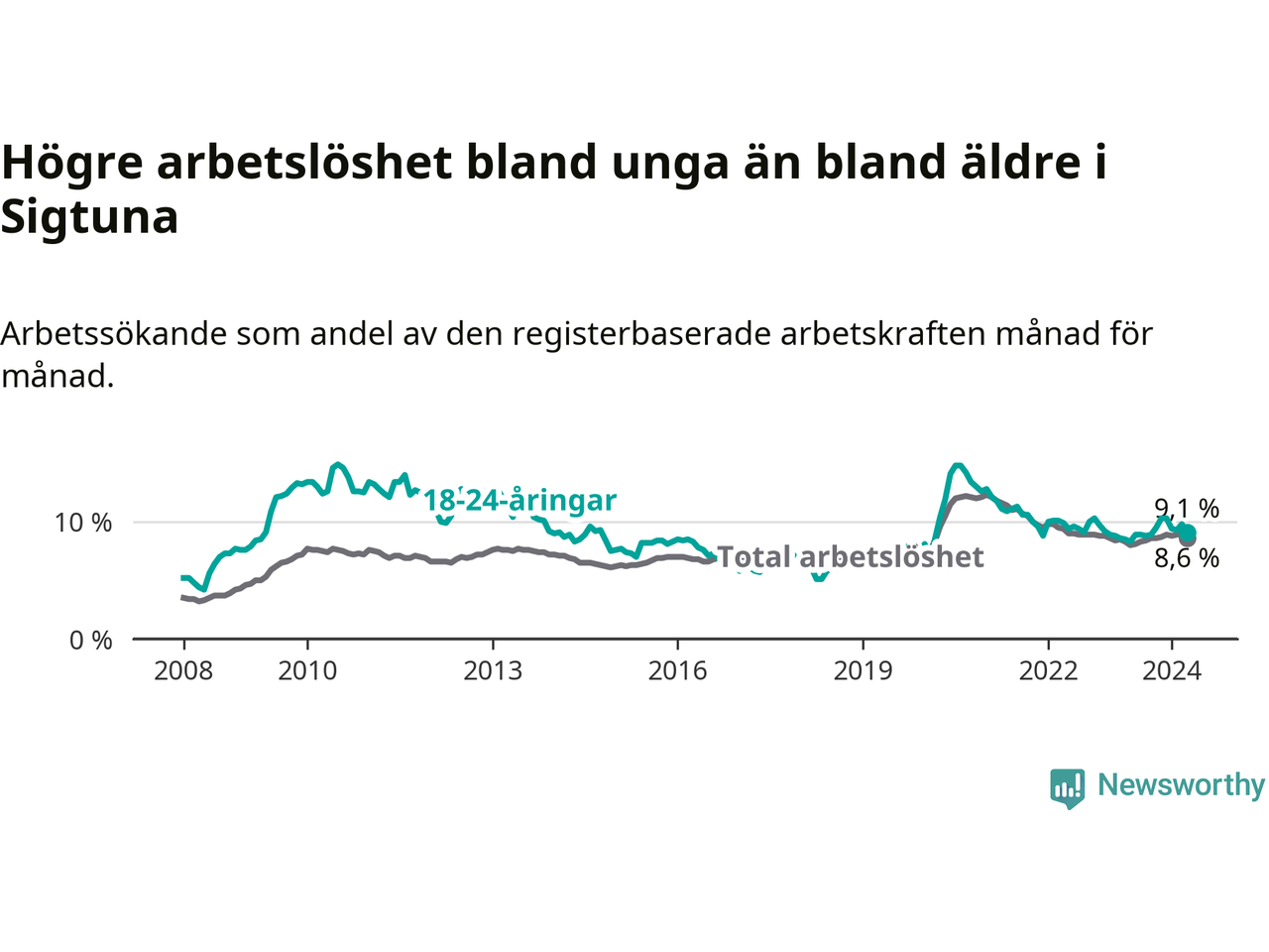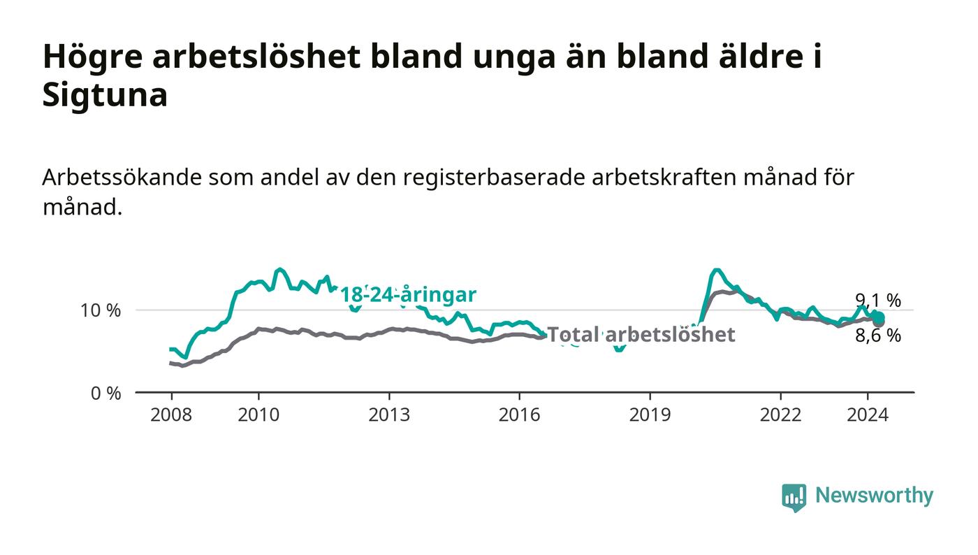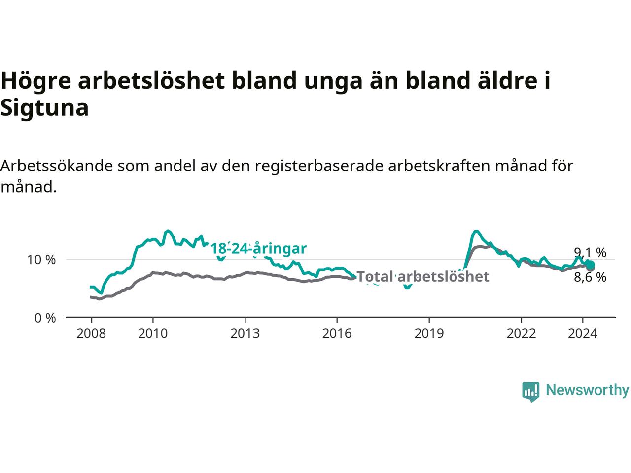 Precis som den totala arbetslösheten ligger ungdomsarbetslösheten i Sigtuna högre än i Stockholms län som helhet. Skillnaden mellan kommunen och länet är 2,7 procentenheter.