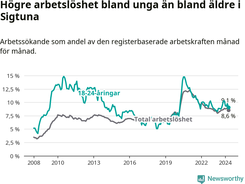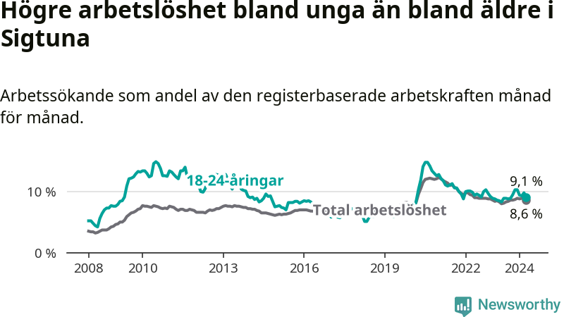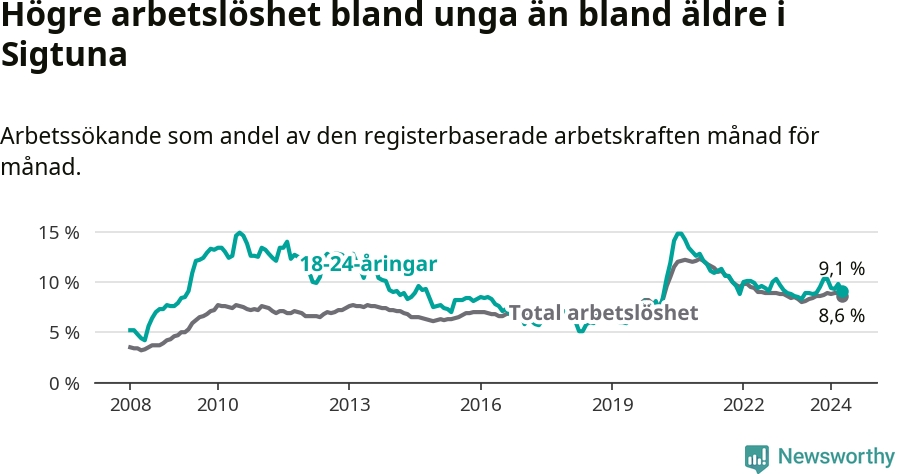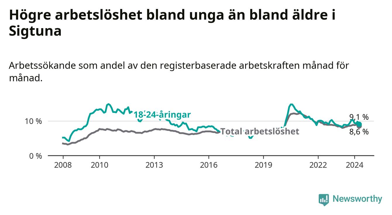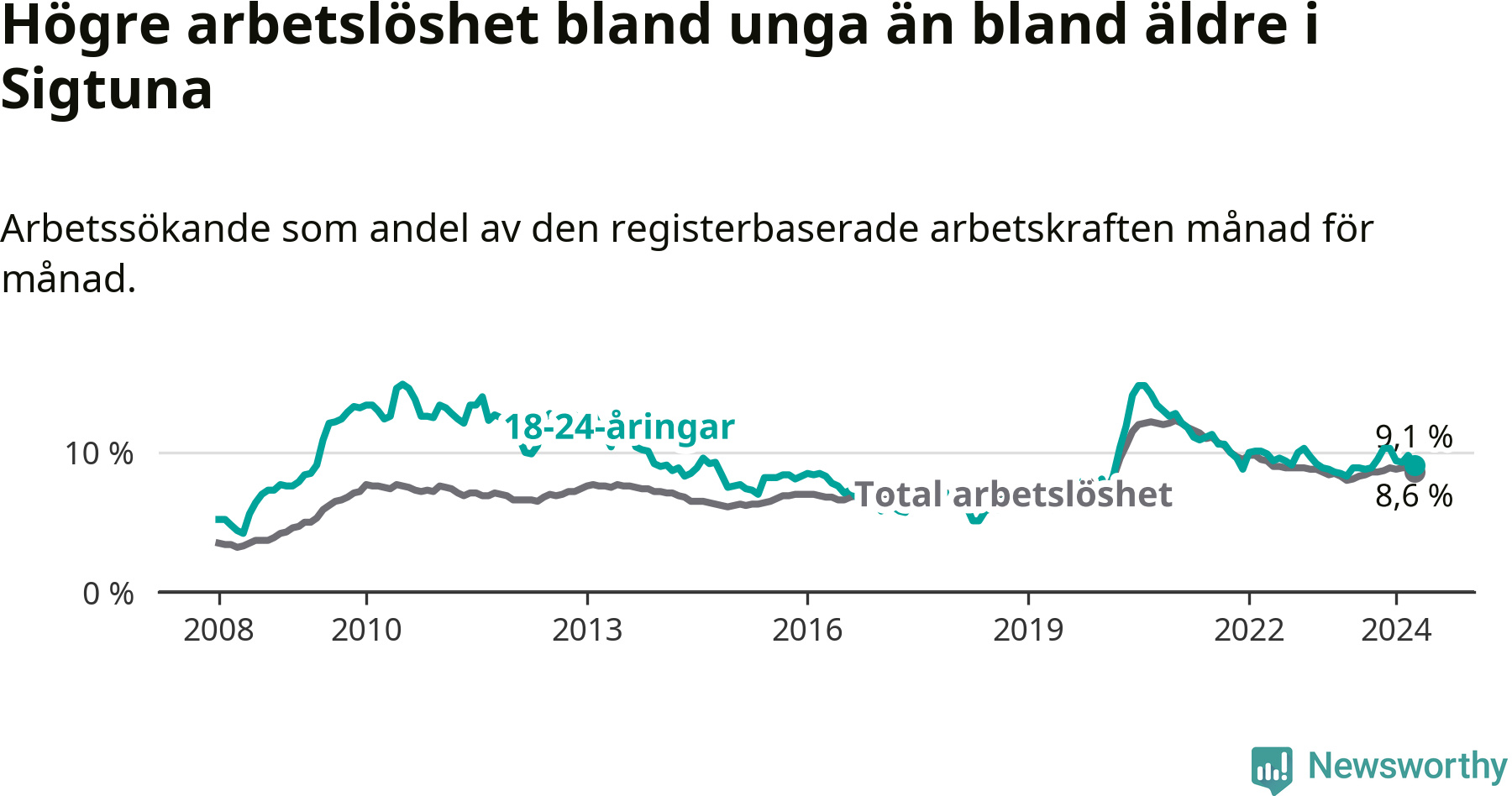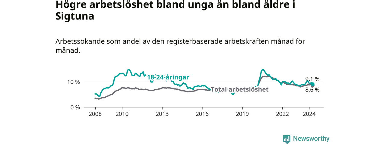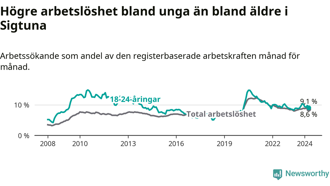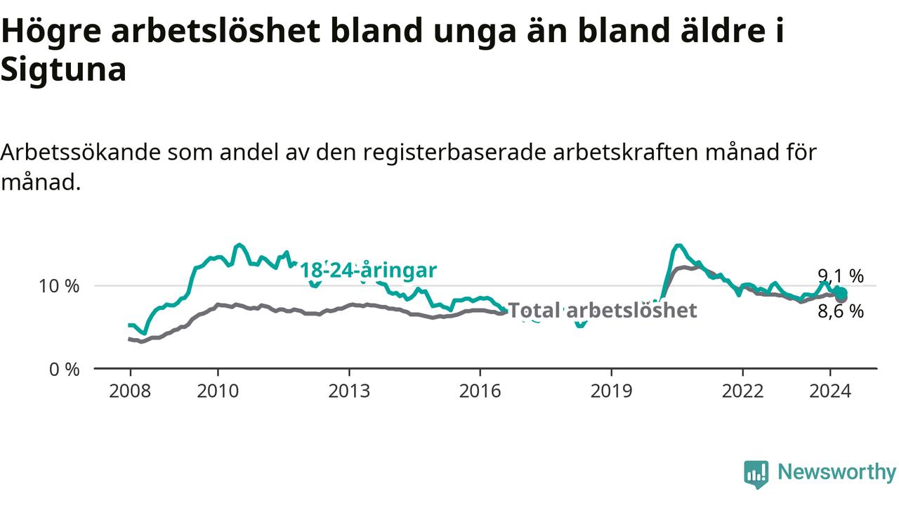 Precis som den totala arbetslösheten ligger ungdomsarbetslösheten i Sigtuna högre än i Stockholms län som helhet. Skillnaden mellan kommunen och länet är 2,7 procentenheter.