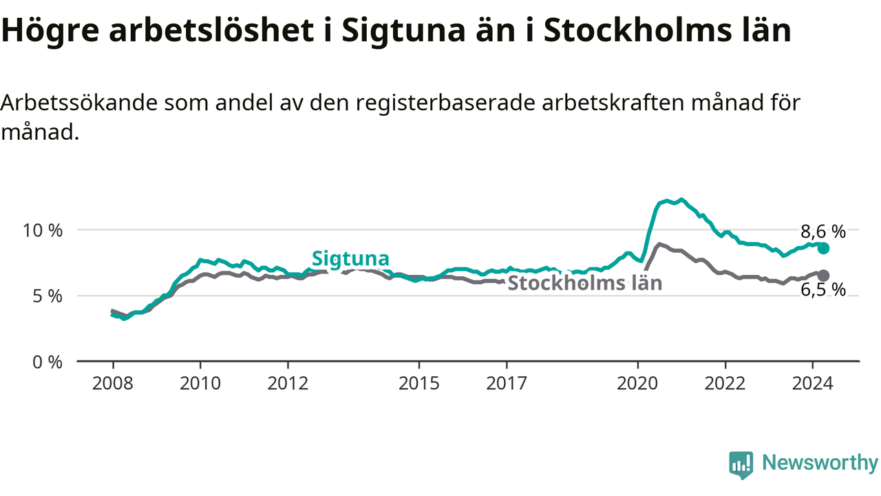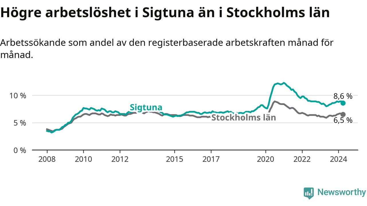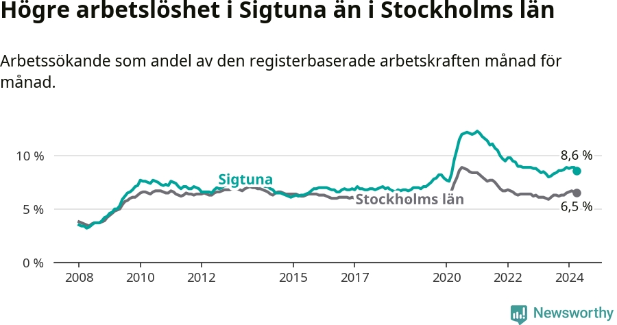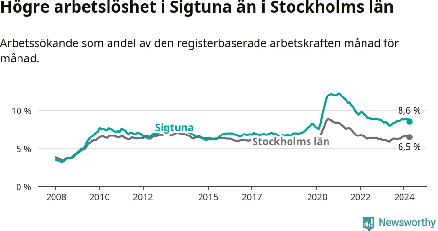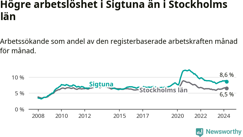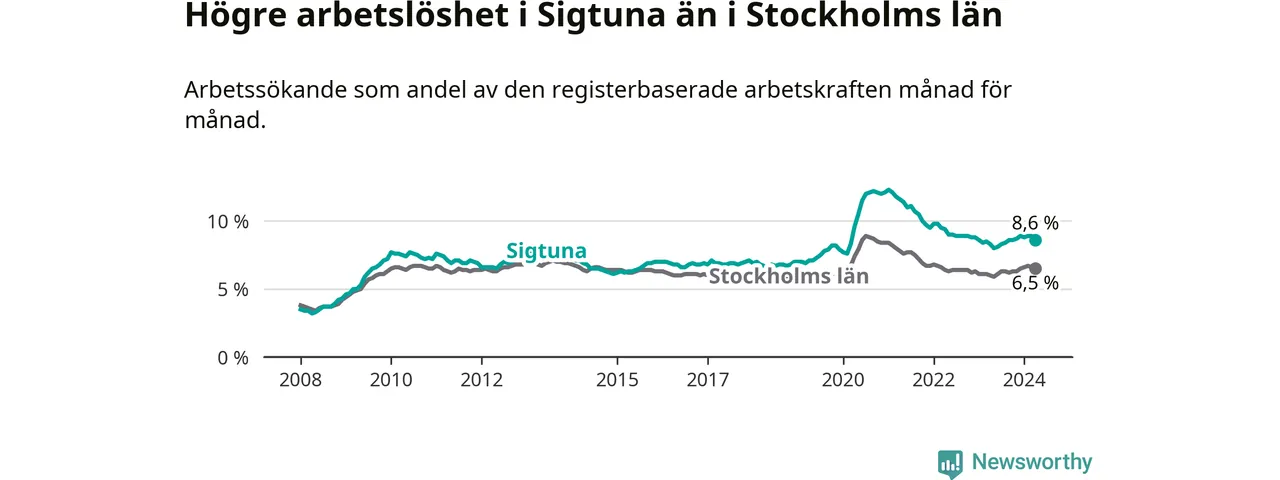 Under april månad rapporterade Sigtuna kommun en total arbetslöshet på 8,6 procent. Det är en ökning jämfört med samma tidpunkt i fjol (+0,3 procentenheter). Även i Stockholms län stiger arbetslösheten .