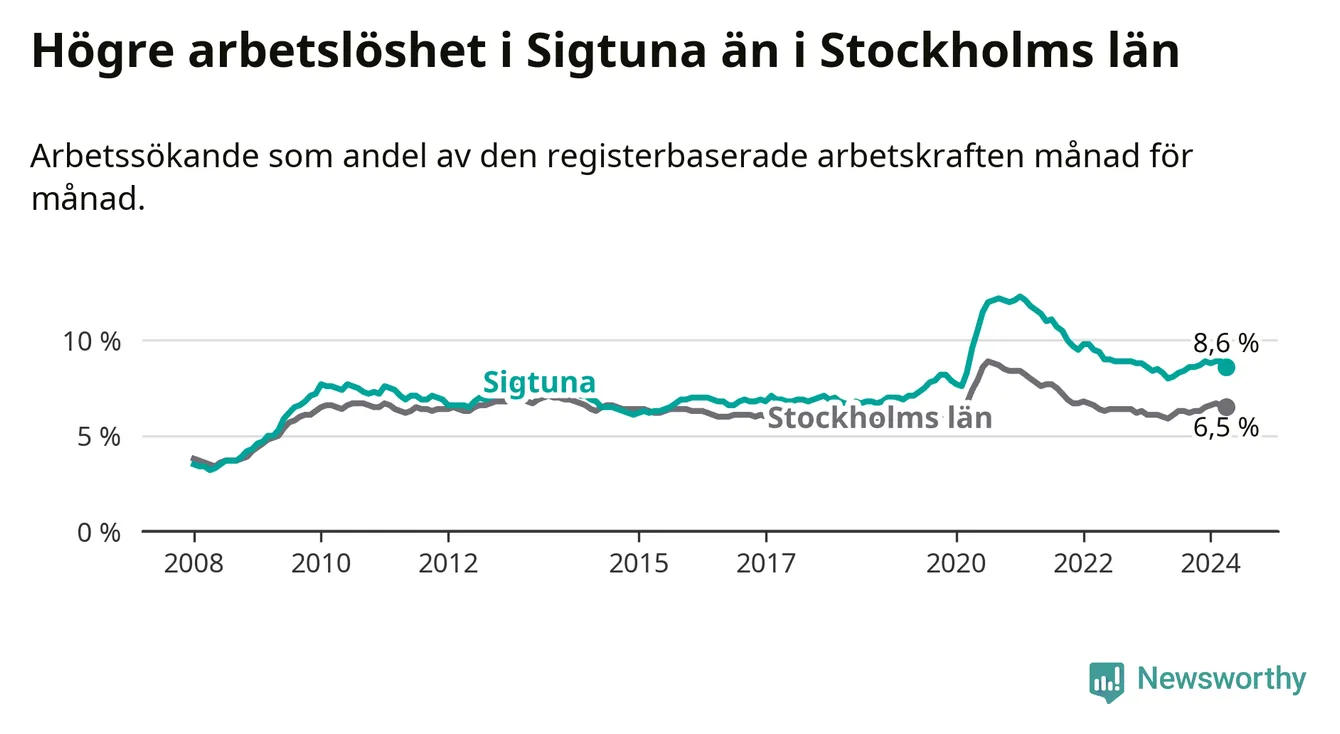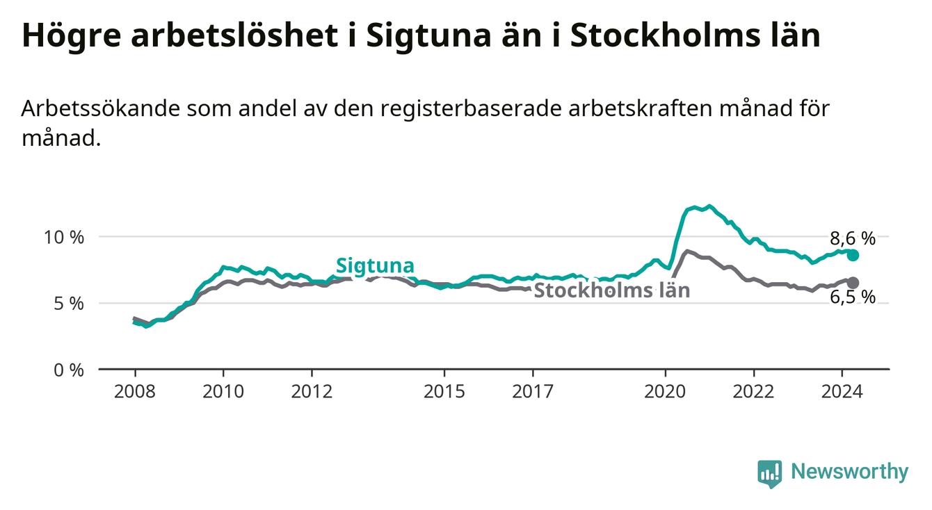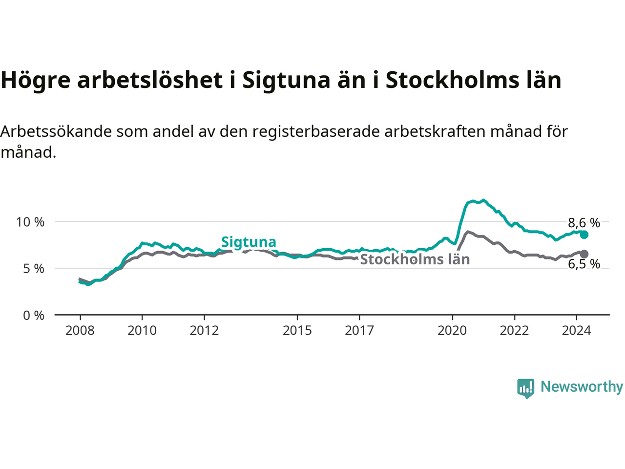 Sigtuna hade redan tidigare högre arbetslöshet än snittet i hela Stockholms län och nu växer klyftan (8,6 procent i kommunen, jämfört med 6,5 procent i hela länet). Ekerö har den lägsta arbetslösheten i länet (3,4 procent), medan Södertälje har den högsta (10,5 procent). För att Sigtuna skulle komma ner i samma arbetslöshetsnivå som Ekerö skulle 1 389 personer behöva sysselsättas.
