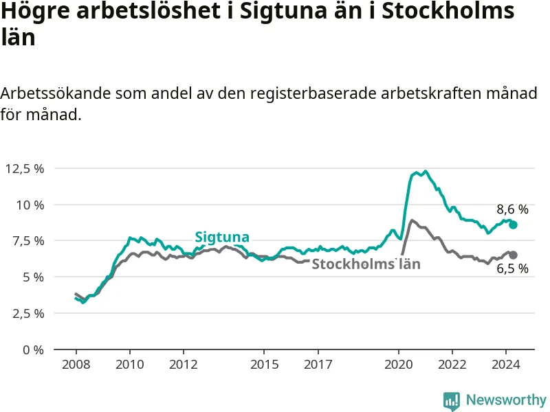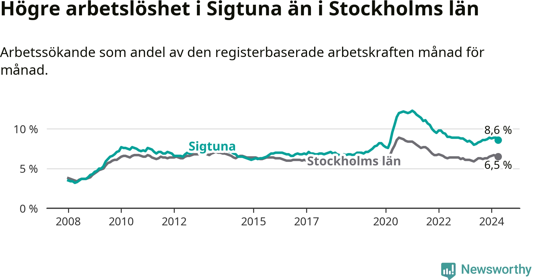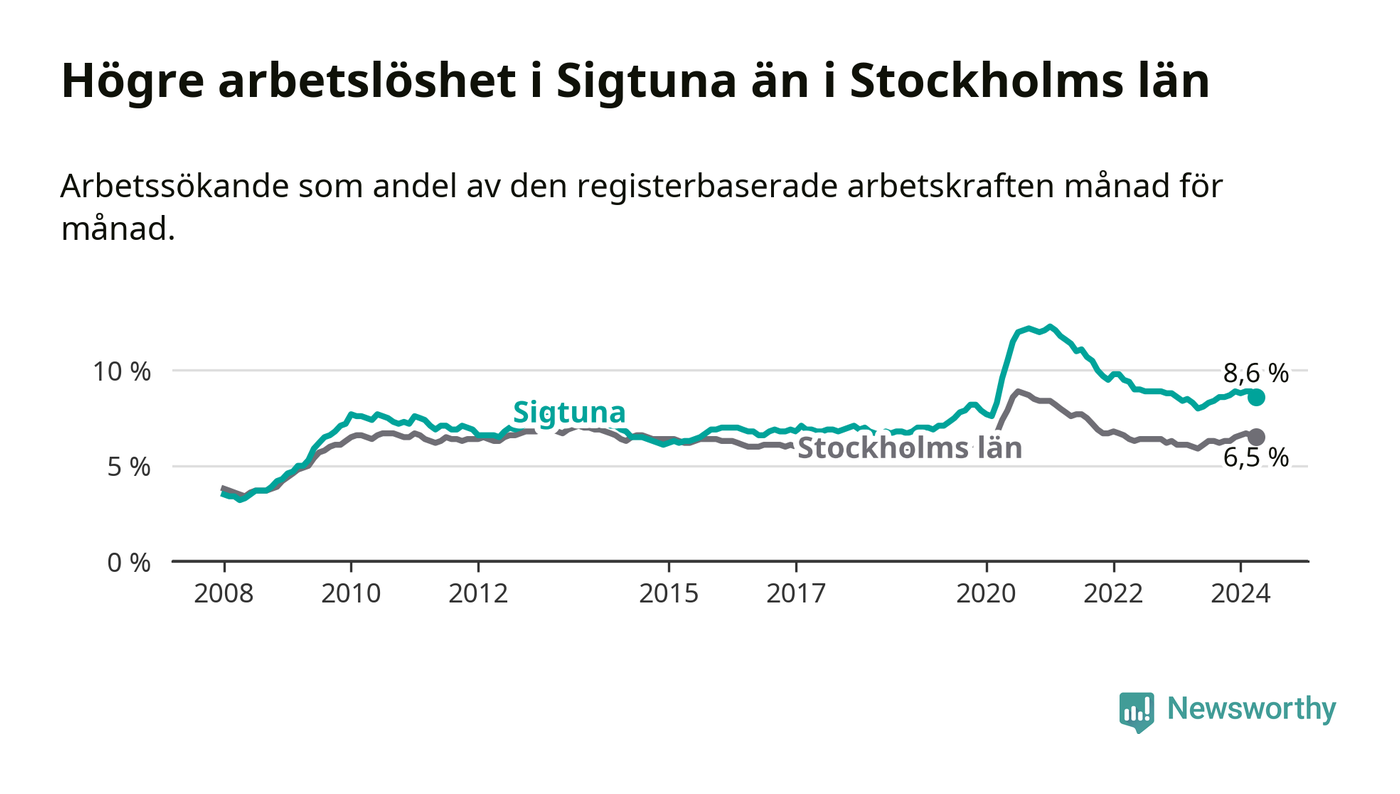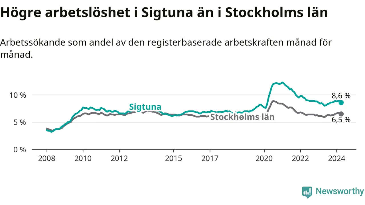 Sigtuna hade redan tidigare högre arbetslöshet än snittet i hela Stockholms län och nu växer klyftan (8,6 procent i kommunen, jämfört med 6,5 procent i hela länet). Ekerö har den lägsta arbetslösheten i länet (3,4 procent), medan Södertälje har den högsta (10,5 procent). För att Sigtuna skulle komma ner i samma arbetslöshetsnivå som Ekerö skulle 1 389 personer behöva sysselsättas.