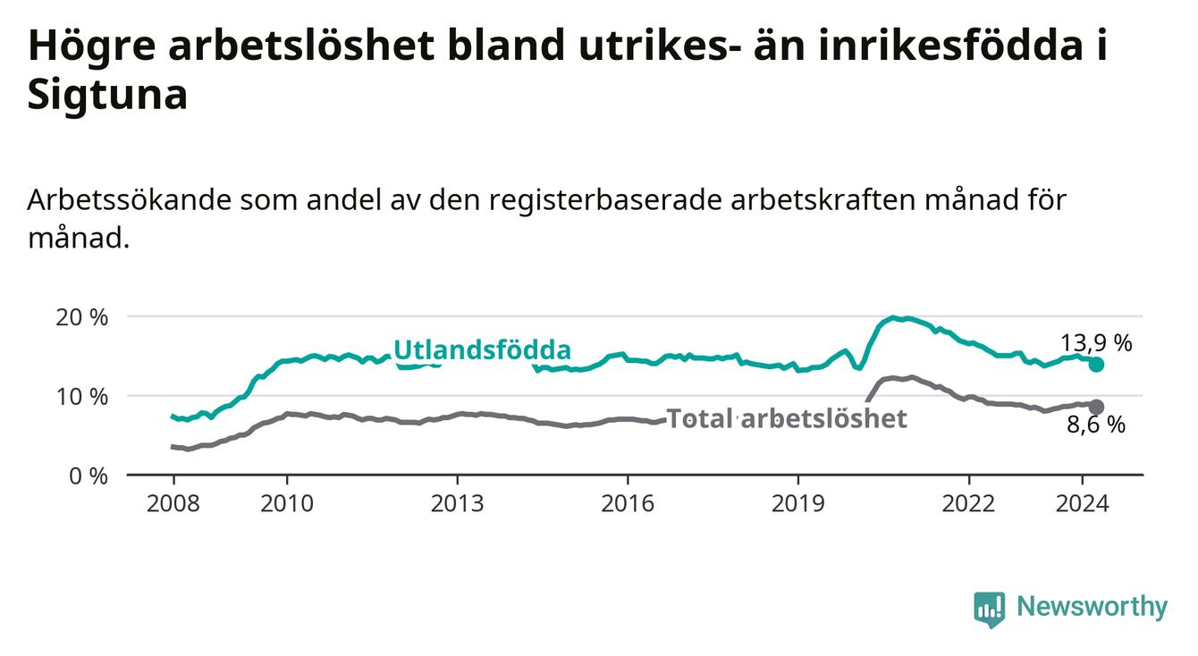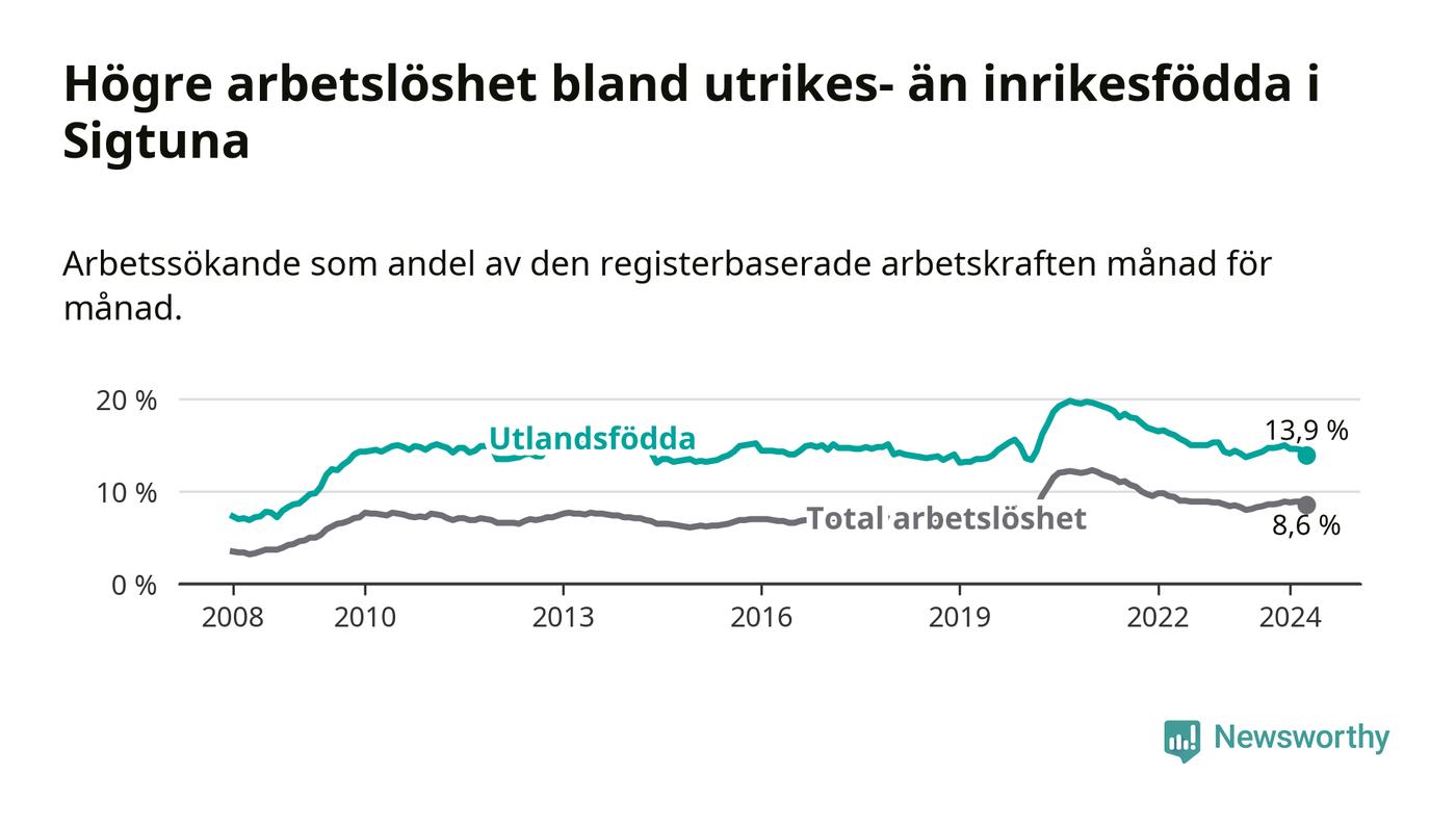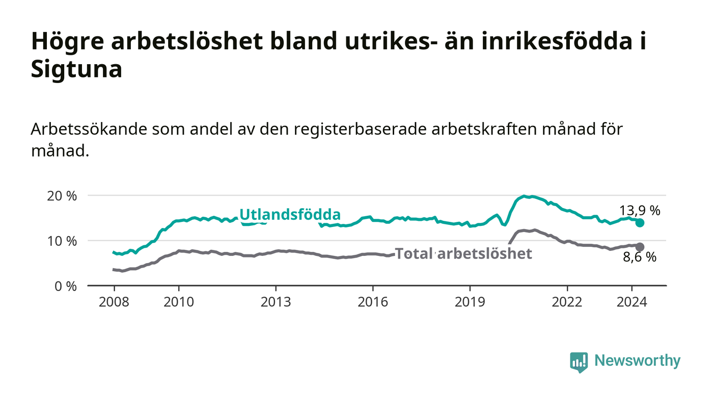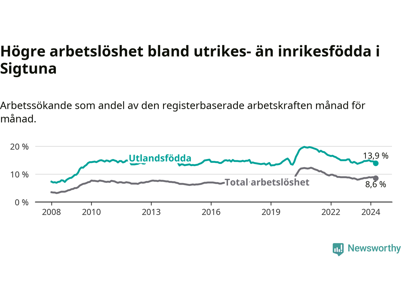 Arbetslösheten bland utlandsfödda var 13,9 procent i Sigtuna under april månad, motsvarande 1 722 av 12 388 personer. Det är 0,2 procentenheter färre än vid samma tidpunkt i fjol (+76 om man räknar personer). Den senaste månadens nedgång innebär ett trendbrott. Under de tre föregående månaderna hade arbetslösheten bland utlandsfödda varit högre än motsvarande tidpunkt året innan.