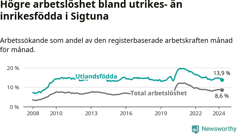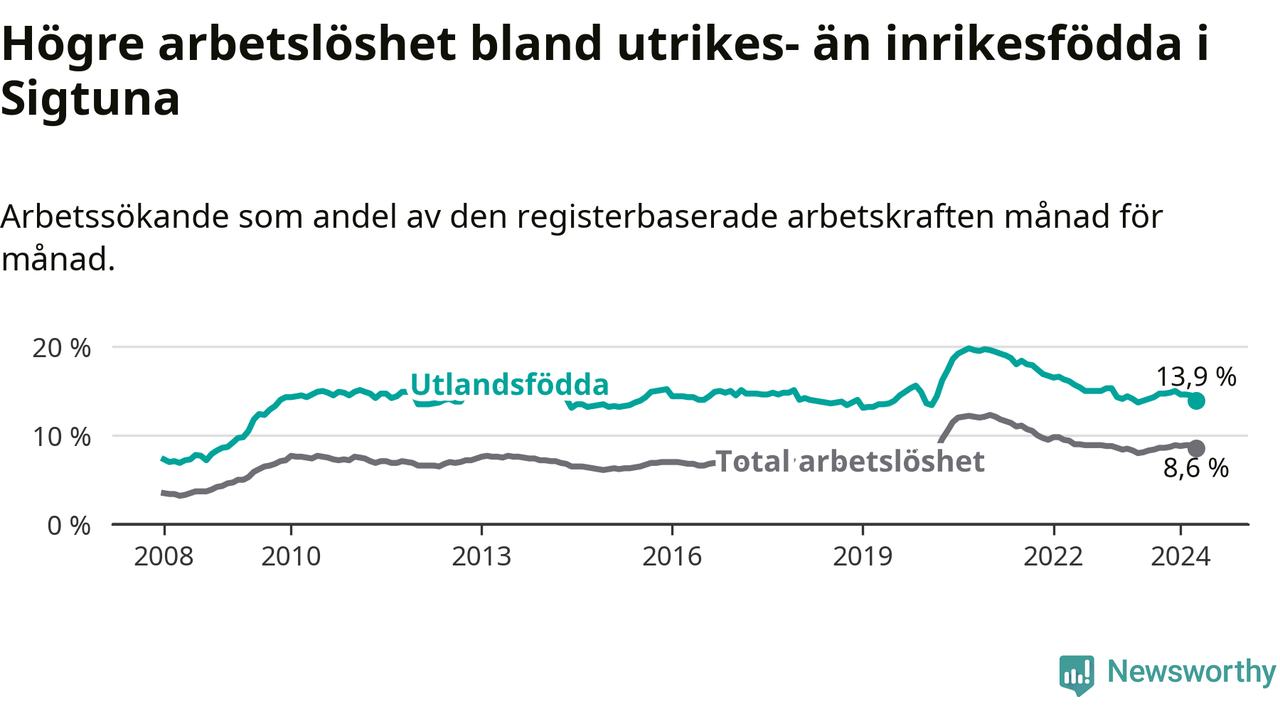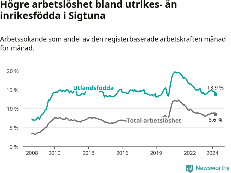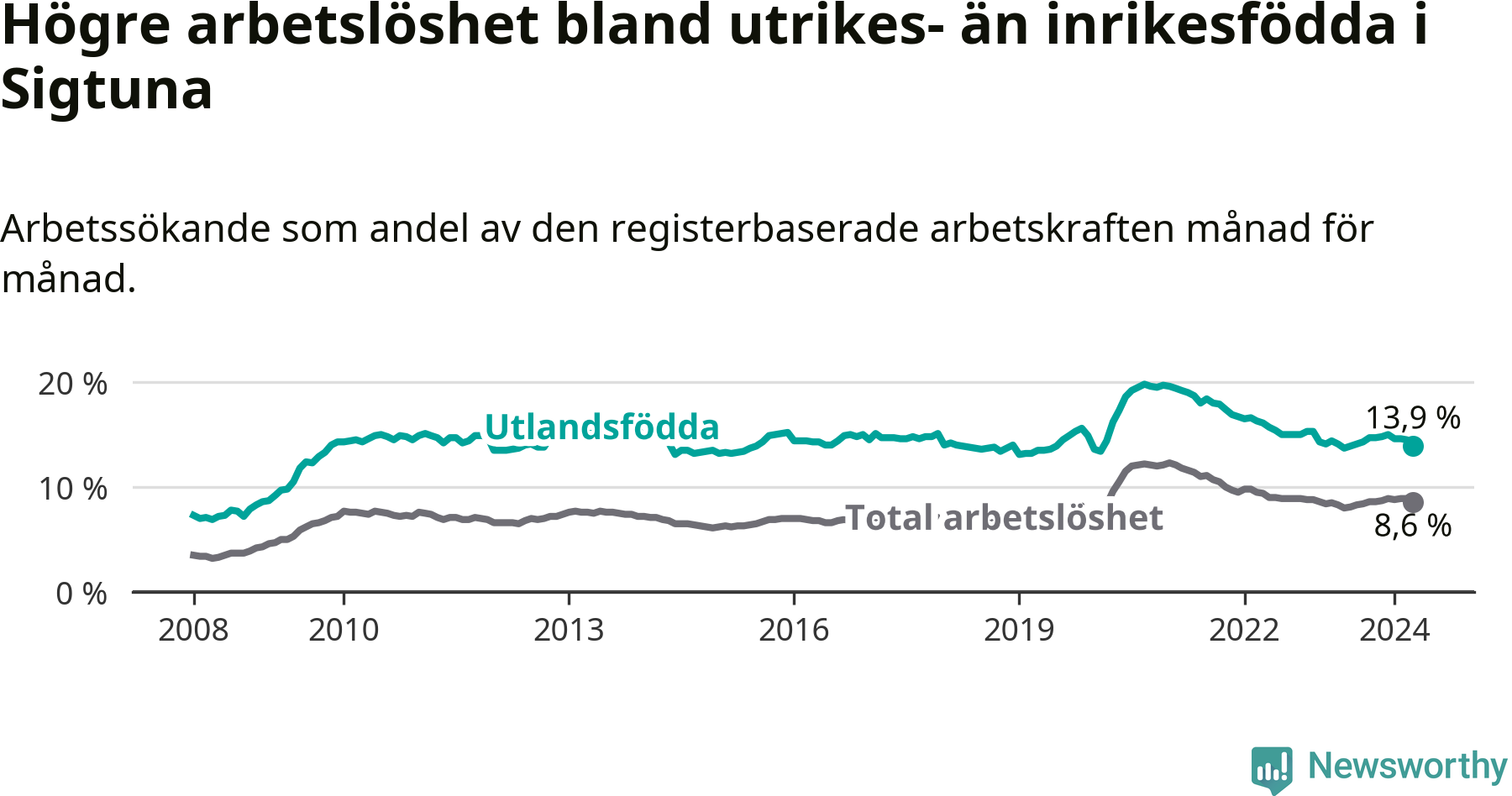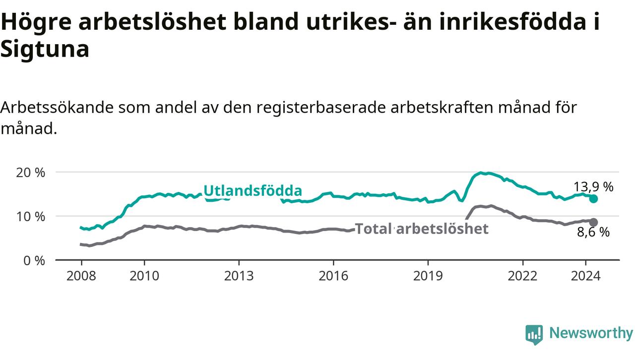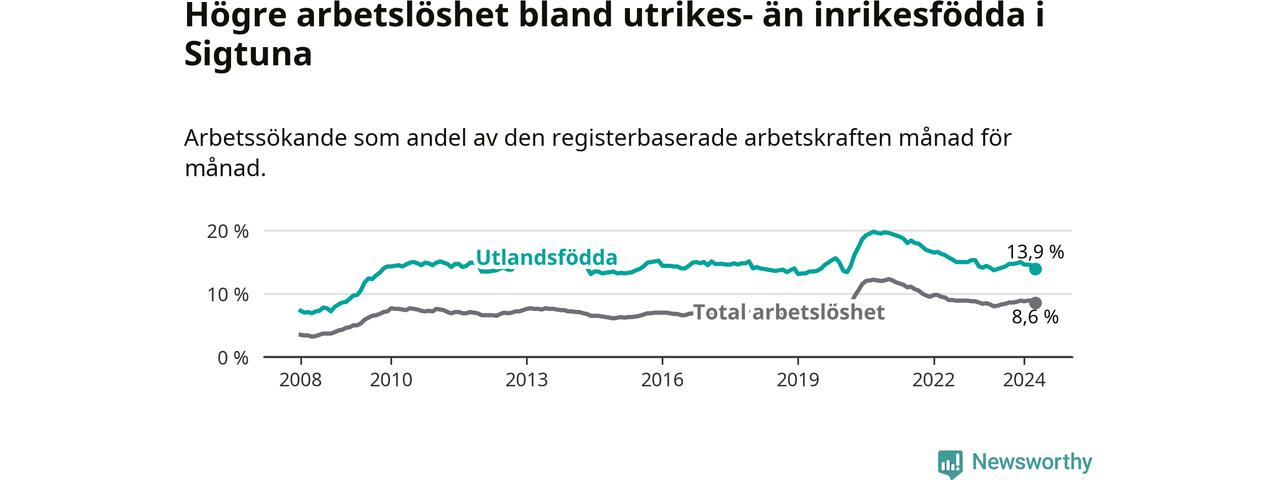 Arbetslösheten bland utlandsfödda var 13,9 procent i Sigtuna under april månad, motsvarande 1 722 av 12 388 personer. Det är 0,2 procentenheter färre än vid samma tidpunkt i fjol (+76 om man räknar personer). Den senaste månadens nedgång innebär ett trendbrott. Under de tre föregående månaderna hade arbetslösheten bland utlandsfödda varit högre än motsvarande tidpunkt året innan.