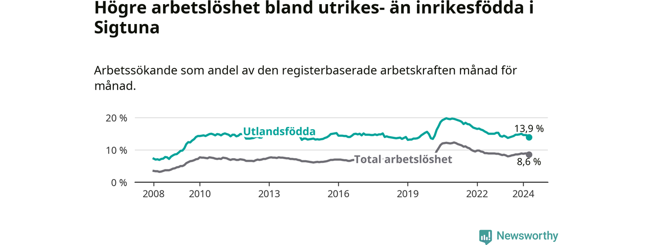 Skillnaden i arbetslöshet mellan utrikesfödda och hela befolkningen är 5,3 procentenheter i Sigtuna. Det är en mindre skillnad än för ett år sedan (−0,5 procentenheter).