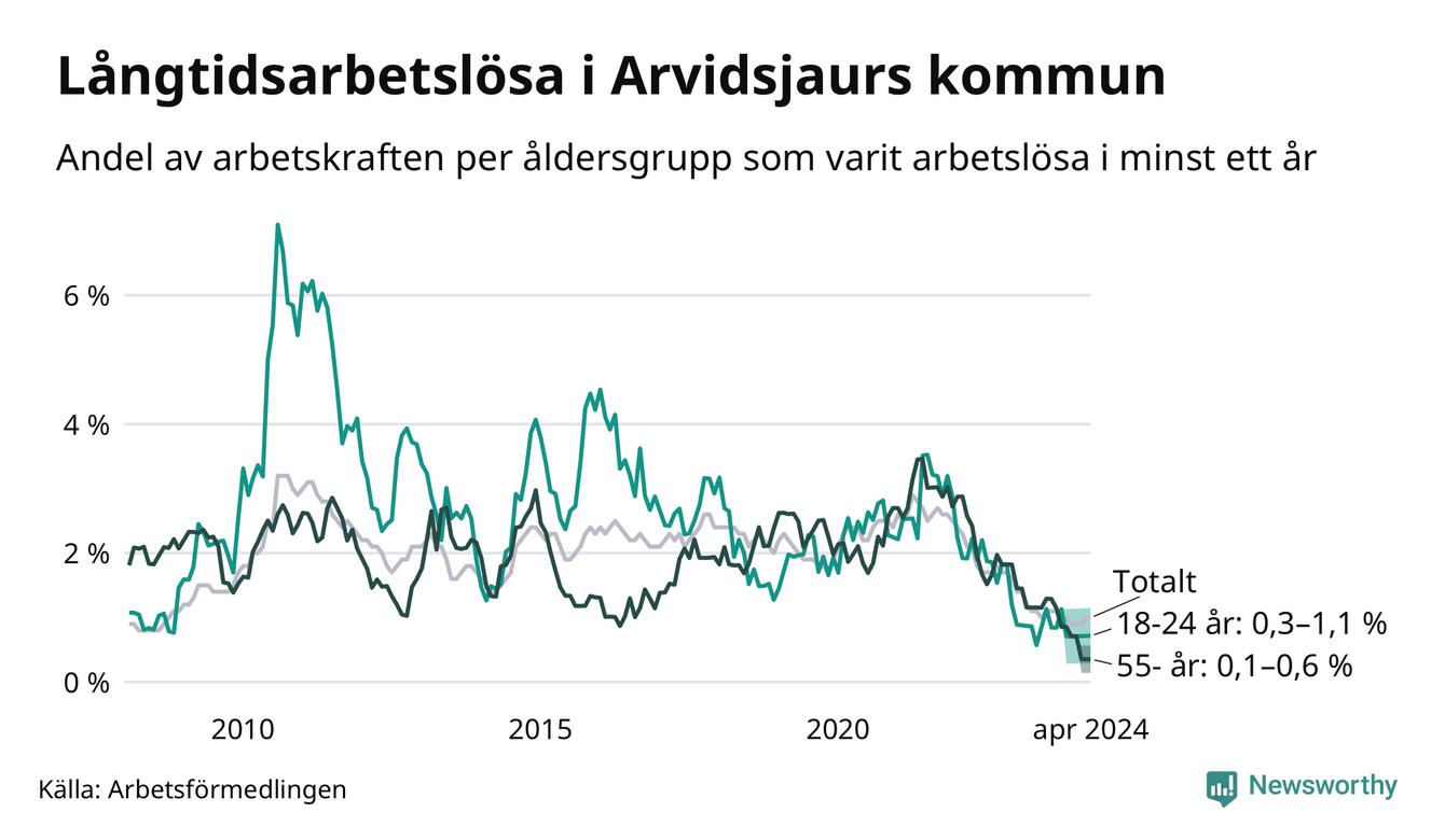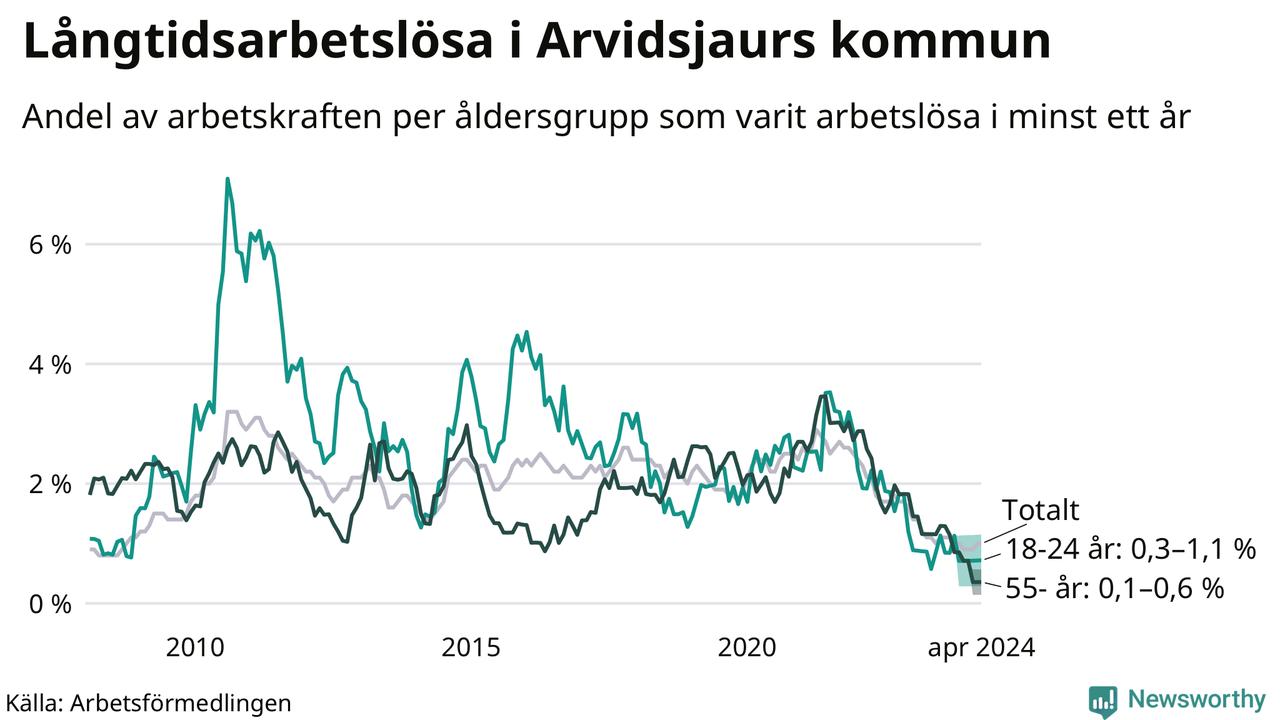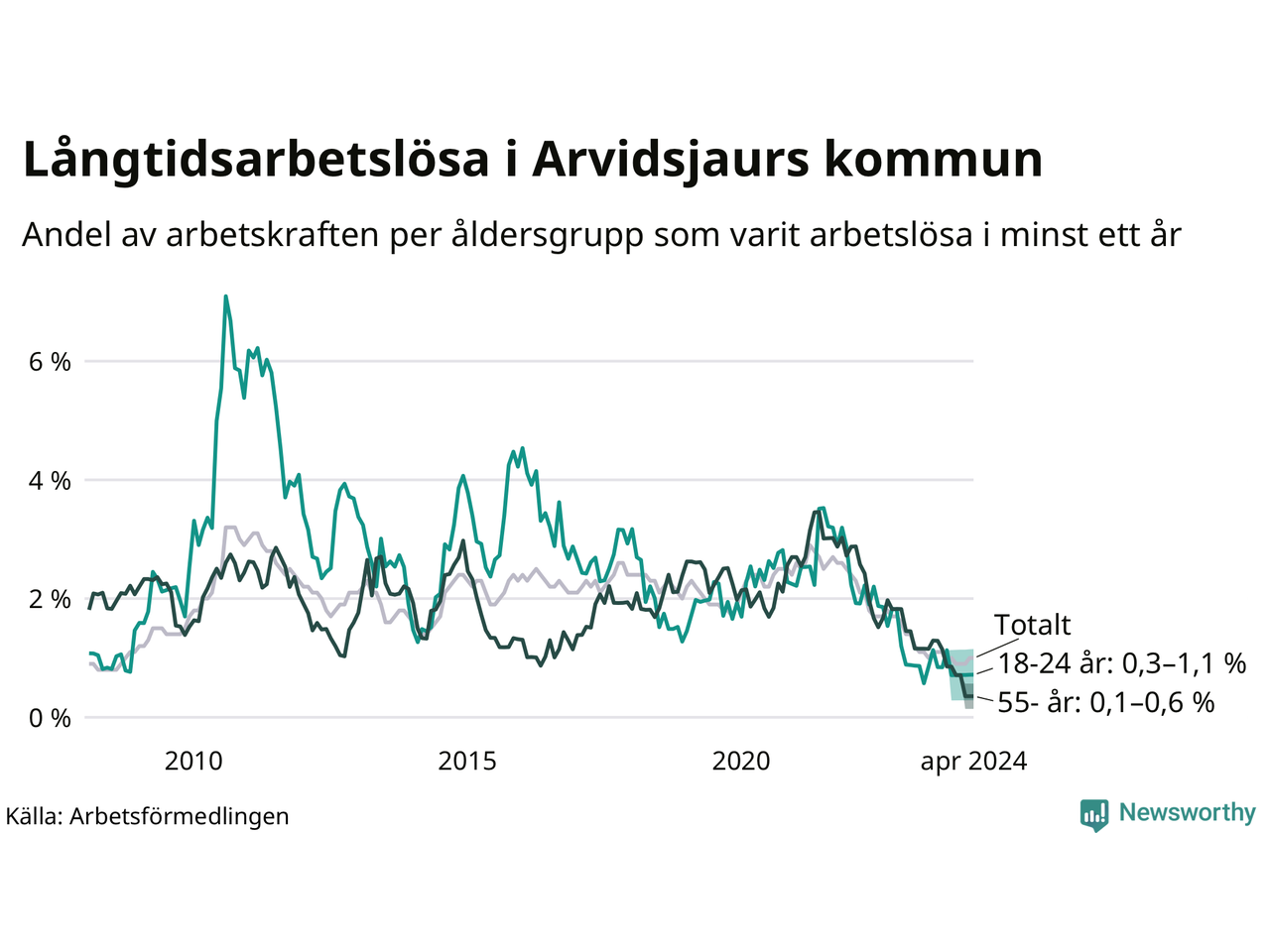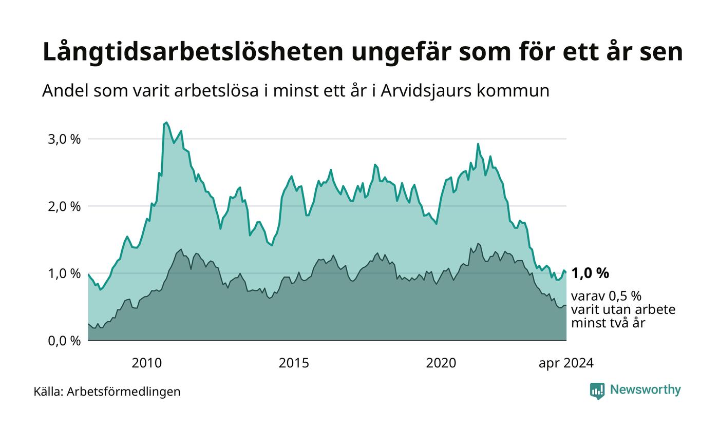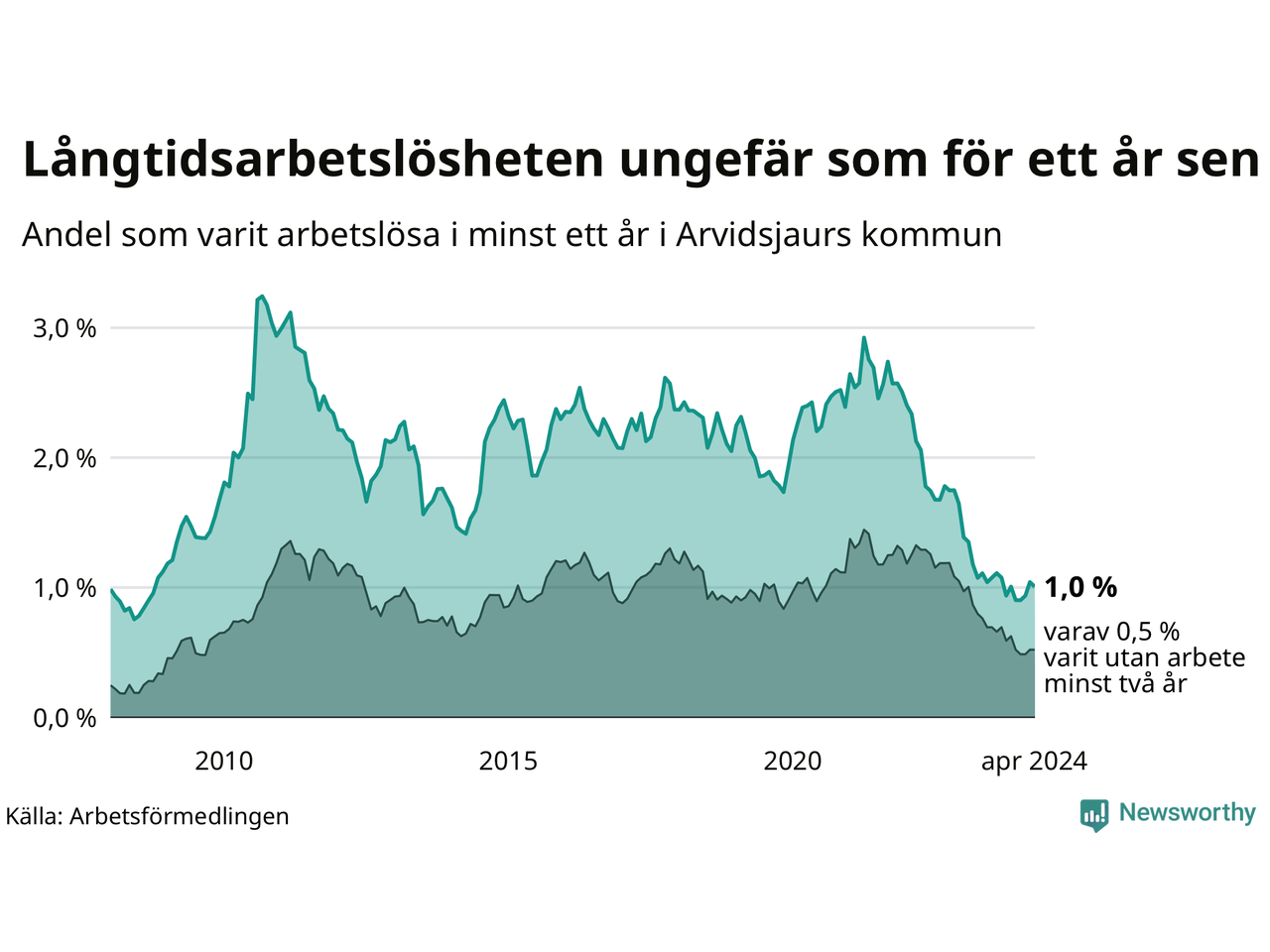 I april hade 29 Arvidsjaursbor varit arbetslösa i minst ett år, vilket är en färre än månaden innan. 29 personer motsvarar 1,0 procent av arbetskraften i kommunen – andelen långtidsarbetslösa är ungefär på samma nivå som för ett år sedan. Arvidsjaur tillhör de kommuner som har lägst andel långtidsarbetslösa i hela landet just nu.