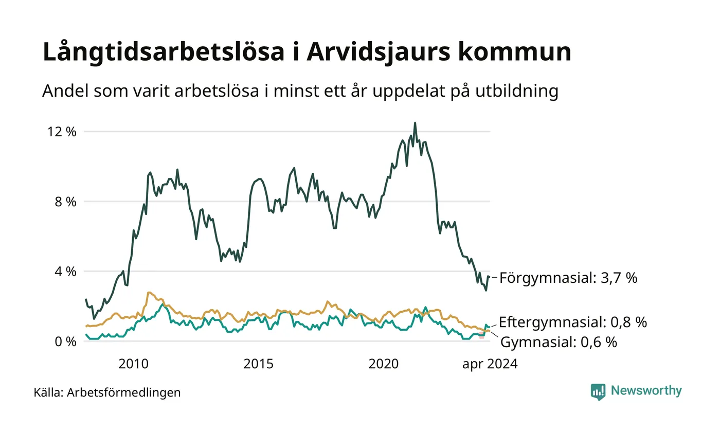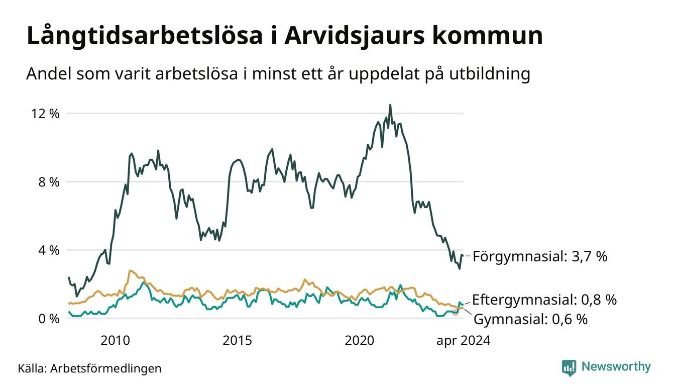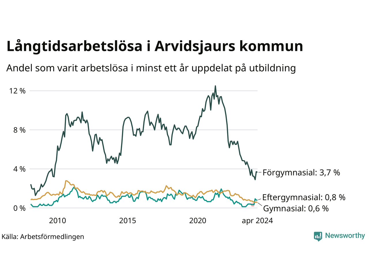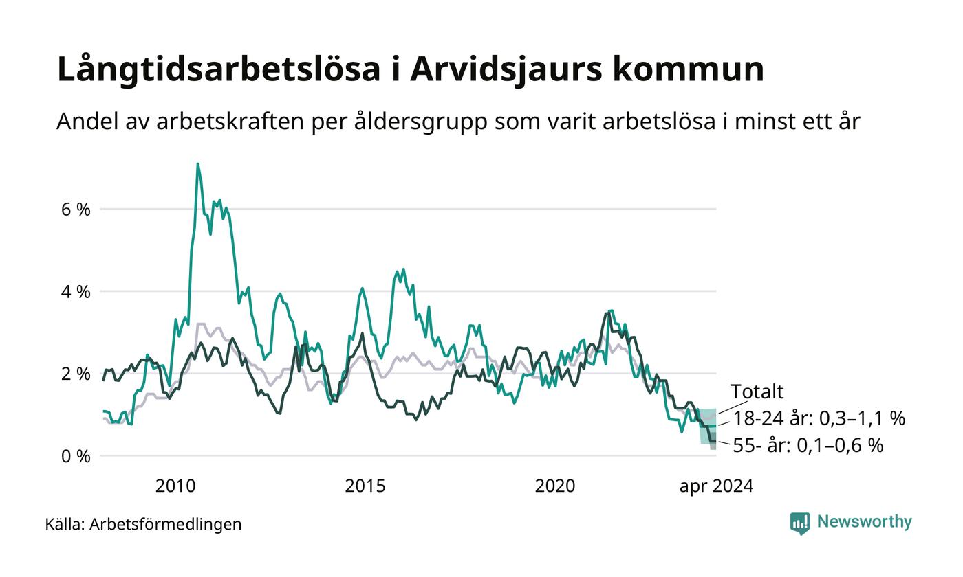 I april hade 29 Arvidsjaursbor varit arbetslösa i minst ett år, vilket är en färre än månaden innan. 29 personer motsvarar 1,0 procent av arbetskraften i kommunen – andelen långtidsarbetslösa är ungefär på samma nivå som för ett år sedan. Arvidsjaur tillhör de kommuner som har lägst andel långtidsarbetslösa i hela landet just nu.