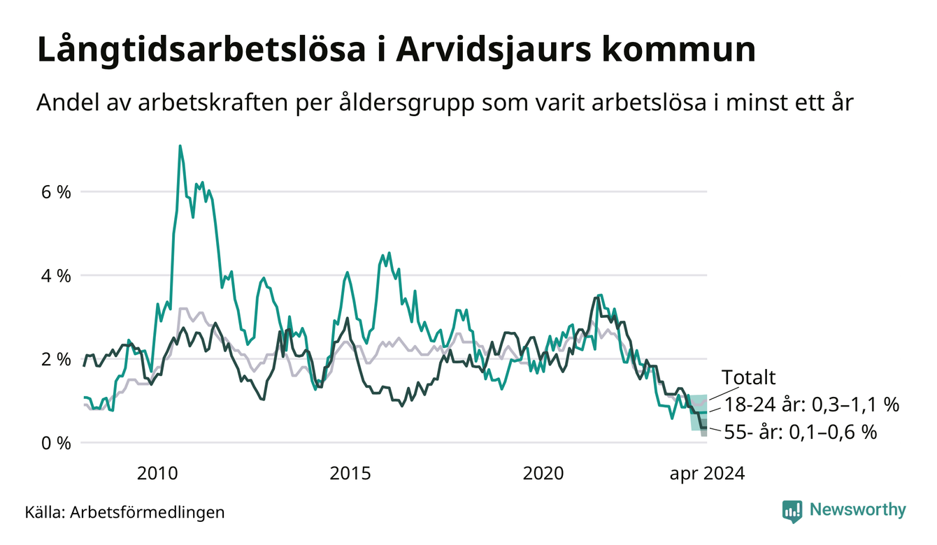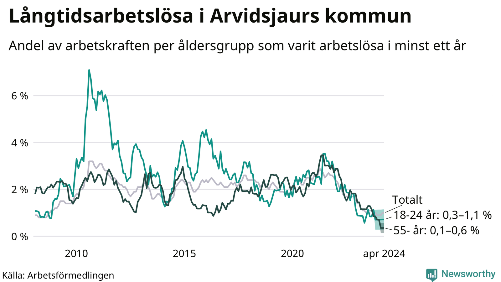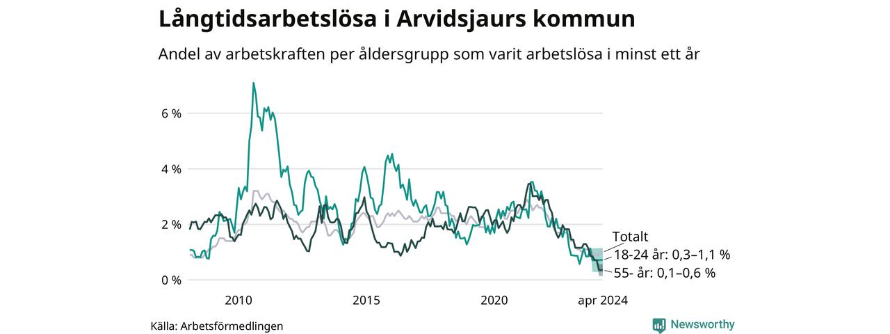 I såväl gruppen 18–24 år som bland dem mellan 55 och 65 år1 har färre än fem personer i Arvidsjaurs kommun varit arbetslösa i mer än ett år. Det motsvarar någonstans mellan 0,3 och 1,1 respektive 0,1 och 0,6 procent.