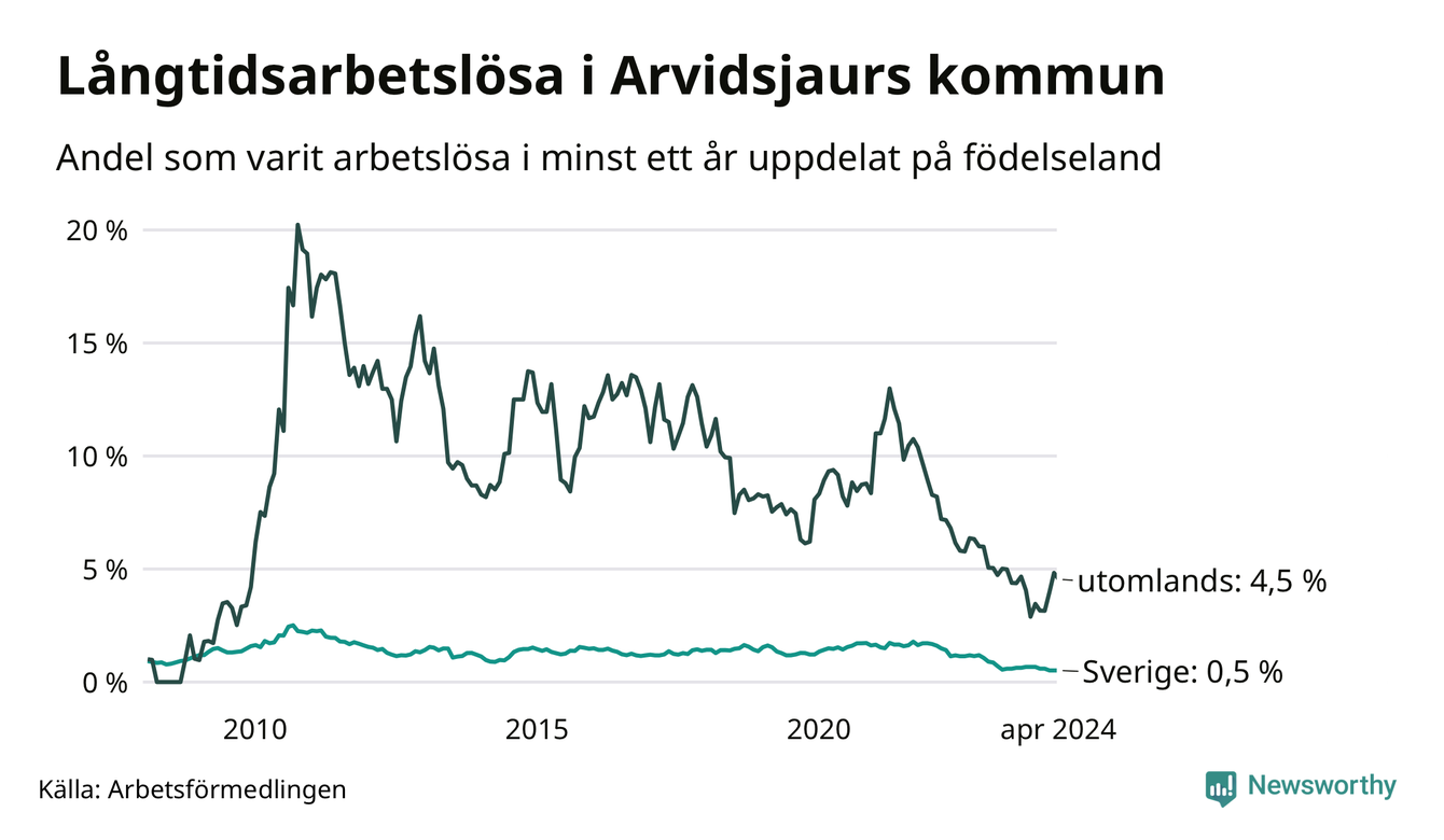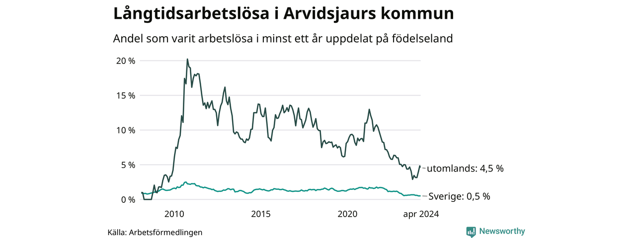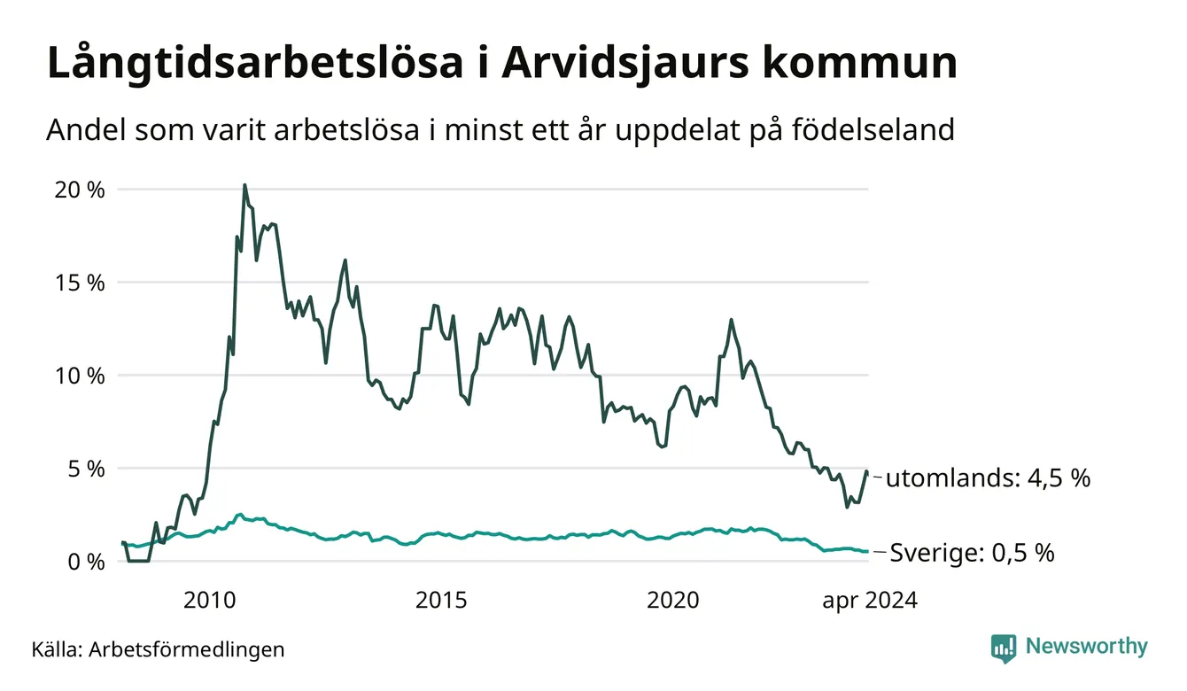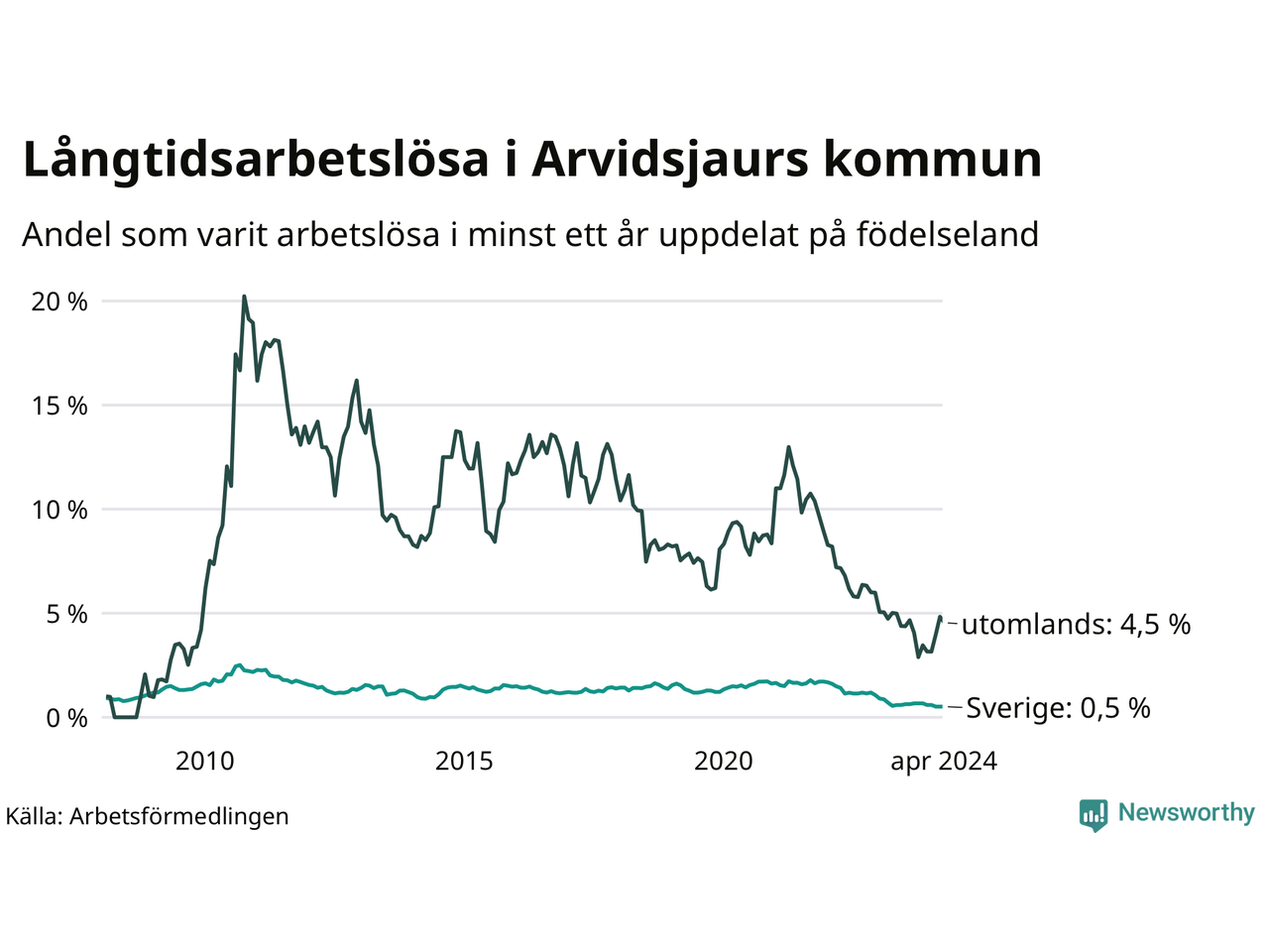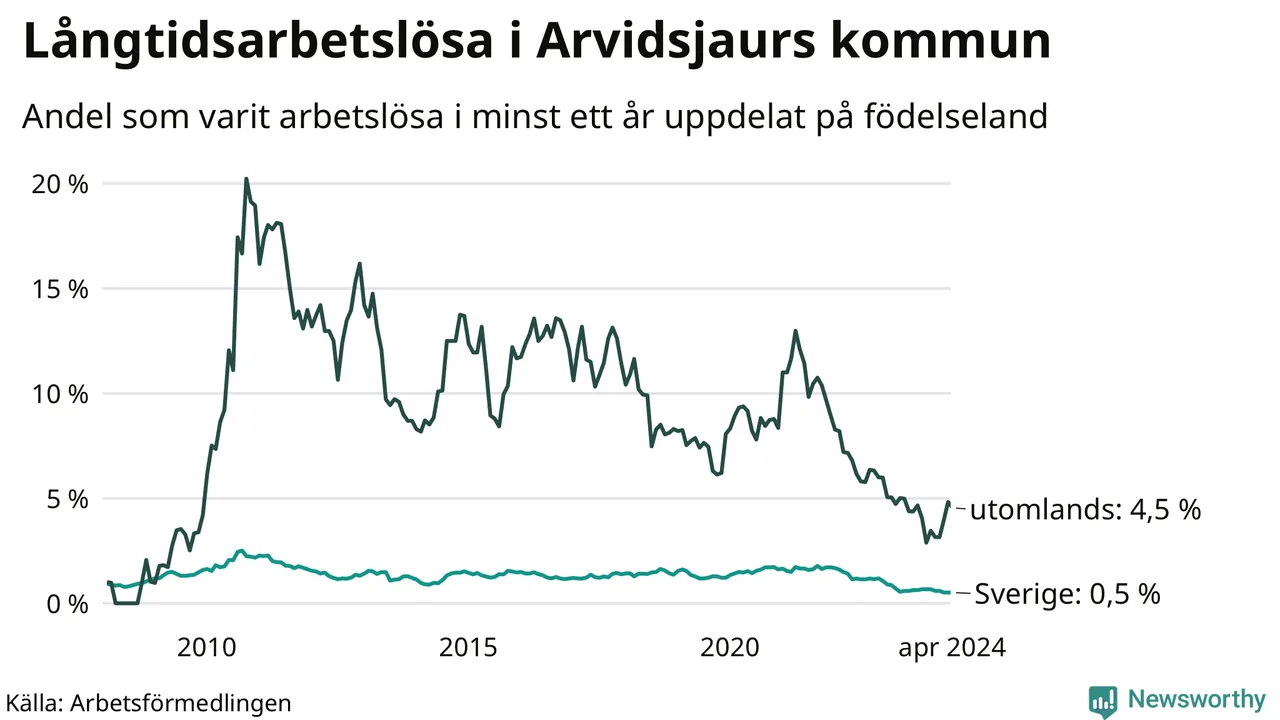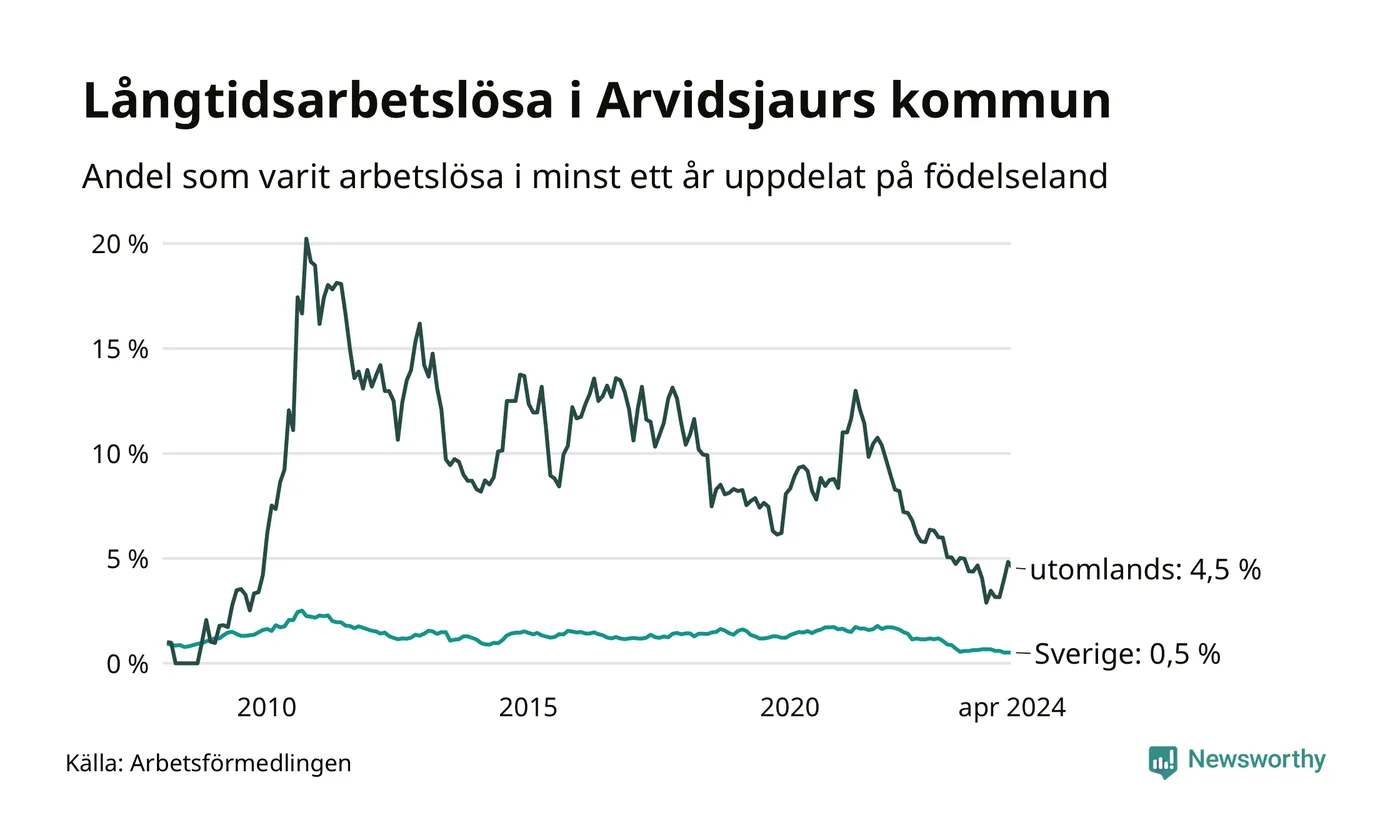 13 av de långtidsarbetslösa i Arvidsjaur är födda i Sverige, medan 16 är födda utomlands. Det innebär att långtidsarbetslösheten bland Sverigefödda är 0,5 procent, medan den är nio gånger så hög – 4,5 procent – bland födda utomlands. Även i riket som helhet är arbetslösheten högre bland utrikesfödda.