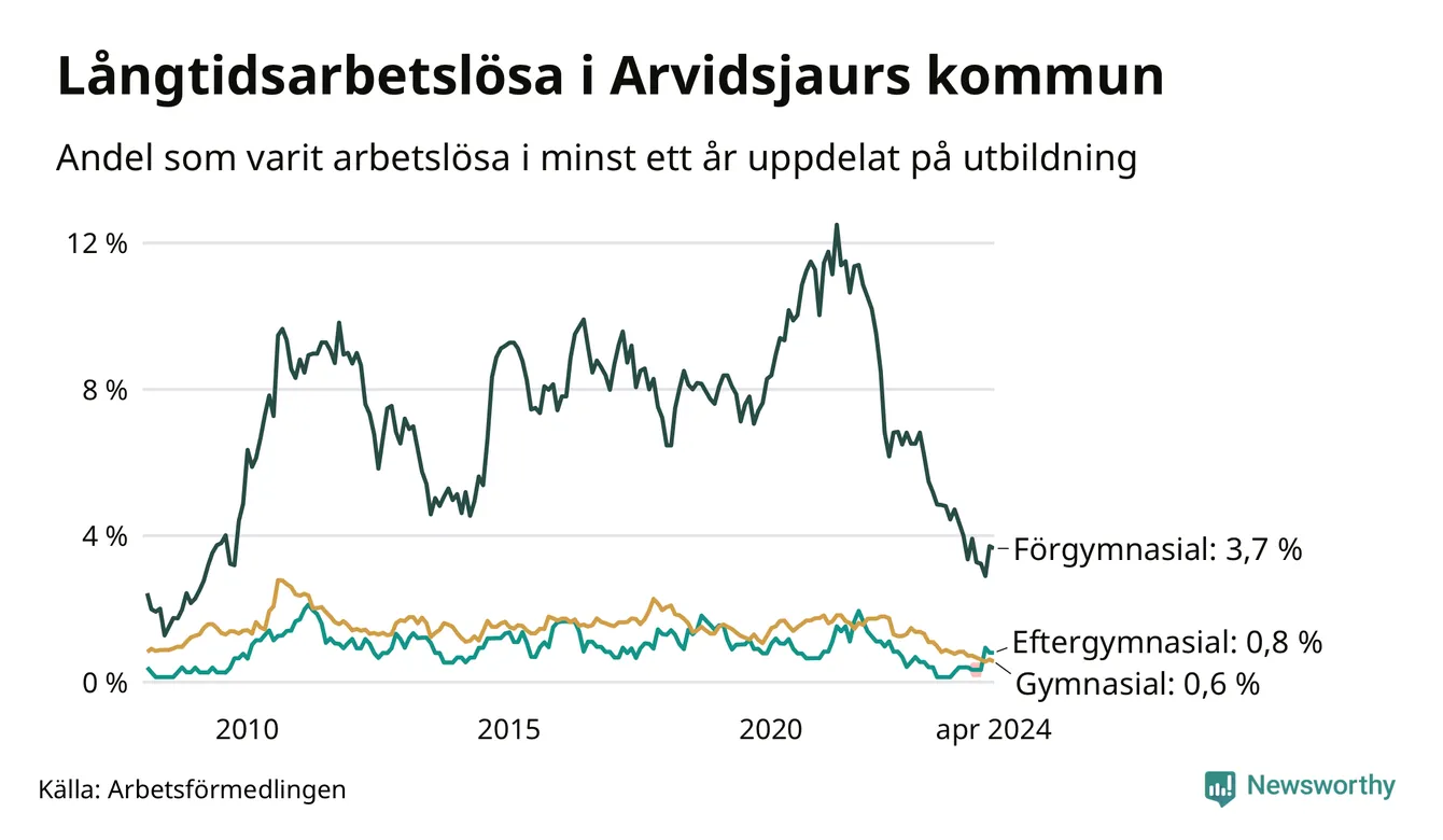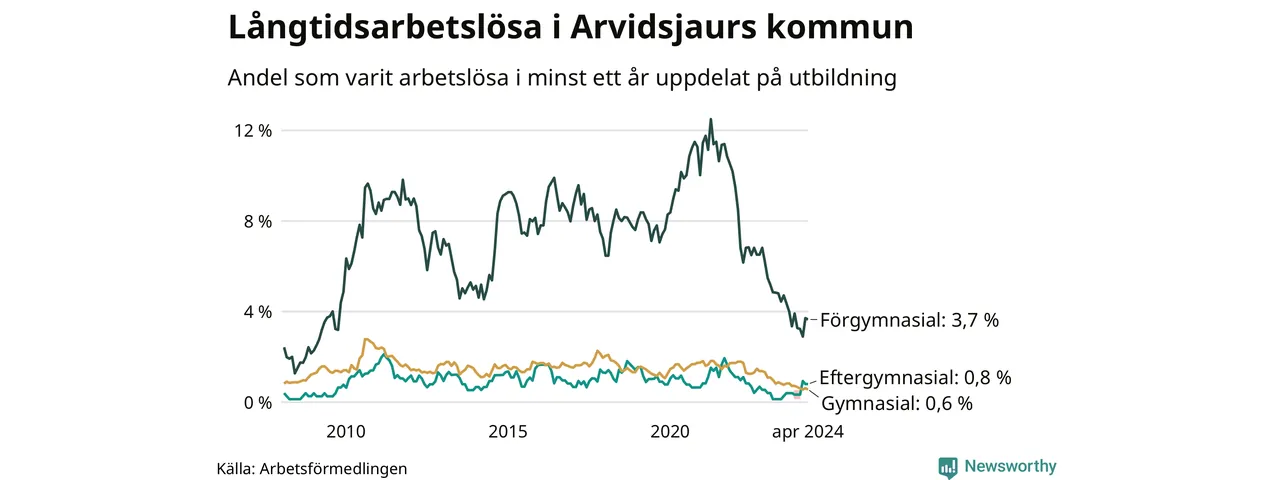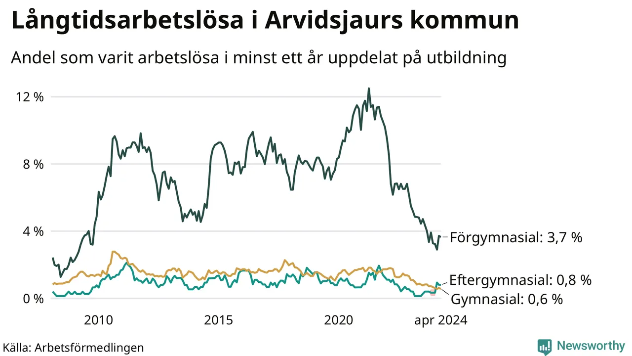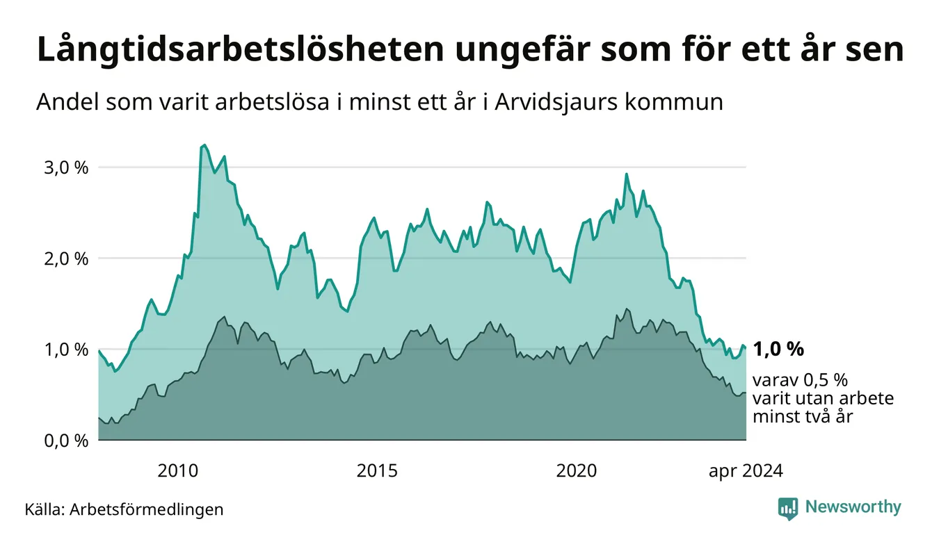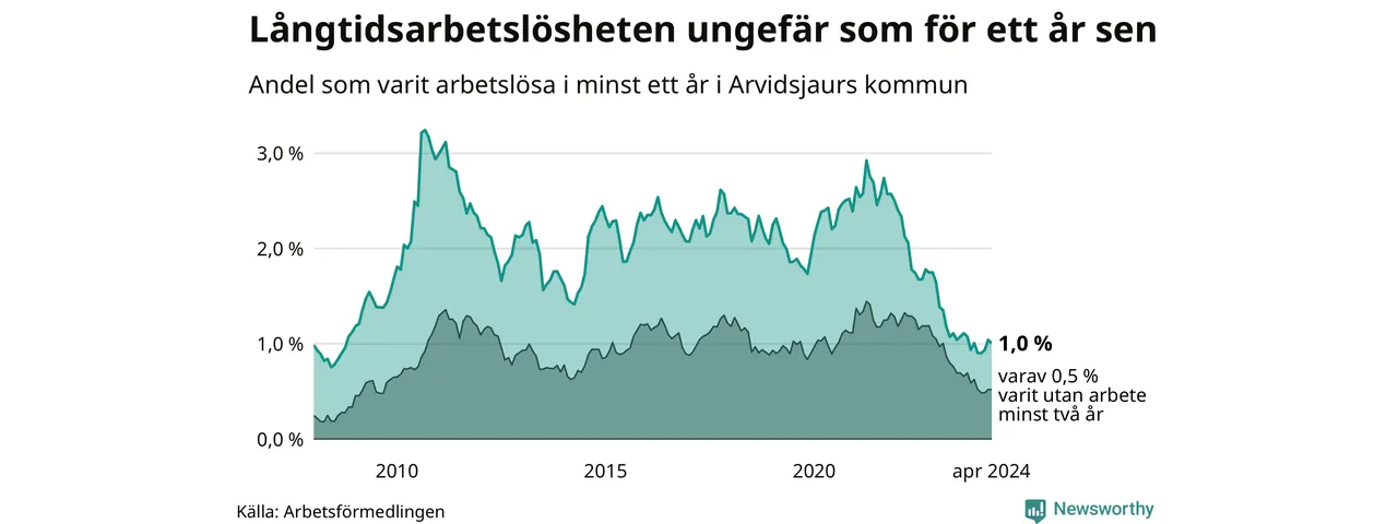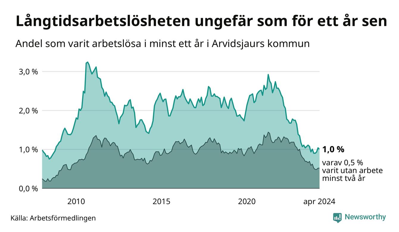 Andelen som varit utan arbete i minst ett år i Arvidsjaur var ungefär lika stor i april jämfört med samma månad för ett år sedan. Det visar Arbetsfömedlingens senaste månadsstatistik.