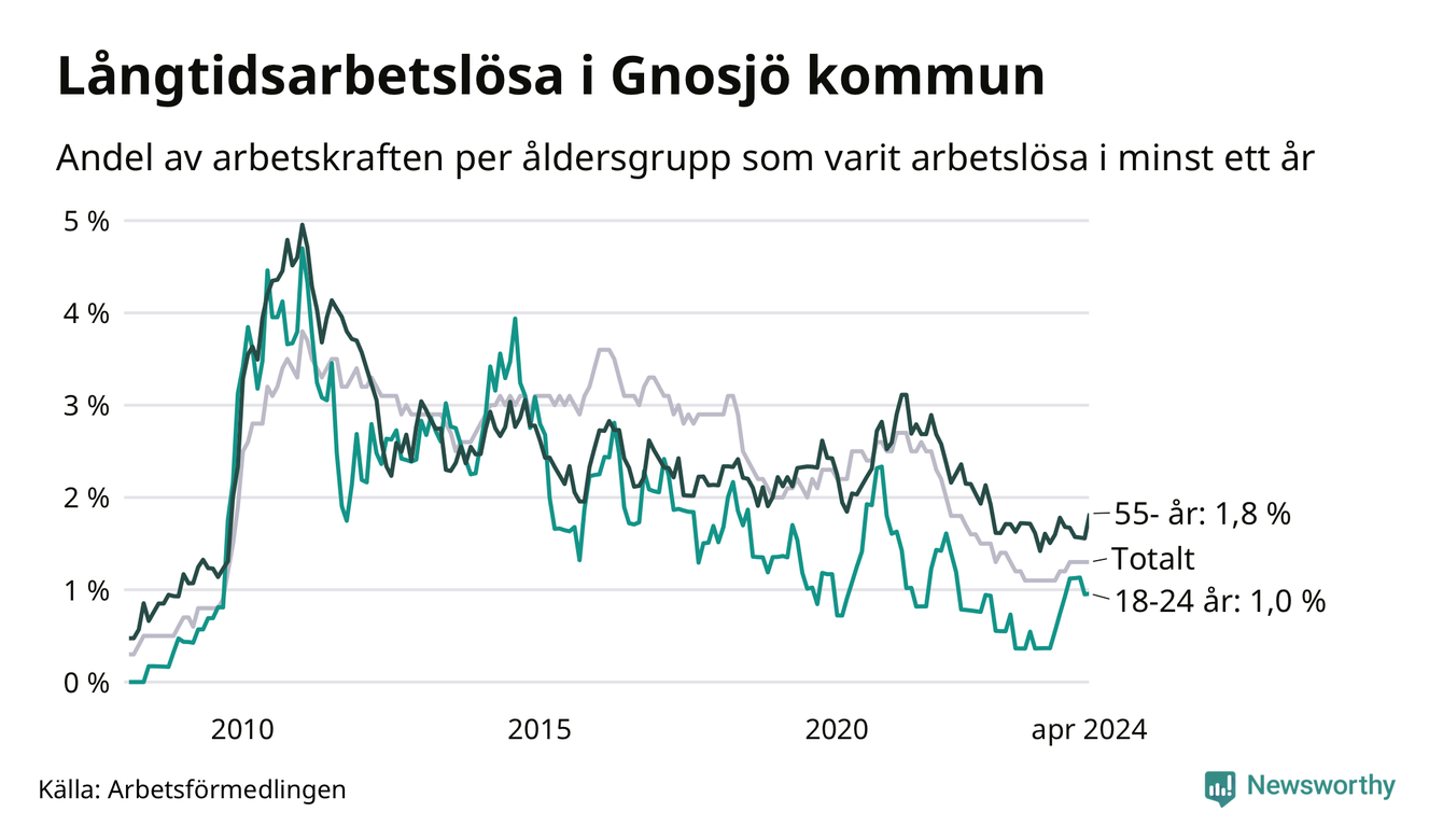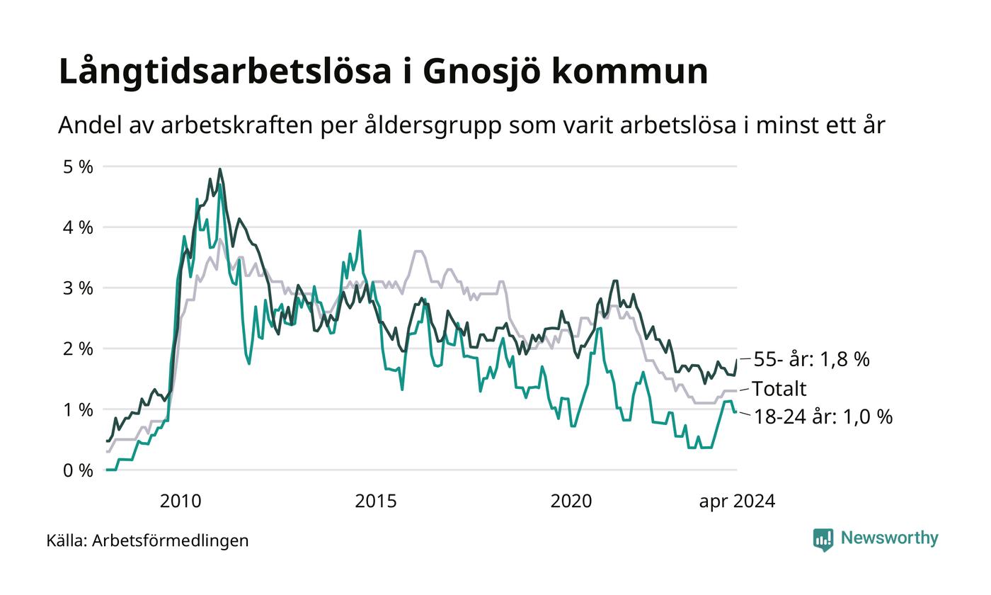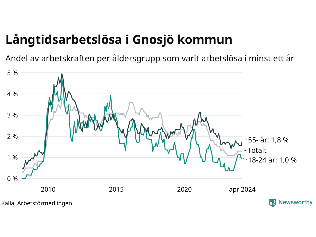 Av de 62 personerna som varit arbetslösa i mer än ett år i Gnosjö kommun är 20 personer mellan 55 och 651 år och fem är mellan 18 och 24 år. För den äldre gruppen är andelen arbetslösa 1,8 procent medan den i den yngre gruppen är 1,0 procent. Även i riket som helhet är långtidsarbetslösheten högre i gruppen äldre.