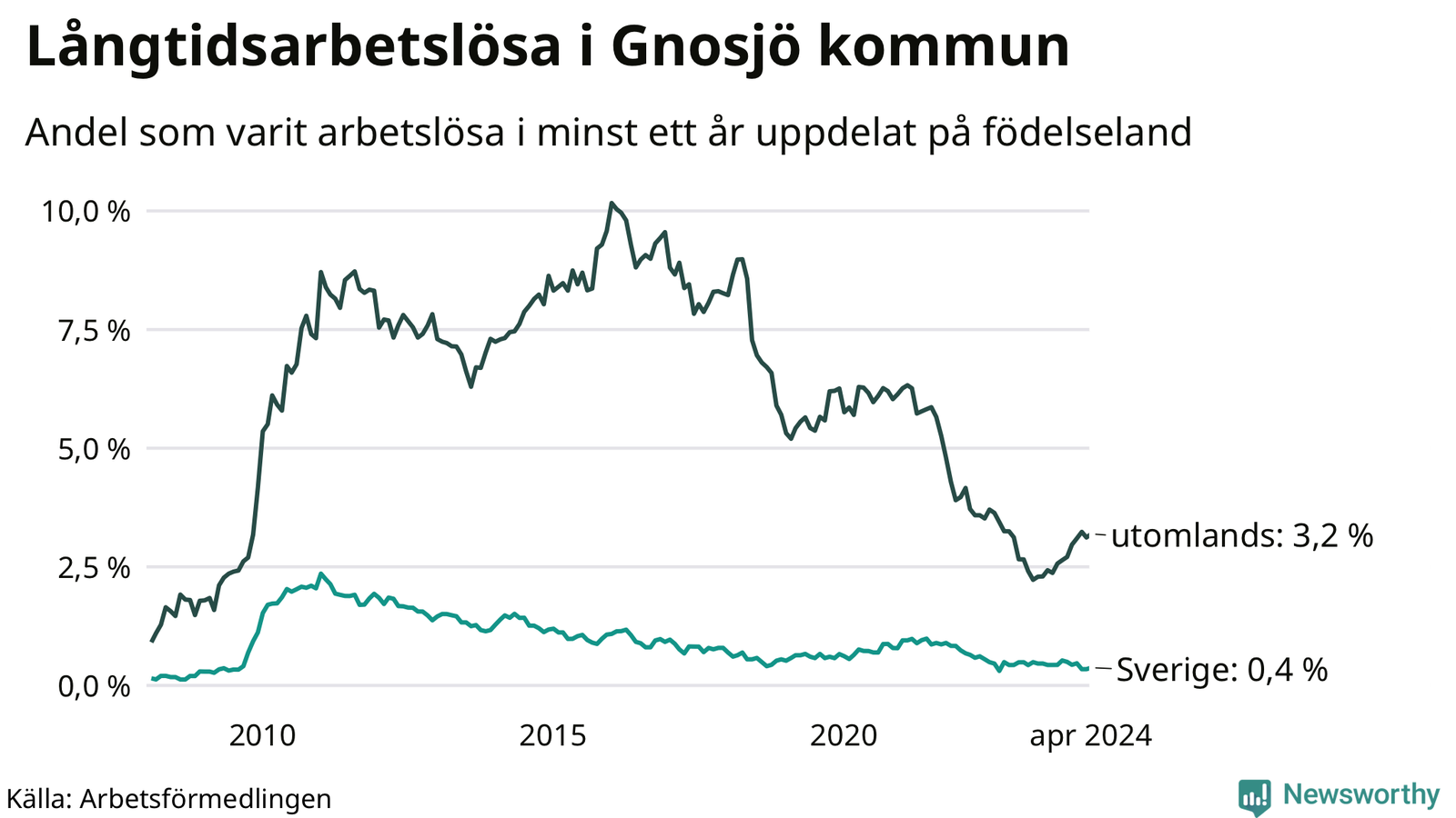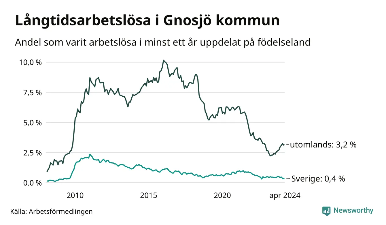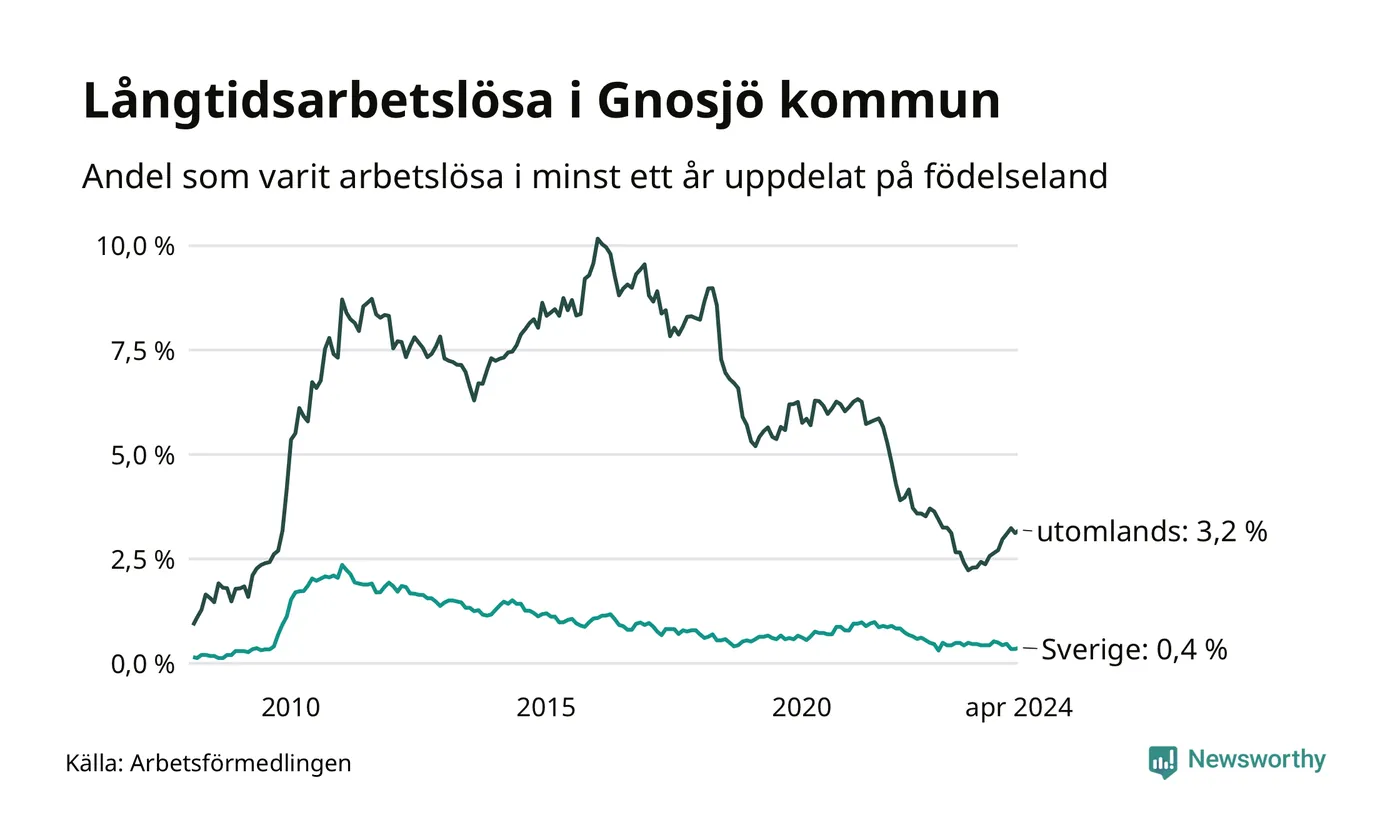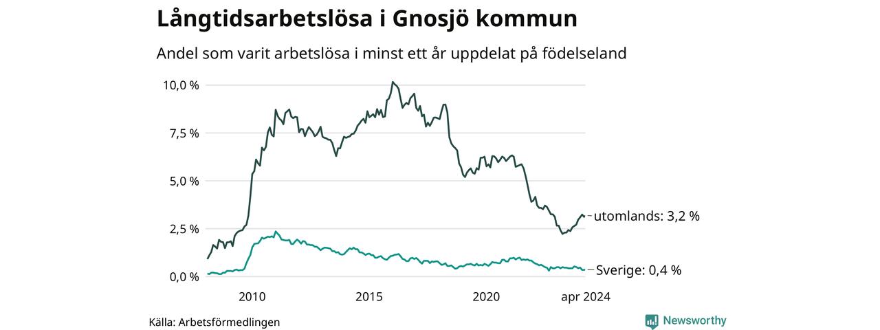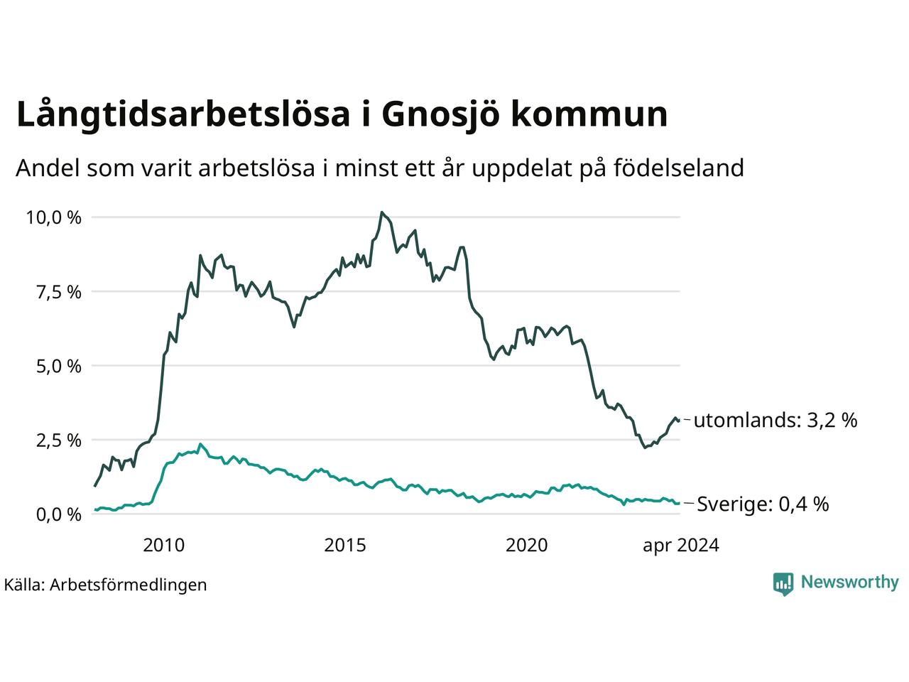 Tolv av de långtidsarbetslösa i Gnosjö är födda i Sverige, medan 50 är födda utomlands. Det innebär att långtidsarbetslösheten bland Sverigefödda är 0,4 procent, medan den är åtta gånger så hög – 3,2 procent – bland födda utomlands. Även i riket som helhet är arbetslösheten högre bland utrikesfödda.