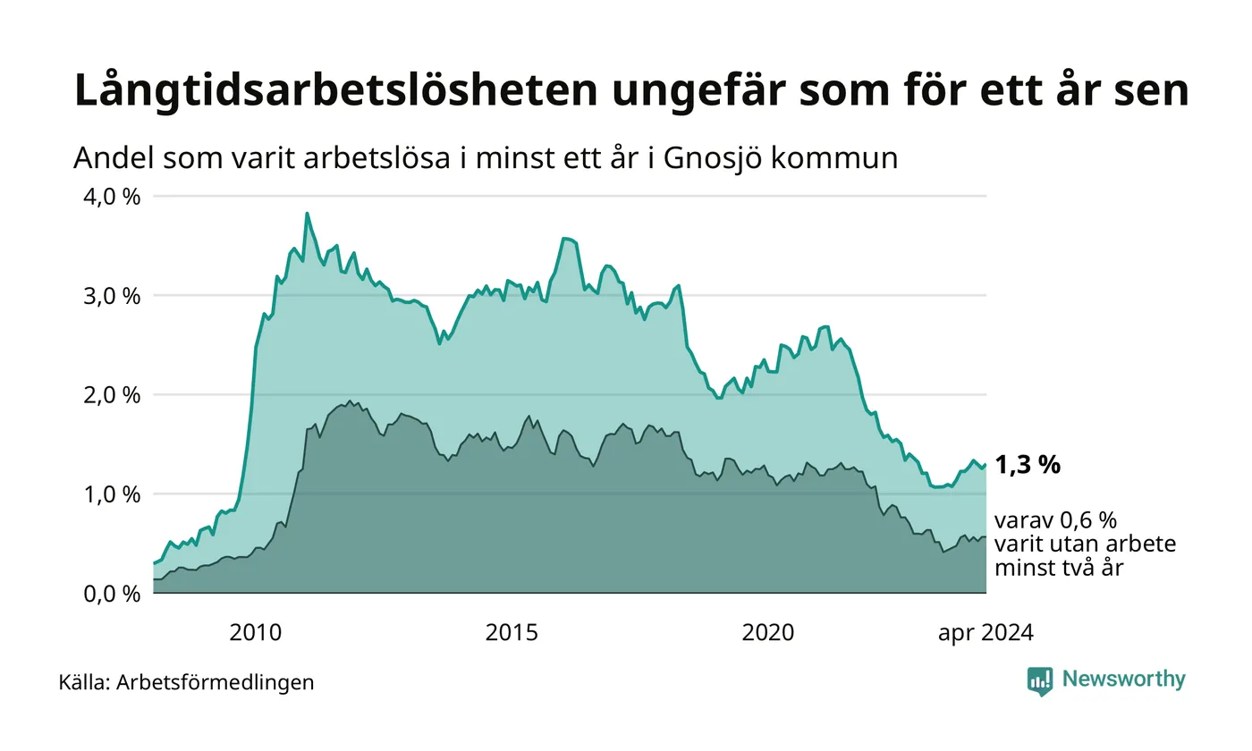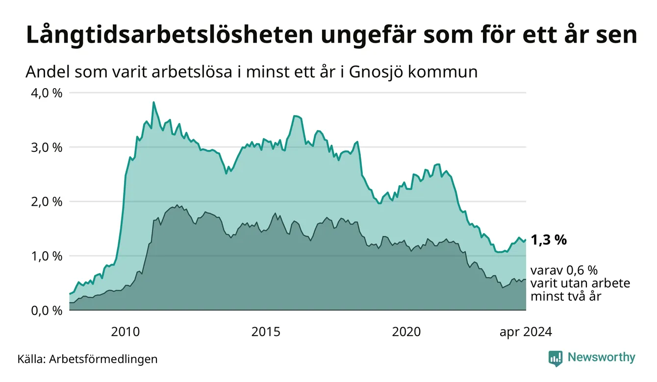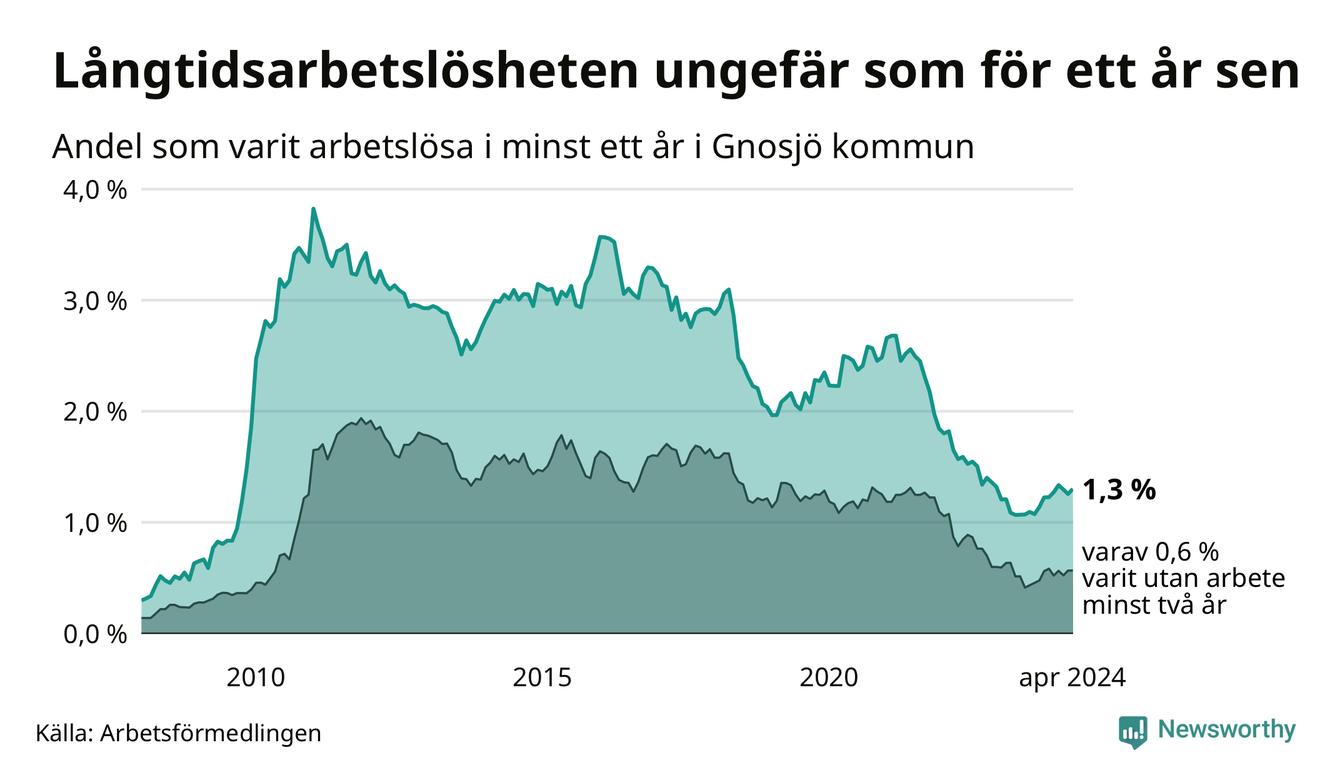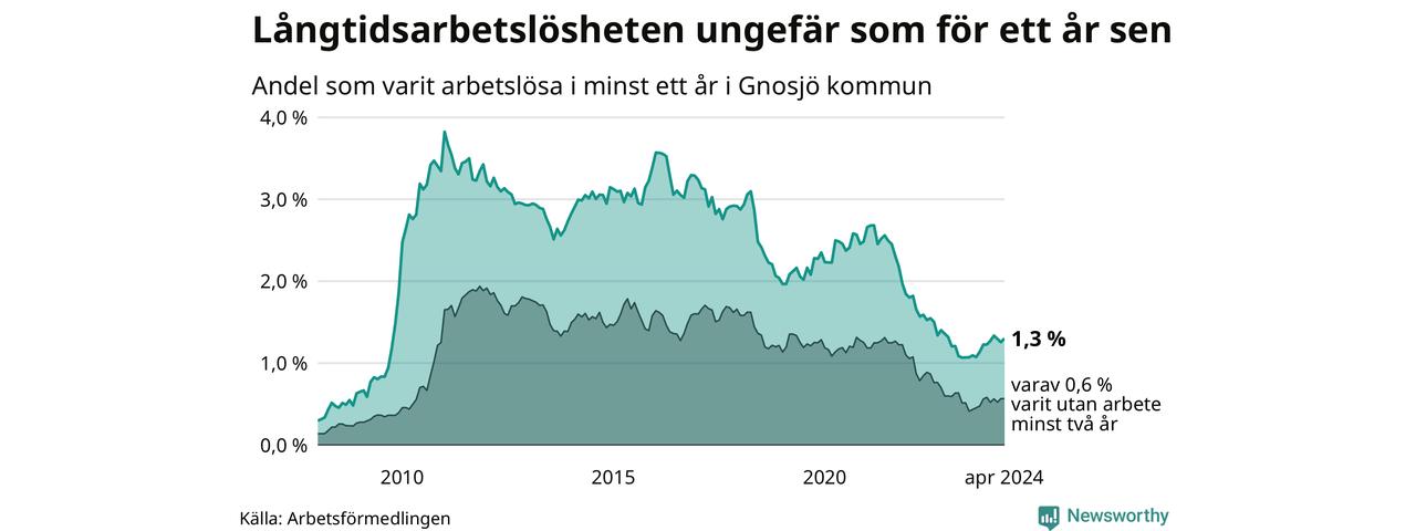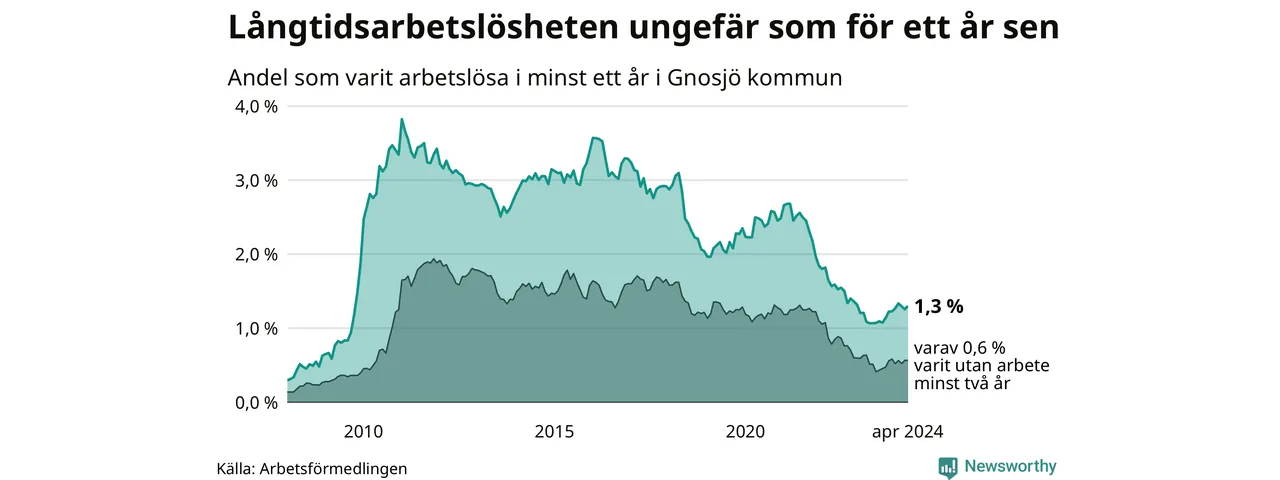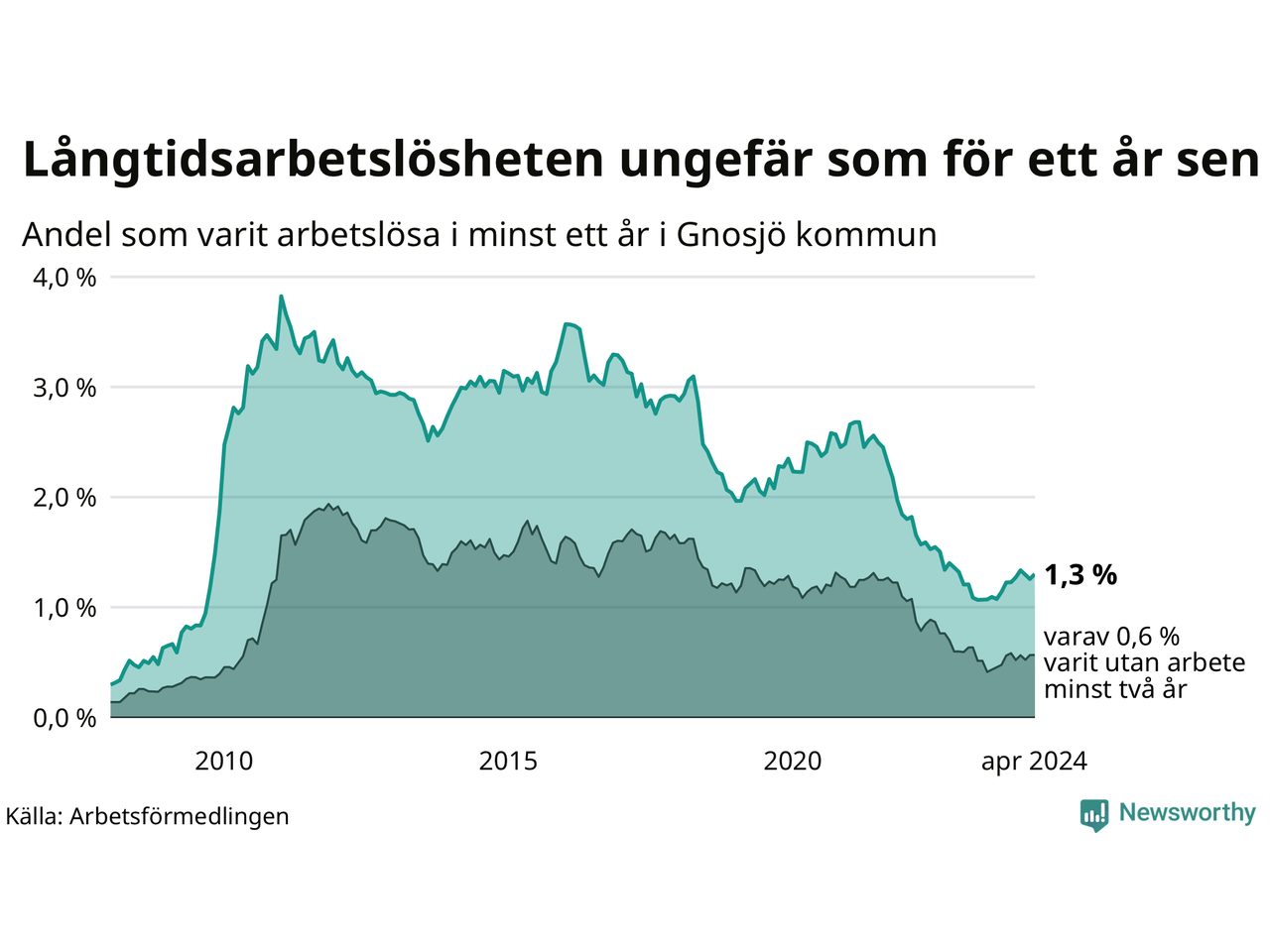 Andelen som varit utan arbete i minst ett år i Gnosjö var ungefär lika stor i april jämfört med samma månad för ett år sedan. Det visar Arbetsfömedlingens senaste månadsstatistik.