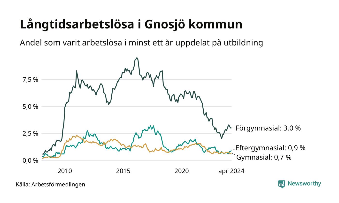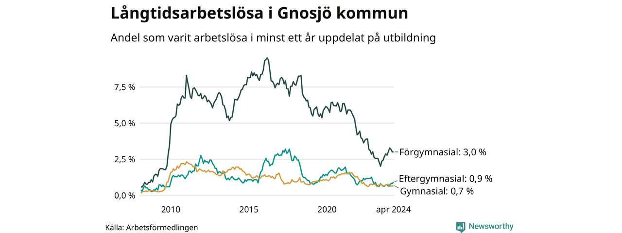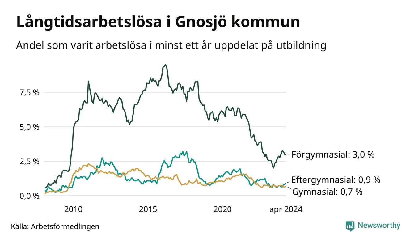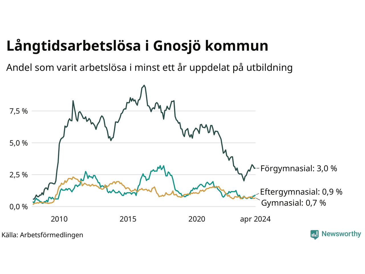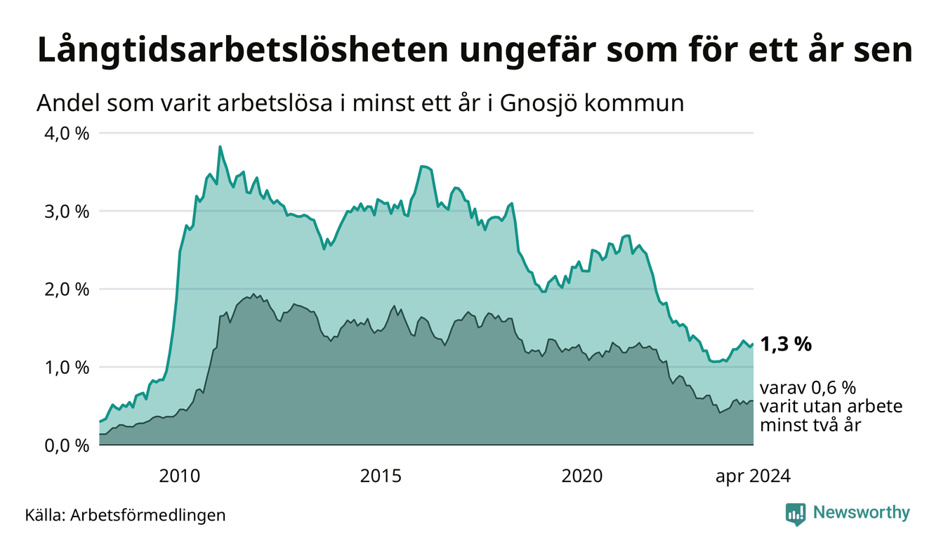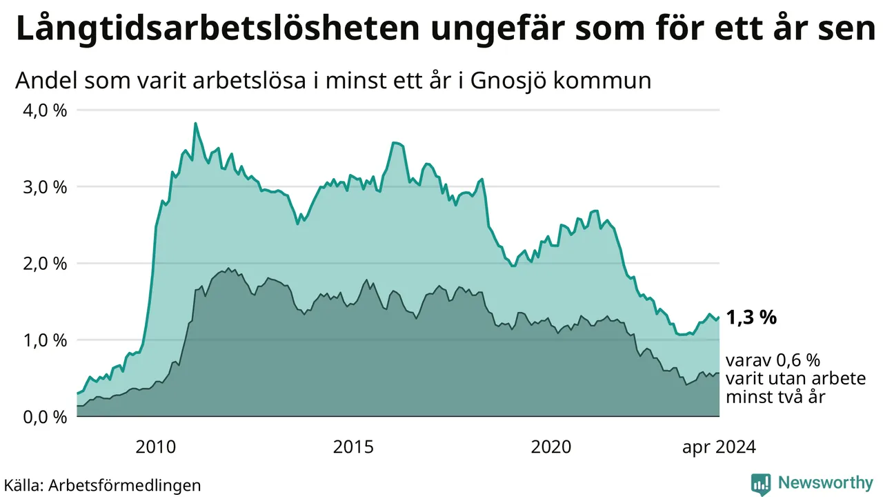 Andelen som varit utan arbete i minst ett år i Gnosjö var ungefär lika stor i april jämfört med samma månad för ett år sedan. Det visar Arbetsfömedlingens senaste månadsstatistik.
