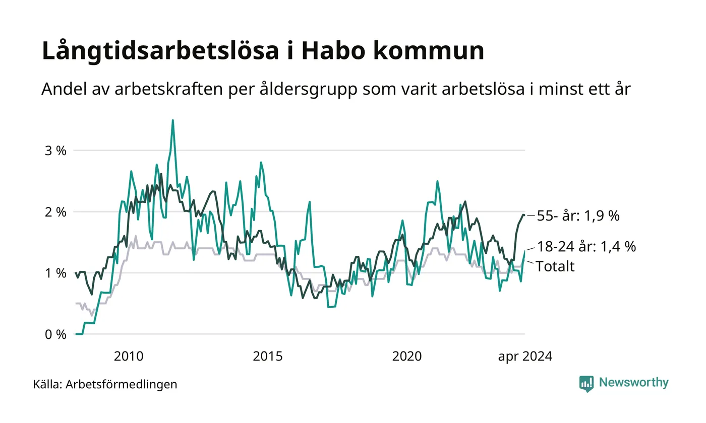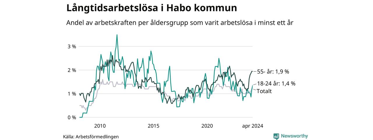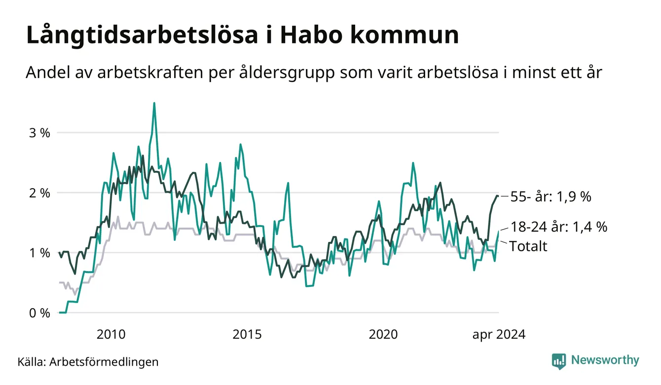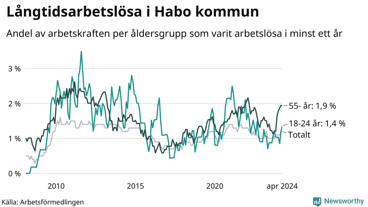 Av de 82 personerna som varit arbetslösa i mer än ett år i Habo kommun är 23 personer mellan 55 och 651 år och åtta är mellan 18 och 24 år. För den äldre gruppen är andelen arbetslösa 1,9 procent medan den i den yngre gruppen är 1,4 procent. Även i riket som helhet är långtidsarbetslösheten högre i gruppen äldre.
