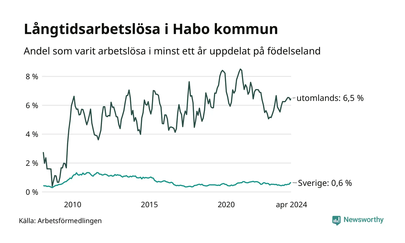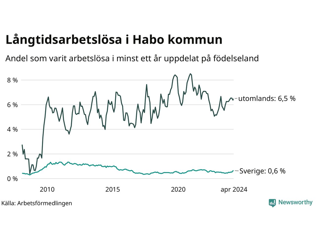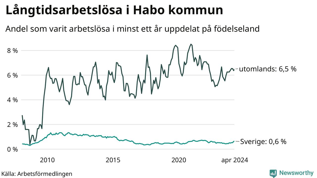 38 av de långtidsarbetslösa i Habo är födda i Sverige, medan 44 är födda utomlands. Det innebär att långtidsarbetslösheten bland Sverigefödda är 0,6 procent, medan den är elva gånger så hög – 6,5 procent – bland födda utomlands. Även i riket som helhet är arbetslösheten högre bland utrikesfödda.
