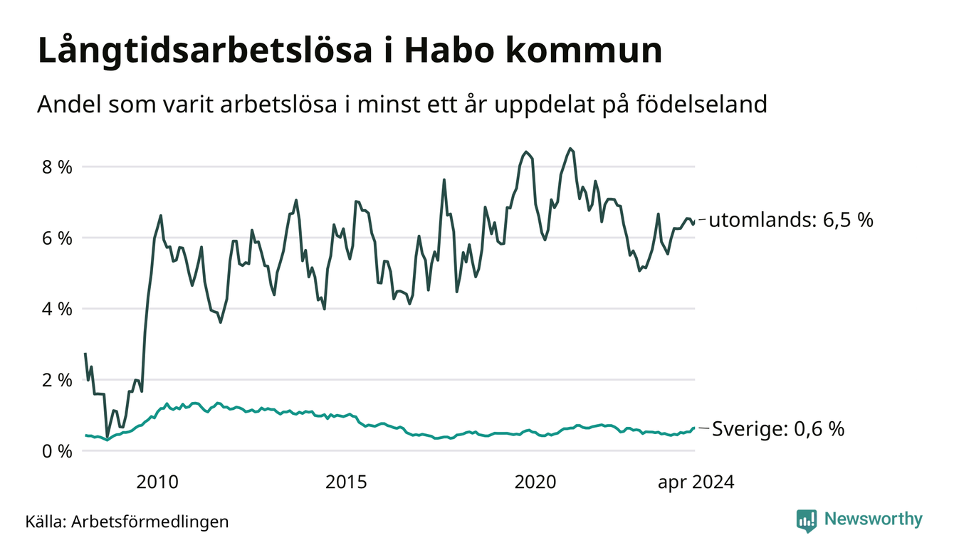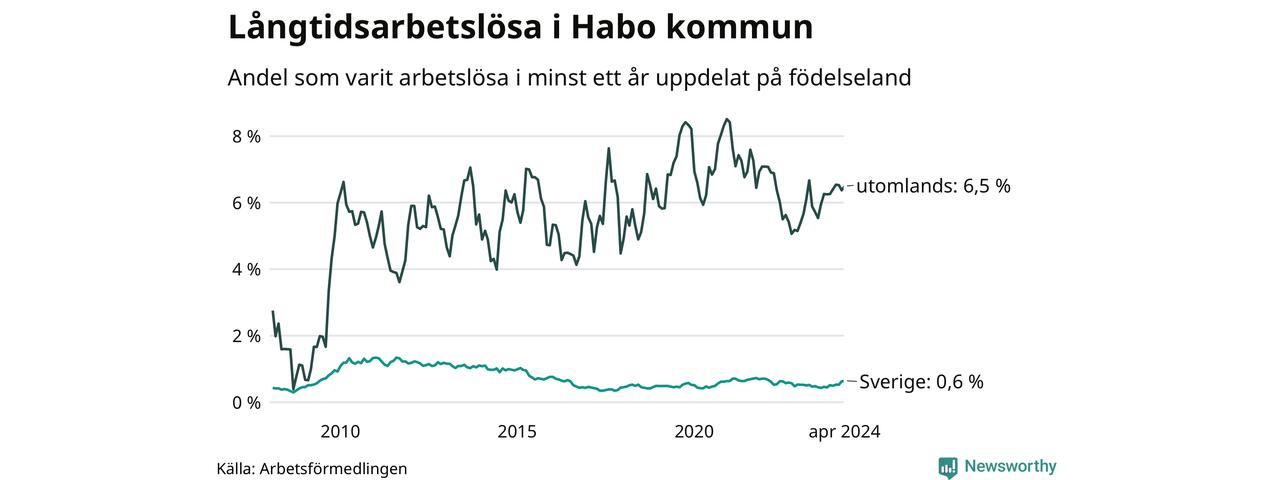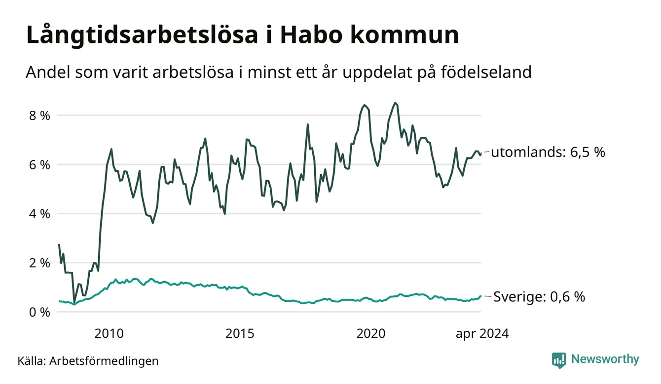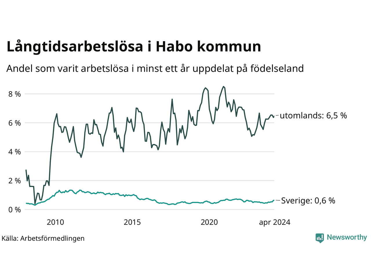 38 av de långtidsarbetslösa i Habo är födda i Sverige, medan 44 är födda utomlands. Det innebär att långtidsarbetslösheten bland Sverigefödda är 0,6 procent, medan den är elva gånger så hög – 6,5 procent – bland födda utomlands. Även i riket som helhet är arbetslösheten högre bland utrikesfödda.