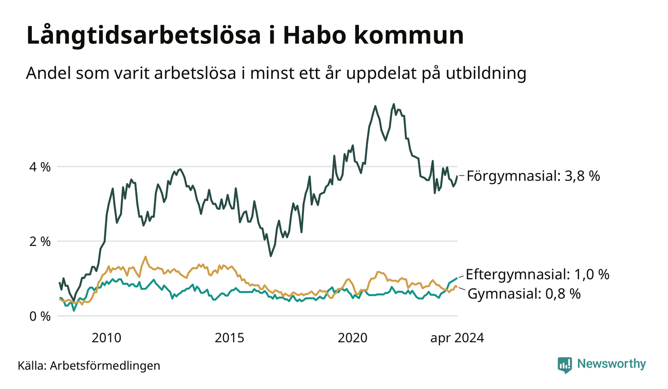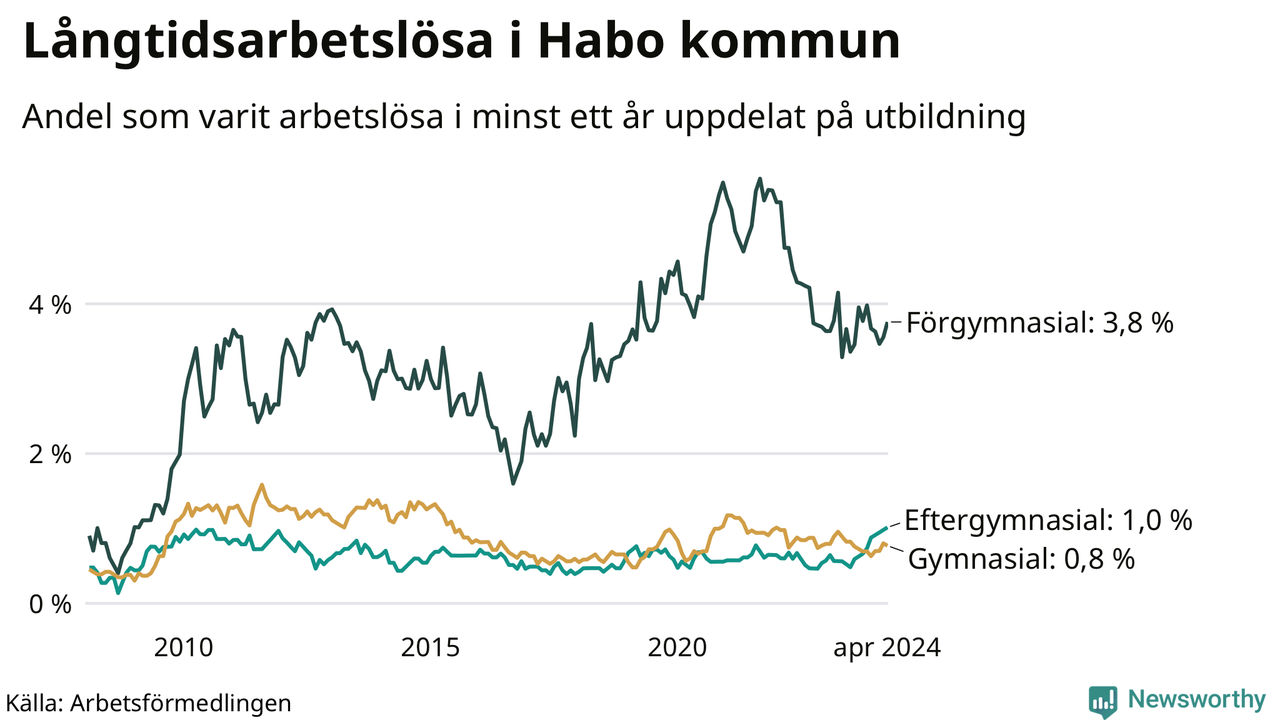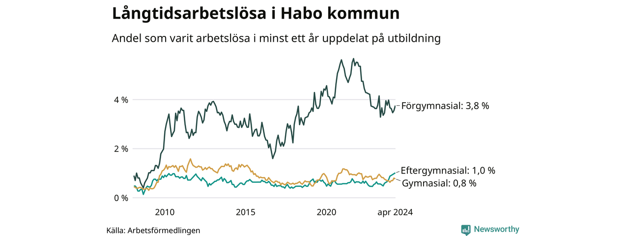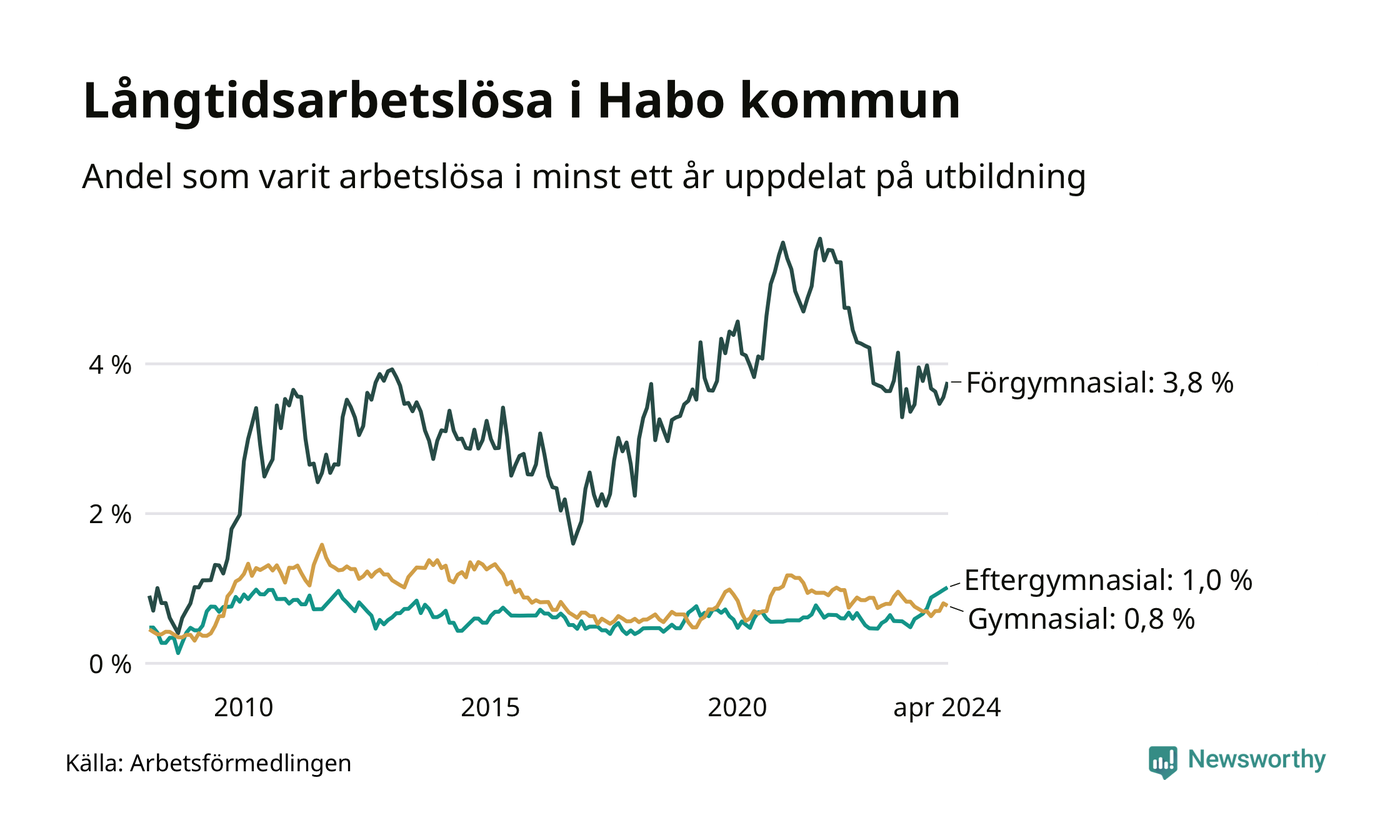 Inte sedan februari 2022 har andelen långtidsarbetslösa varit så hög i Habo. Det visar Arbetsförmedlingens senaste månadsstatistik.