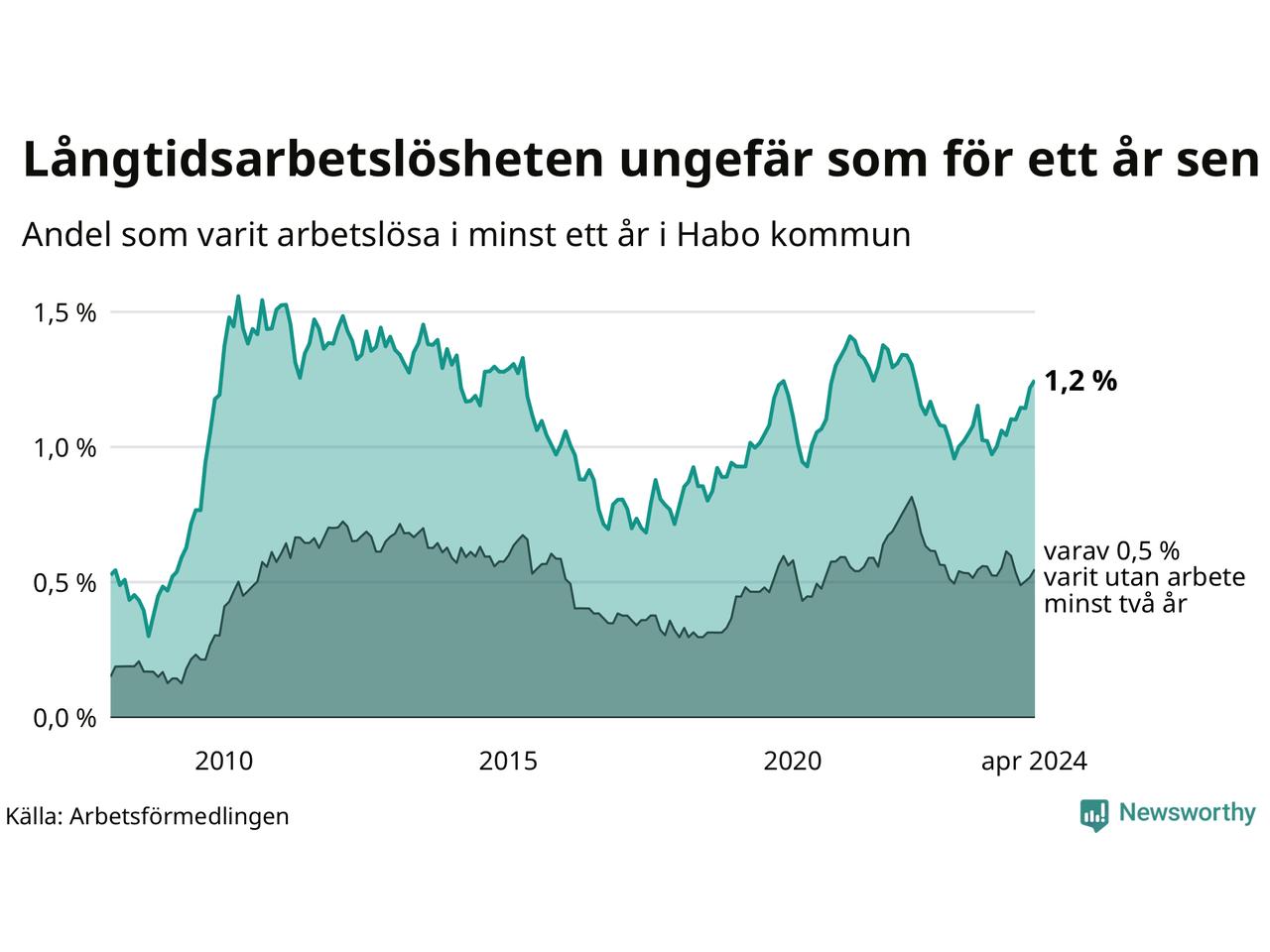 I april hade 82 Habobor varit arbetslösa i minst ett år, vilket är två fler än månaden innan. Det är den sjätte månaden i rad med ökande antal långtidsarbetslösa. 82 personer motsvarar 1,2 procent av arbetskraften i kommunen – andelen långtidsarbetslösa är ungefär på samma nivå som för ett år sedan. Habo tillhör de kommuner som har lägst andel långtidsarbetslösa i hela landet just nu.