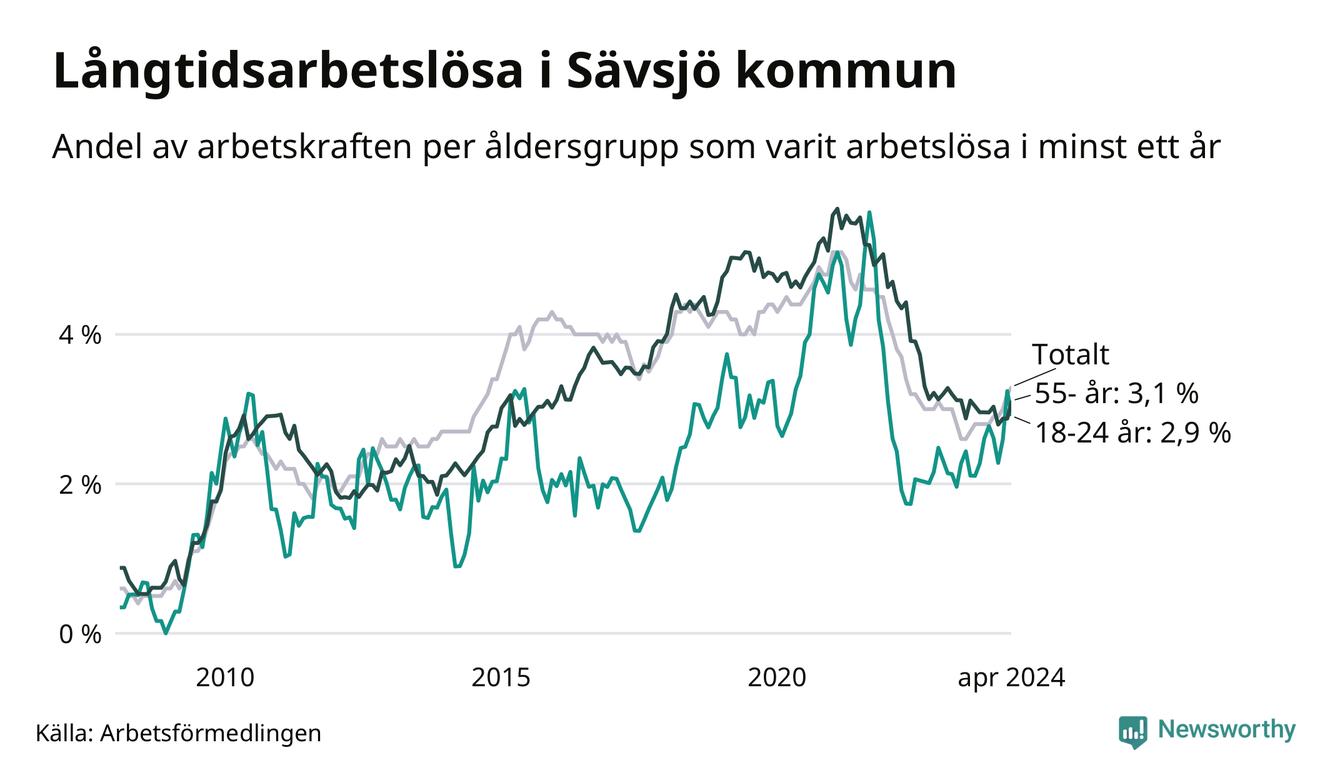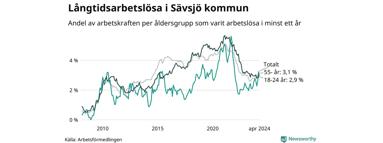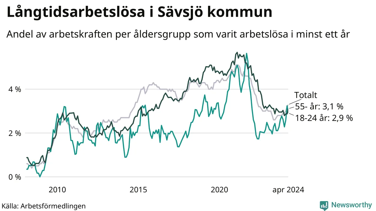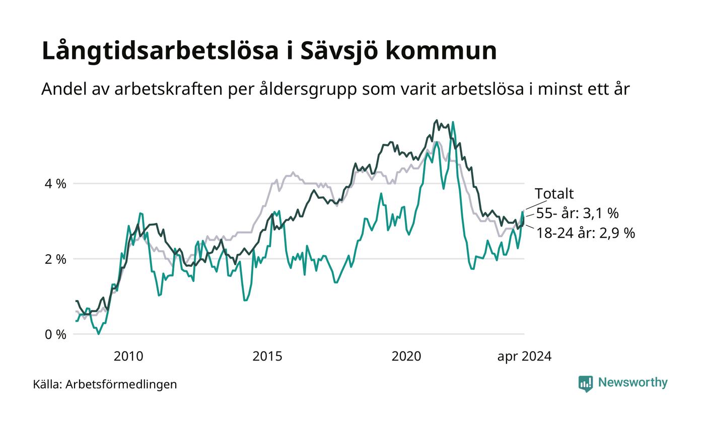 Av de 176 personerna som varit arbetslösa i mer än ett år i Sävsjö kommun är 39 personer mellan 55 och 651 år och 18 är mellan 18 och 24 år. Som andel av arbetskraften innebär det att långtidsarbetslöheten är lägre i de båda grupperna än i arbetskraften totalt. I riket som helhet är andelen långtidsarbetslösa högre i den äldre gruppen.