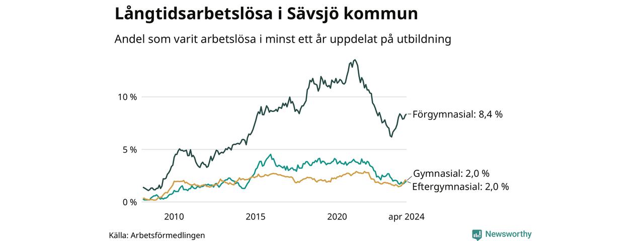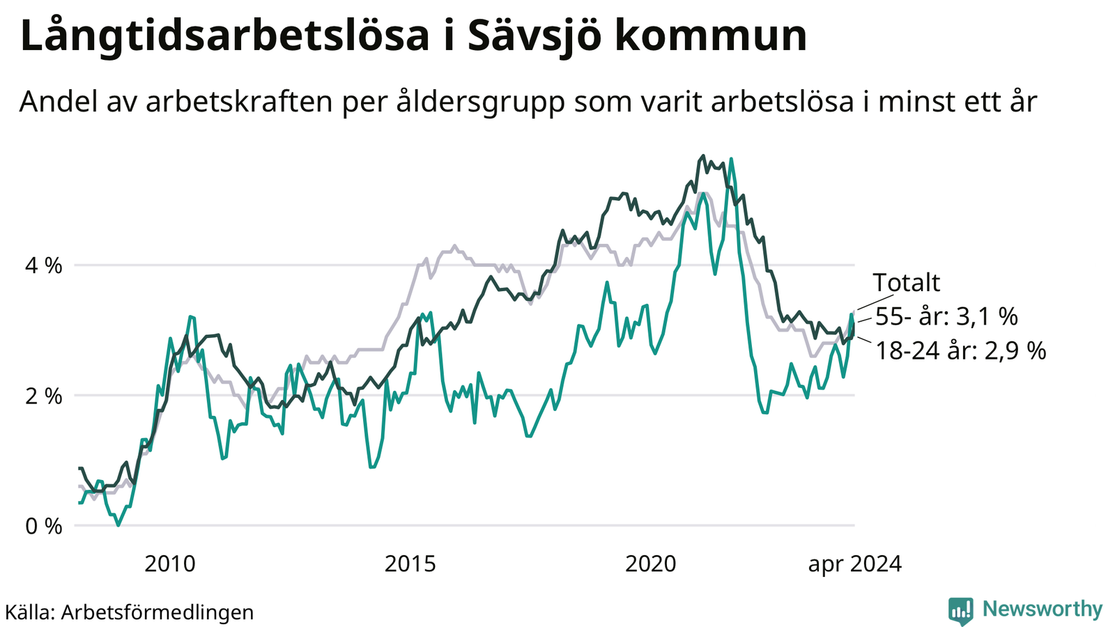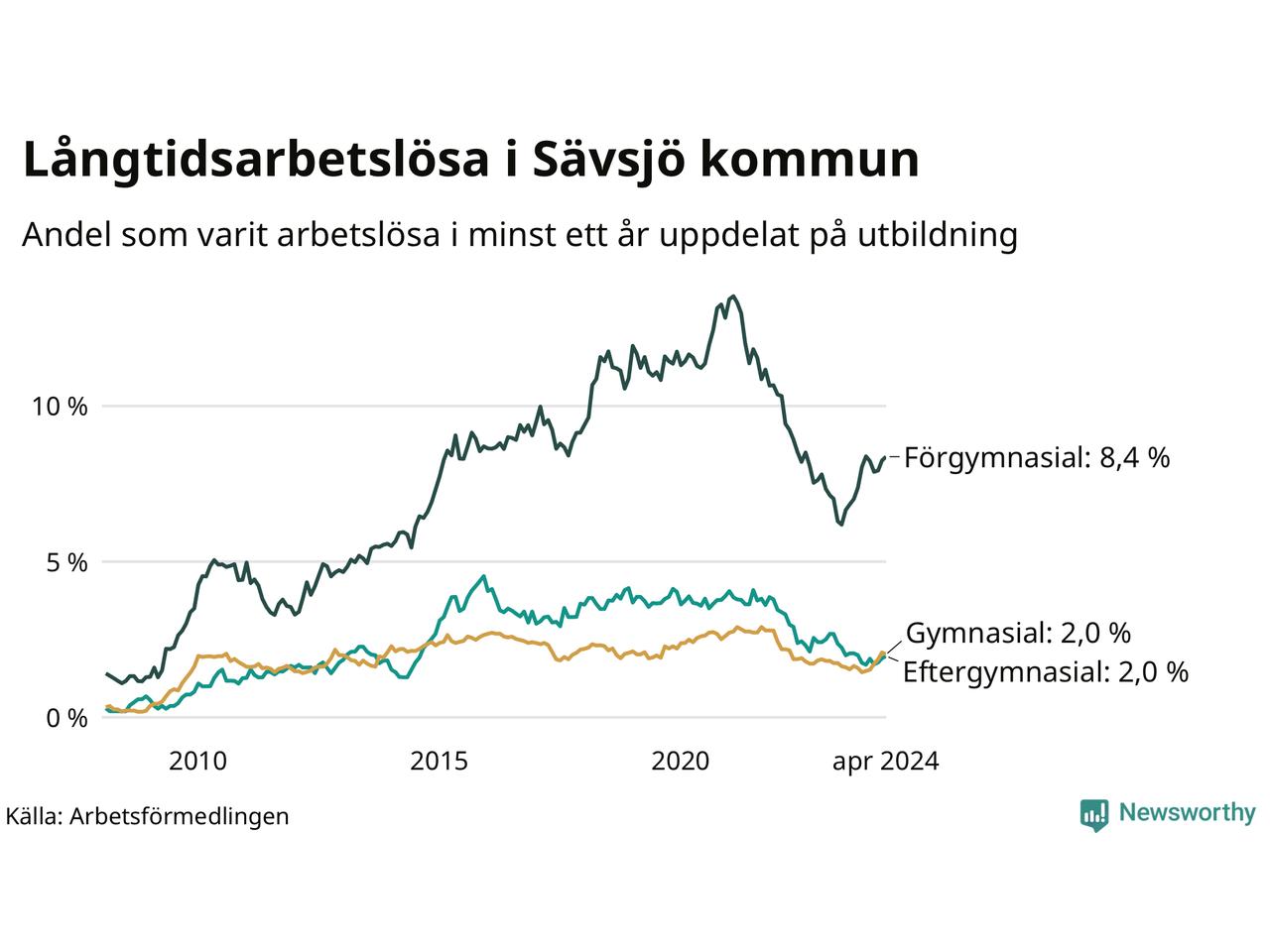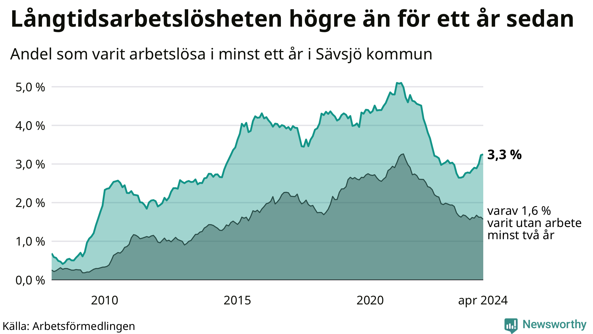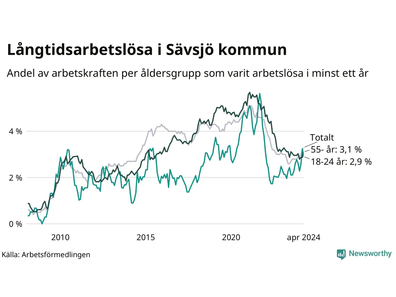 I april hade 176 Sävsjöbor varit arbetslösa i minst ett år, vilket är en fler än månaden innan. 176 personer motsvarar 3,3 procent av arbetskraften i kommunen – andelen långtidsarbetslösa är 0,5 procentenheter högre än samma månad för ett år sedan.