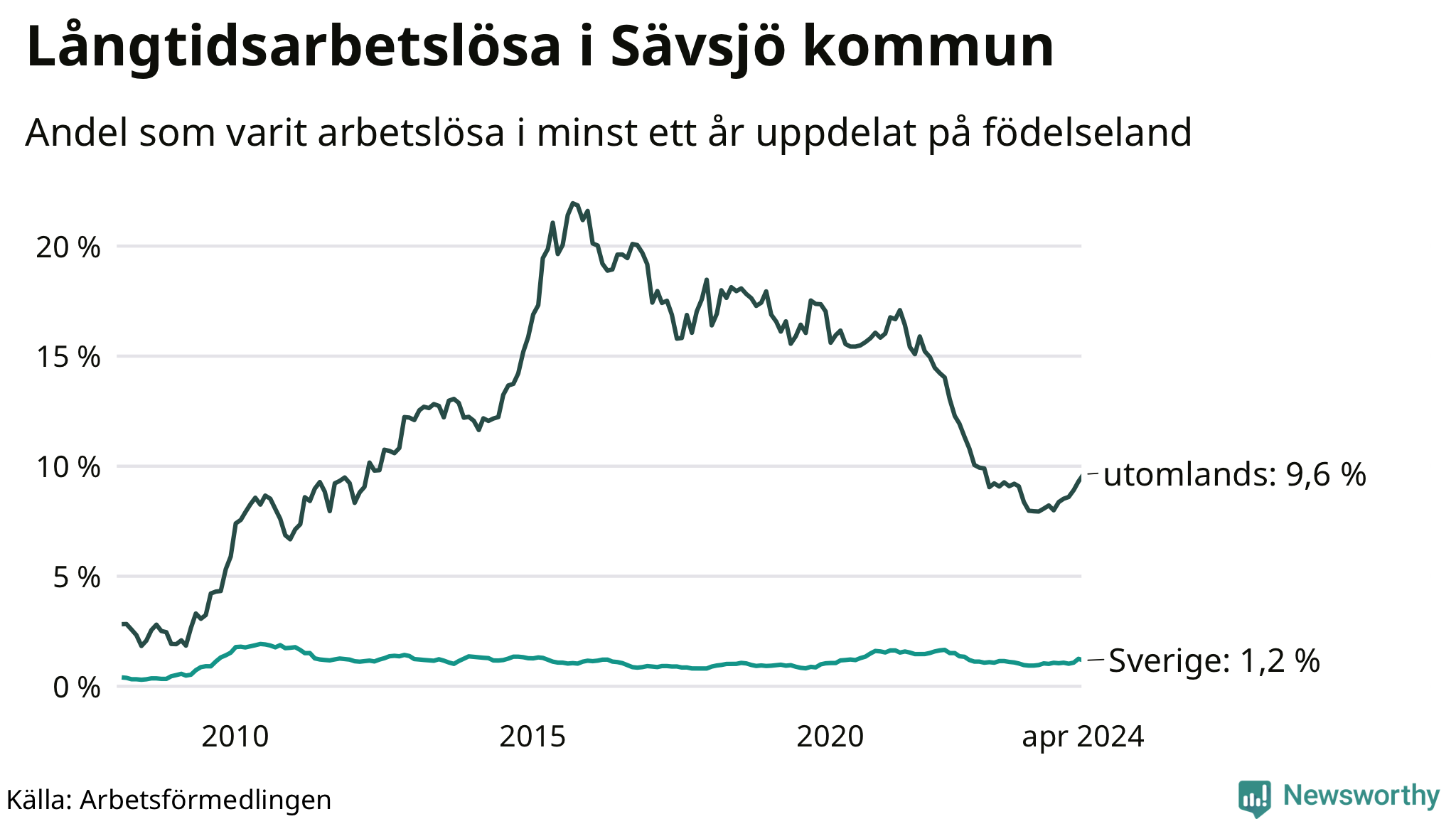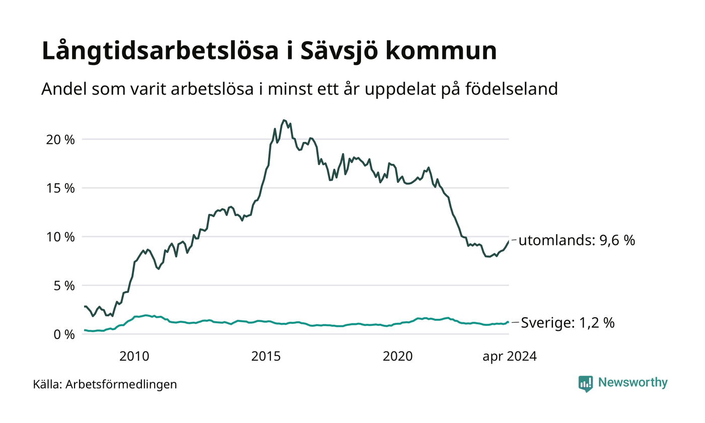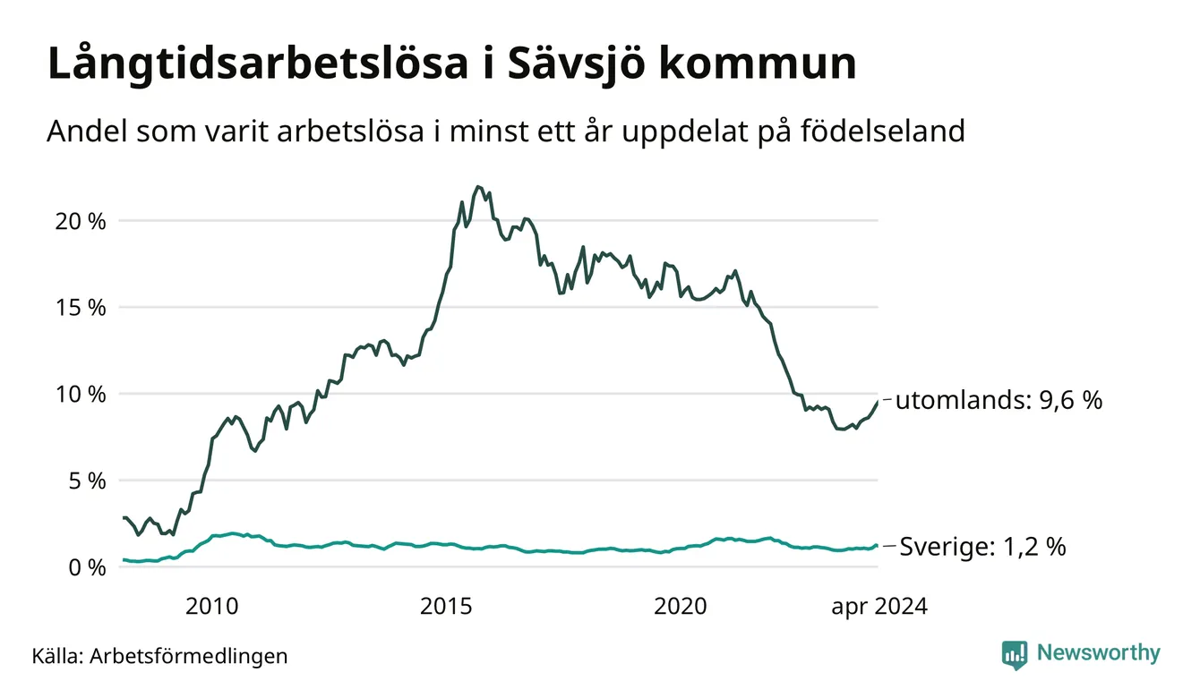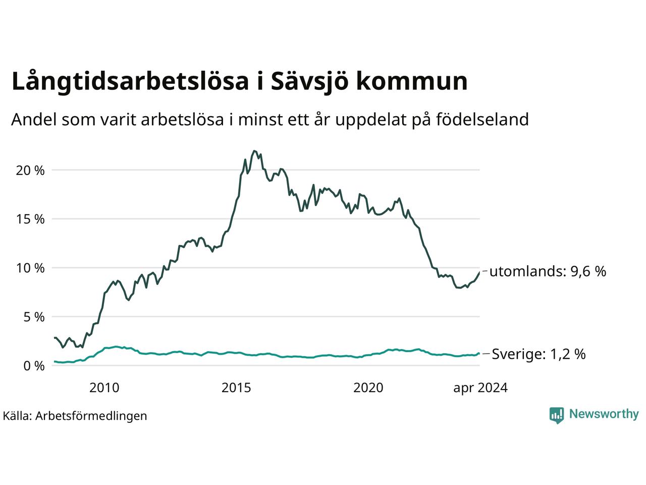 48 av de långtidsarbetslösa i Sävsjö är födda i Sverige, medan 128 är födda utomlands. Det innebär att långtidsarbetslösheten bland Sverigefödda är 1,2 procent, medan den är åtta gånger så hög – 9,6 procent – bland födda utomlands. Även i riket som helhet är arbetslösheten högre bland utrikesfödda.