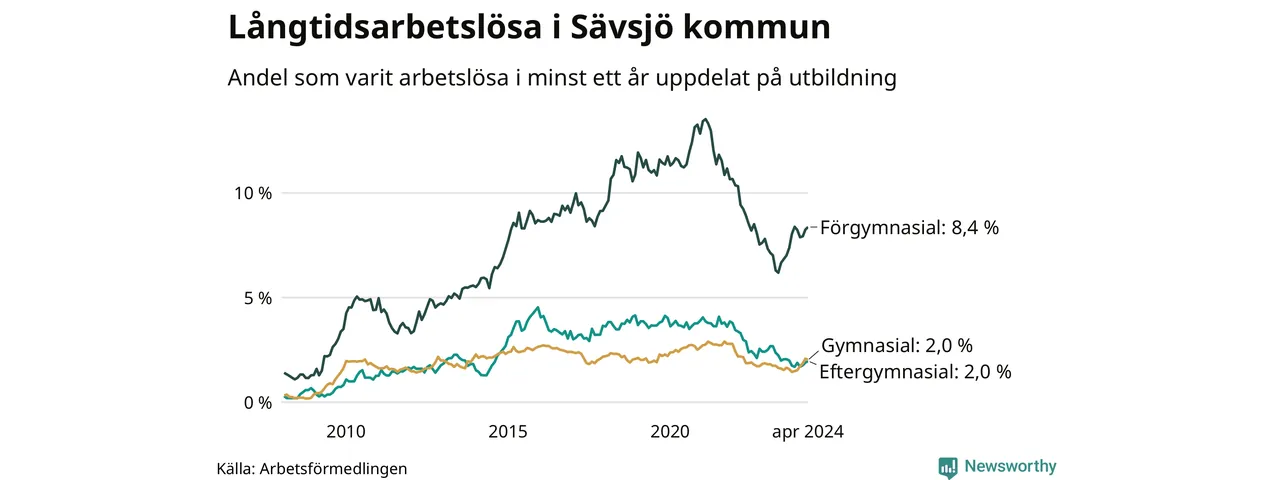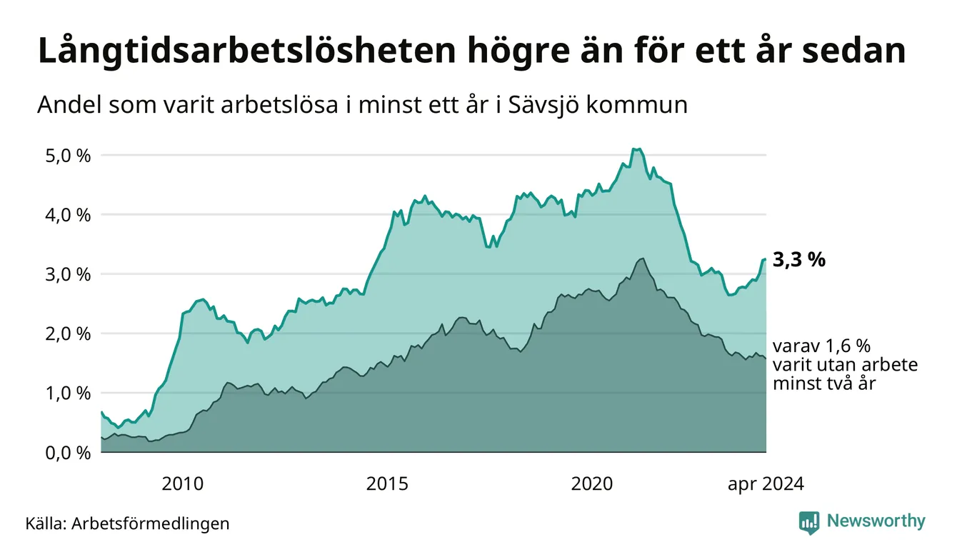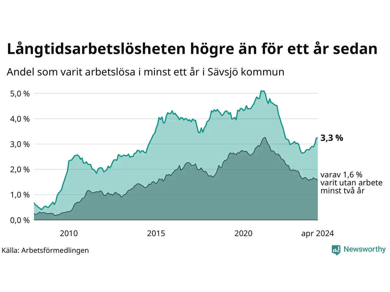 Andelen som varit utan arbete i minst ett år i Sävsjö var högre i april jämfört med samma månad för ett år sedan. Det visar Arbetsfömedlingens senaste månadsstatistik.