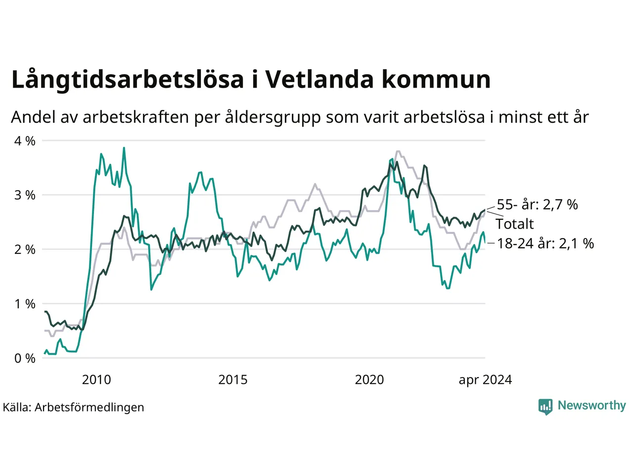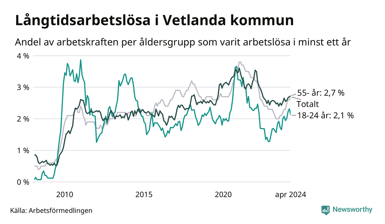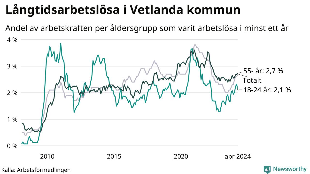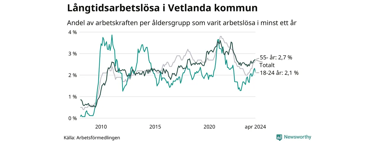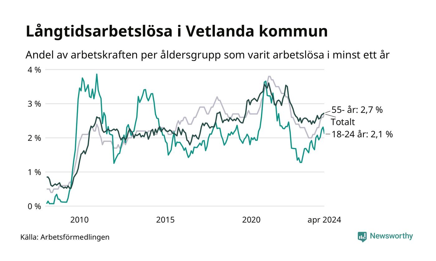 Av de 354 personerna som varit arbetslösa i mer än ett år i Vetlanda kommun är 84 personer mellan 55 och 651 år och 30 är mellan 18 och 24 år. För den äldre gruppen är andelen arbetslösa 2,7 procent medan den i den yngre gruppen är 2,1 procent. Även i riket som helhet är långtidsarbetslösheten högre i gruppen äldre.