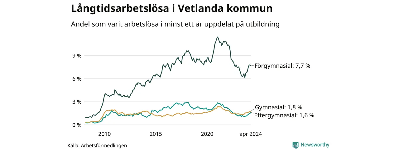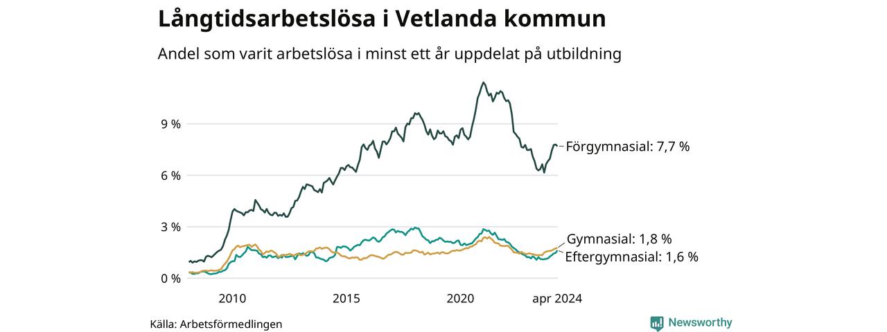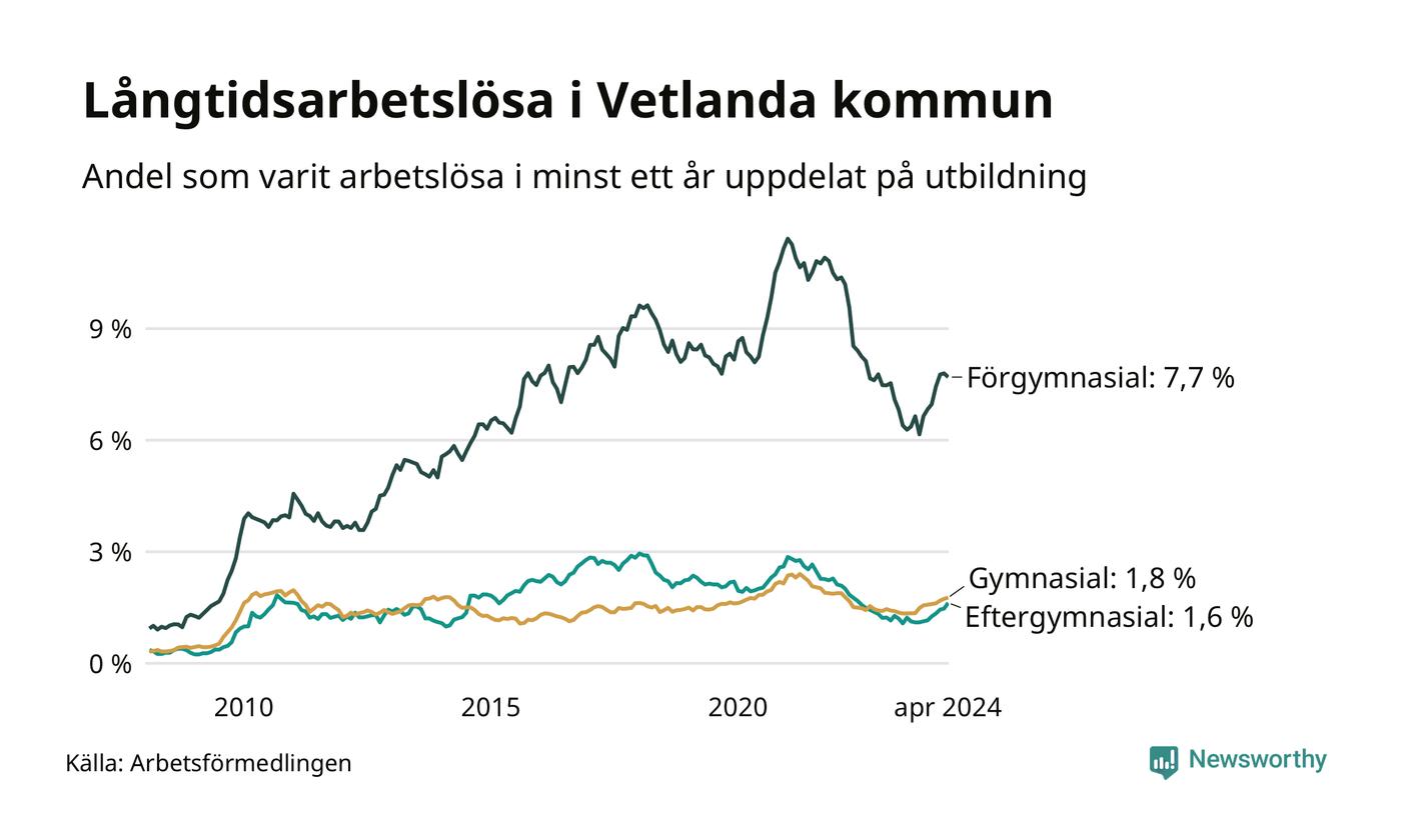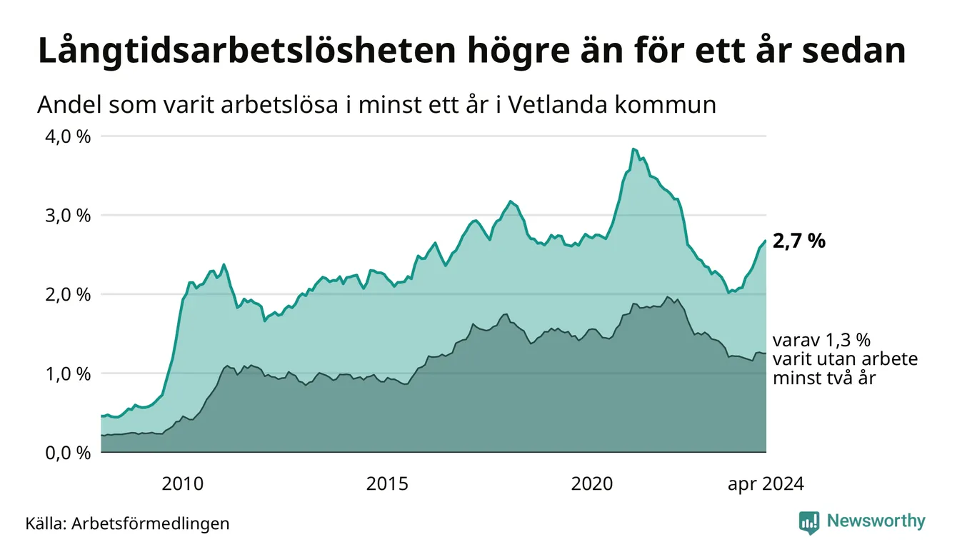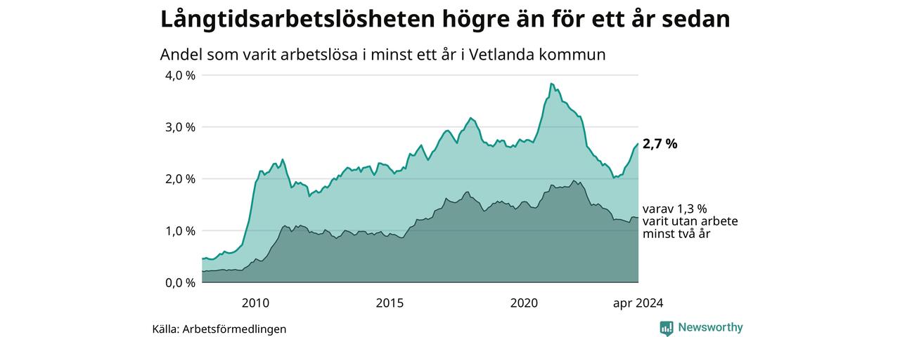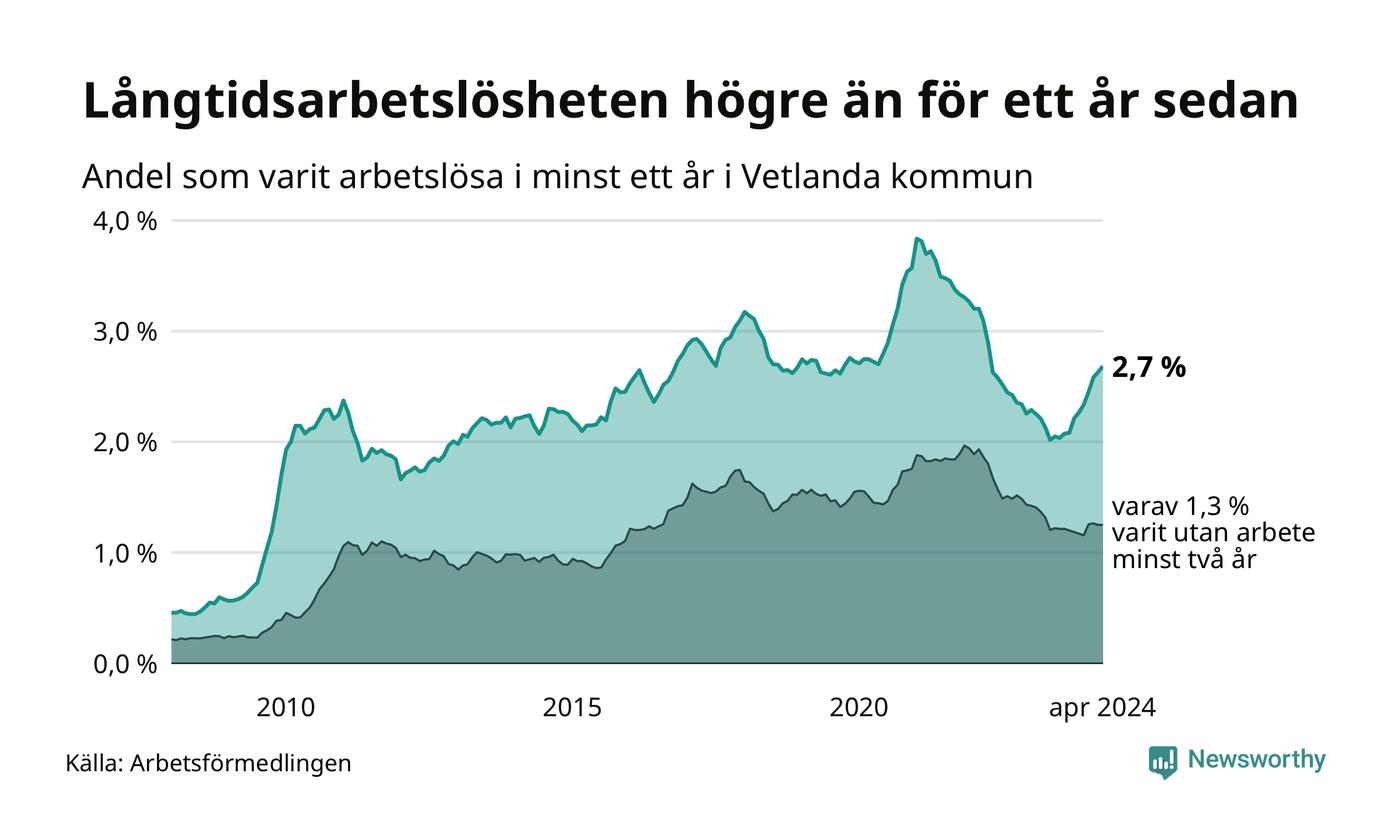 I april hade 354 Vetlandabor varit arbetslösa i minst ett år, vilket är sju fler än månaden innan. Det är den nionde månaden i rad med ökande antal långtidsarbetslösa. 354 personer motsvarar 2,7 procent av arbetskraften i kommunen – andelen långtidsarbetslösa är 0,6 procentenheter högre än samma månad för ett år sedan.