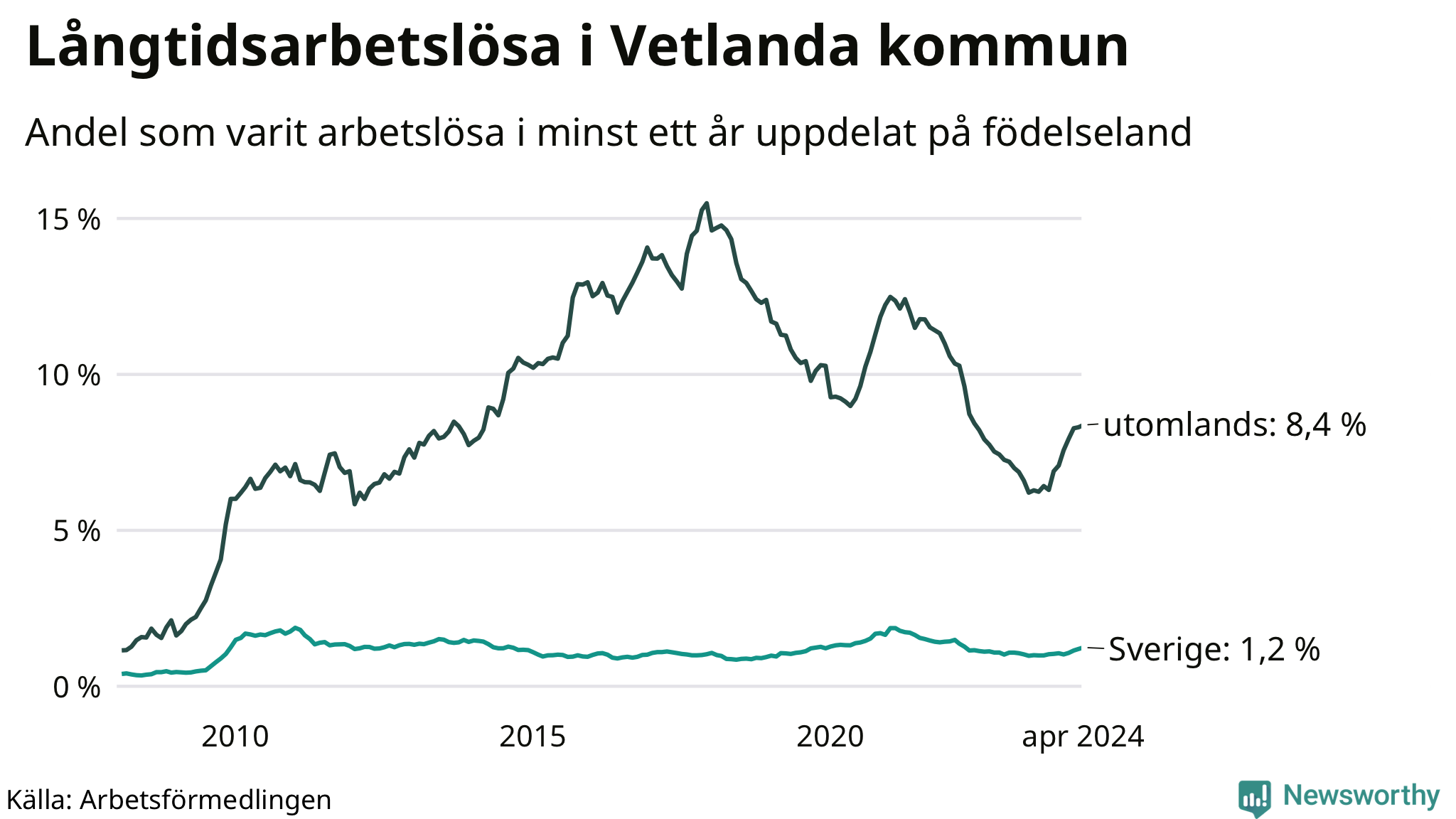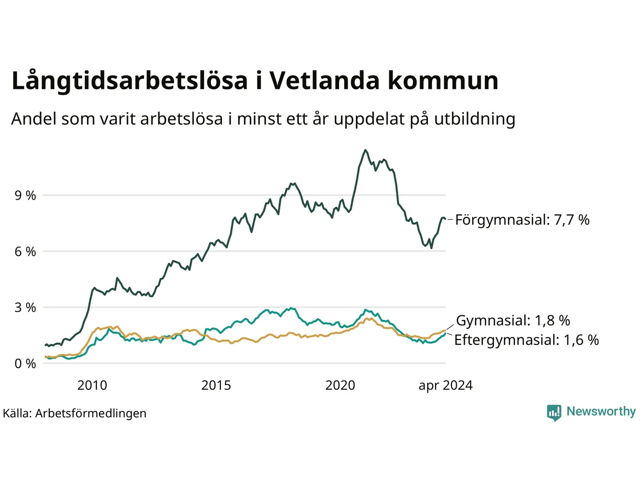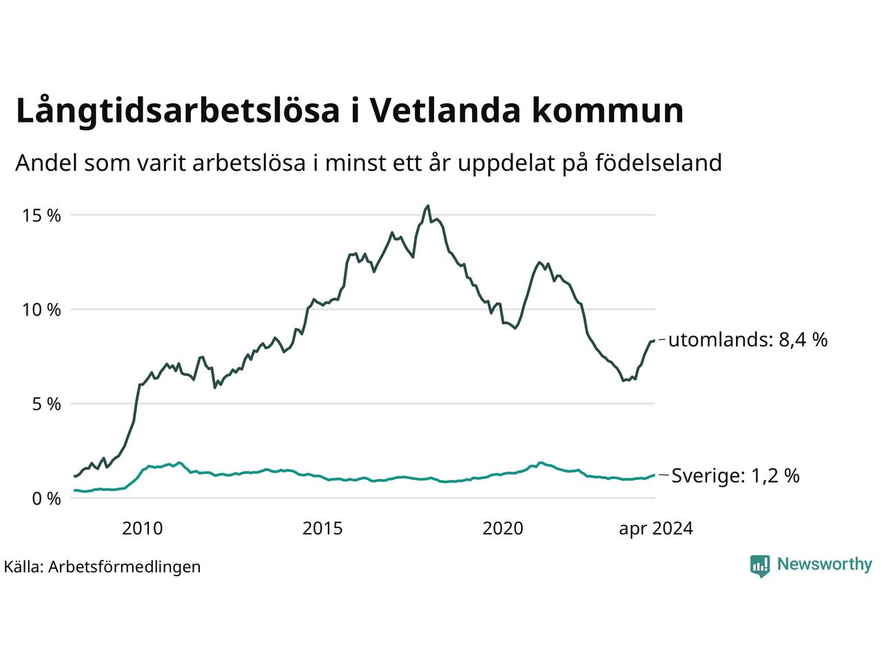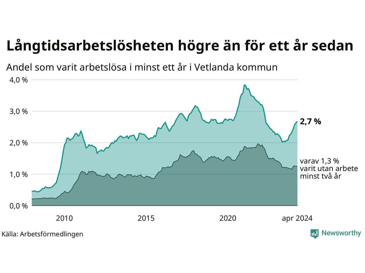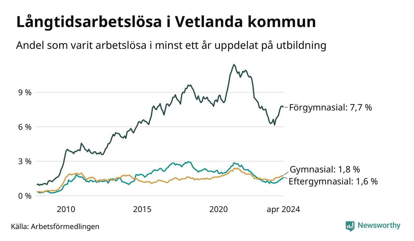 I april hade 354 Vetlandabor varit arbetslösa i minst ett år, vilket är sju fler än månaden innan. Det är den nionde månaden i rad med ökande antal långtidsarbetslösa. 354 personer motsvarar 2,7 procent av arbetskraften i kommunen – andelen långtidsarbetslösa är 0,6 procentenheter högre än samma månad för ett år sedan.