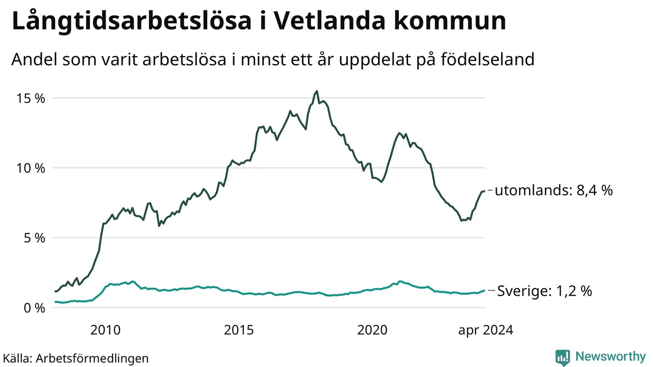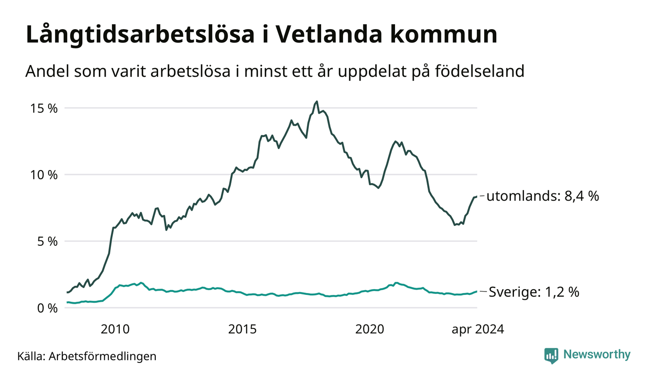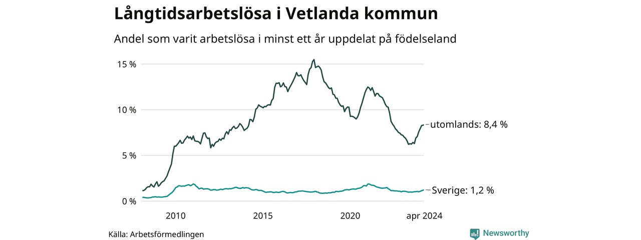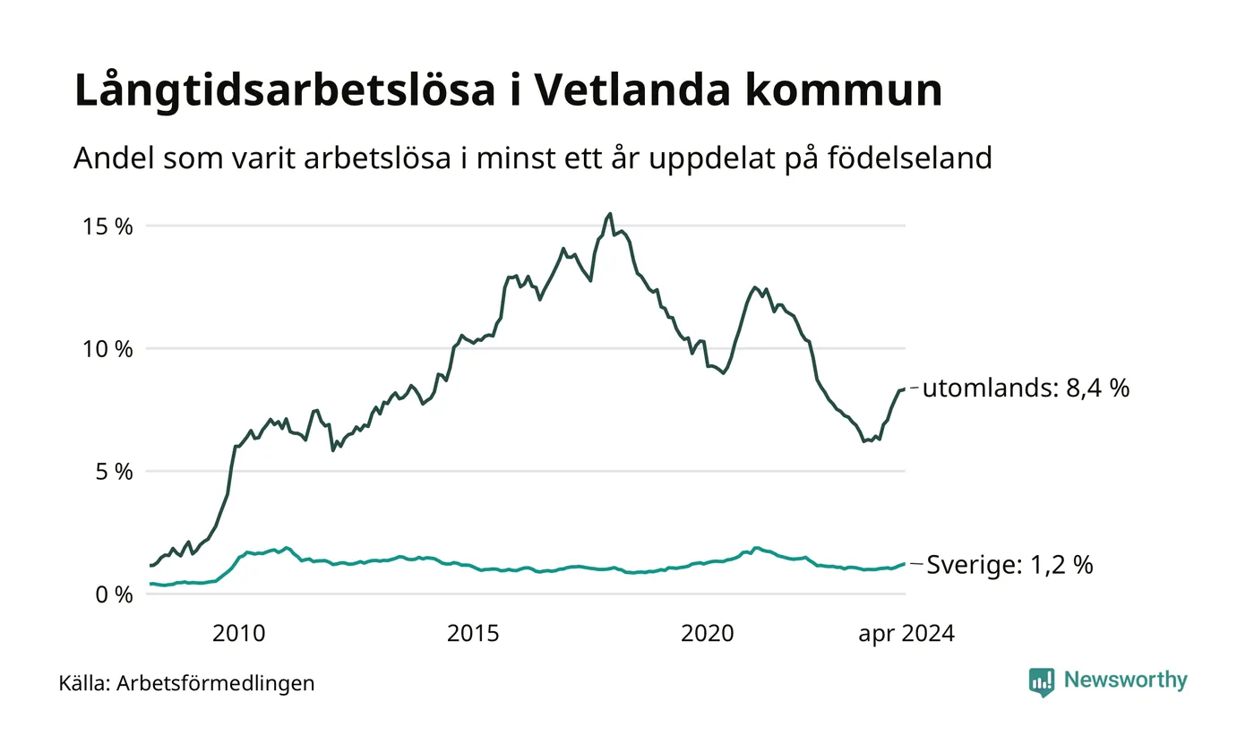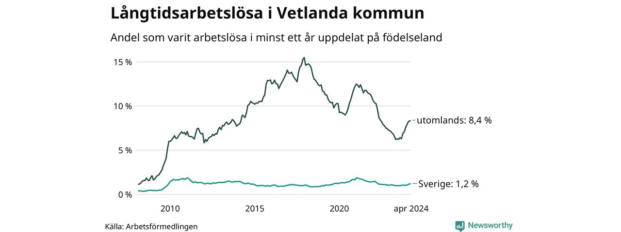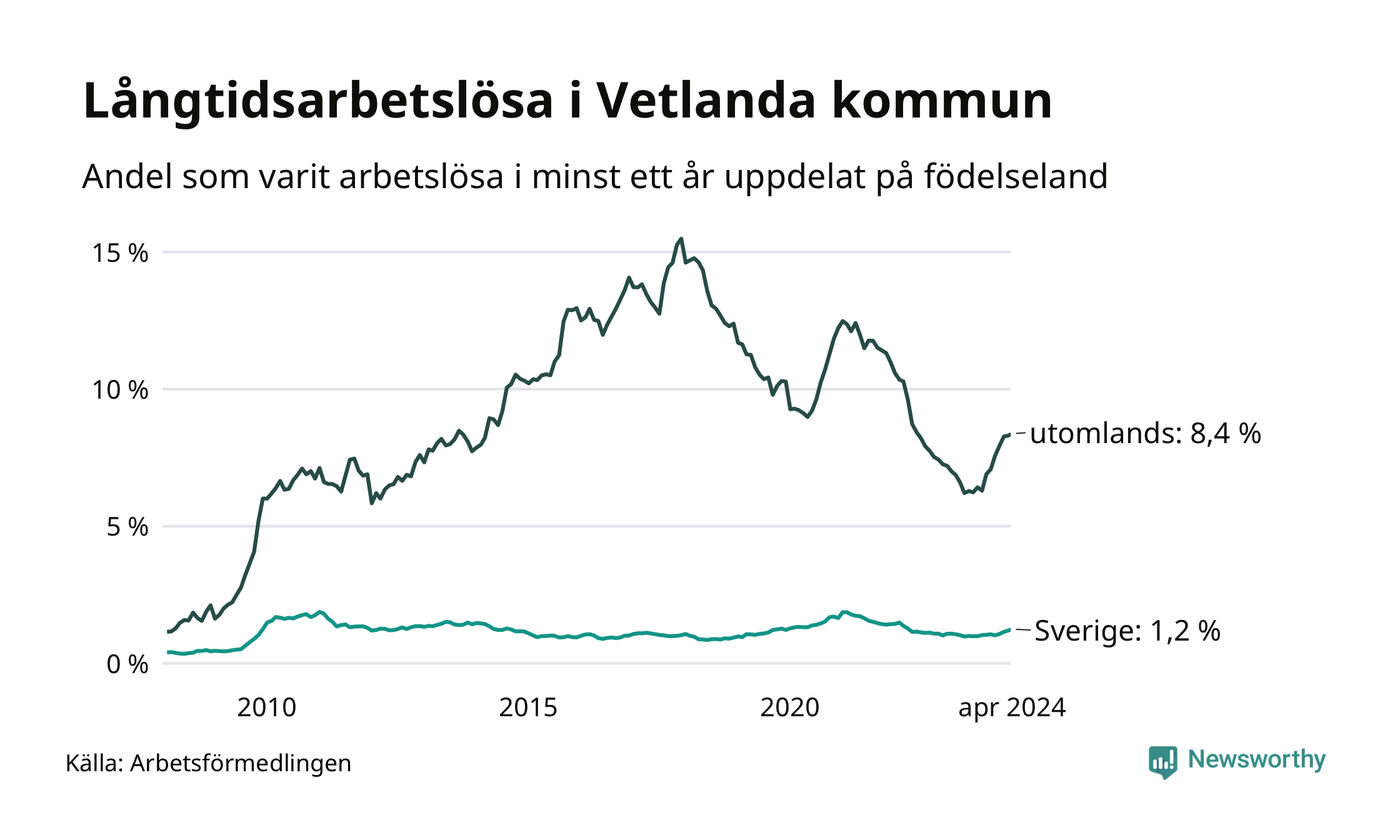 131 av de långtidsarbetslösa i Vetlanda är födda i Sverige, medan 223 är födda utomlands. Det innebär att långtidsarbetslösheten bland Sverigefödda är 1,2 procent, medan den är sju gånger så hög – 8,4 procent – bland födda utomlands. Även i riket som helhet är arbetslösheten högre bland utrikesfödda.