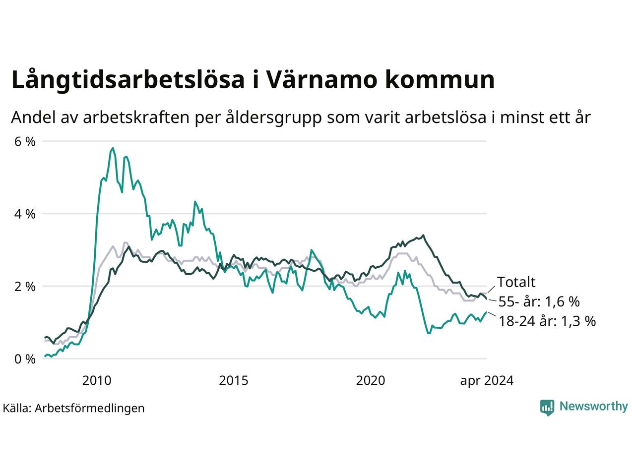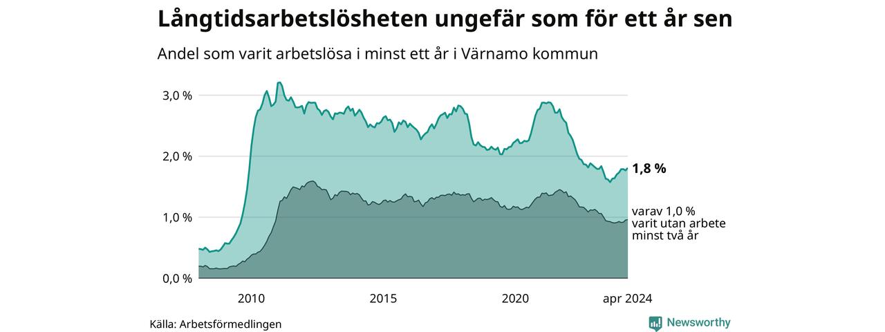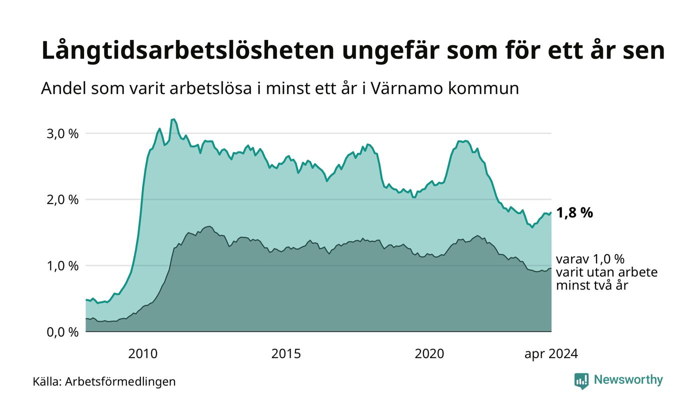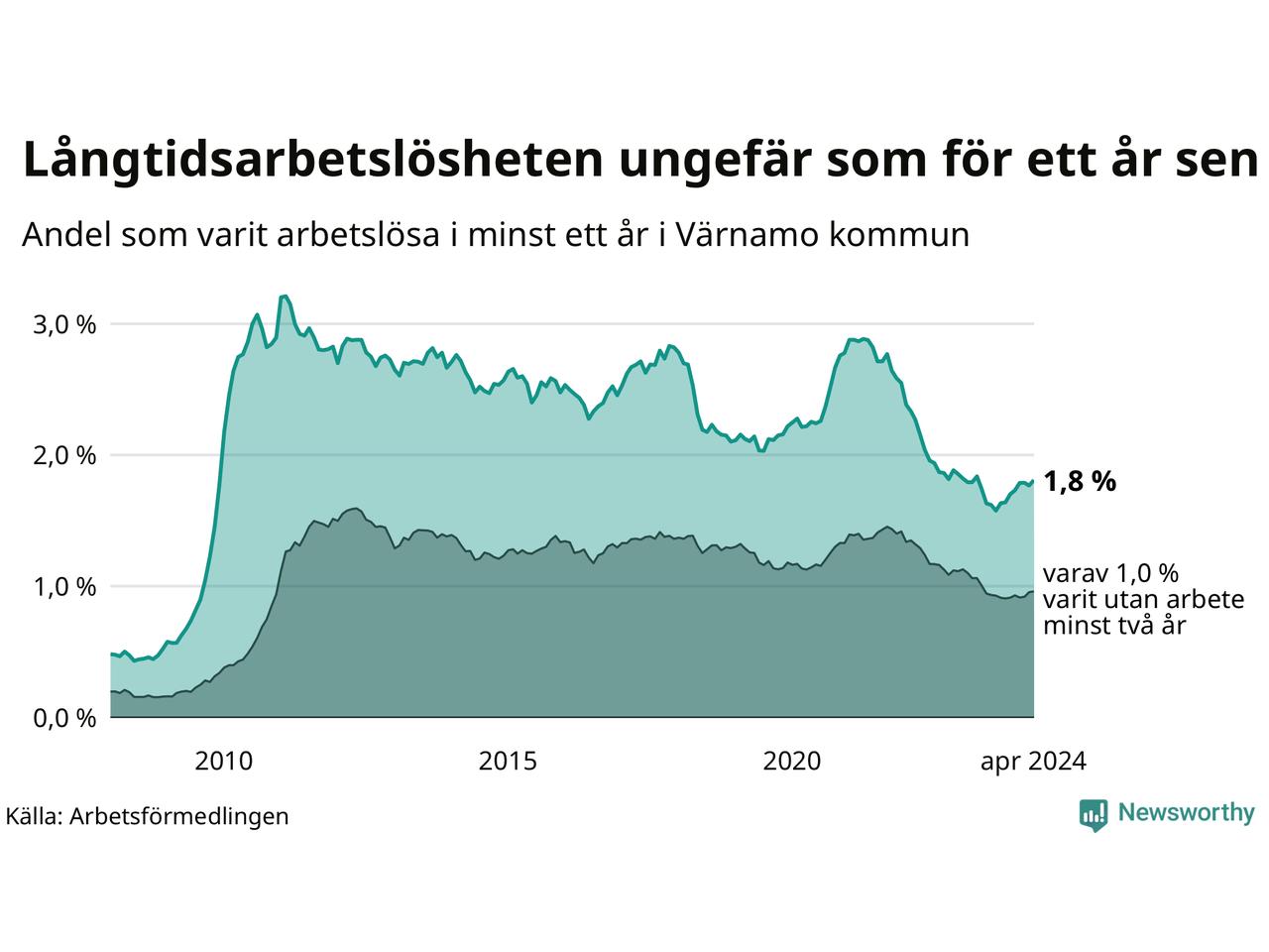 I april hade 322 Värnamobor varit arbetslösa i minst ett år, vilket är sju fler än månaden innan. 322 personer motsvarar 1,8 procent av arbetskraften i kommunen – andelen långtidsarbetslösa är ungefär på samma nivå som för ett år sedan.